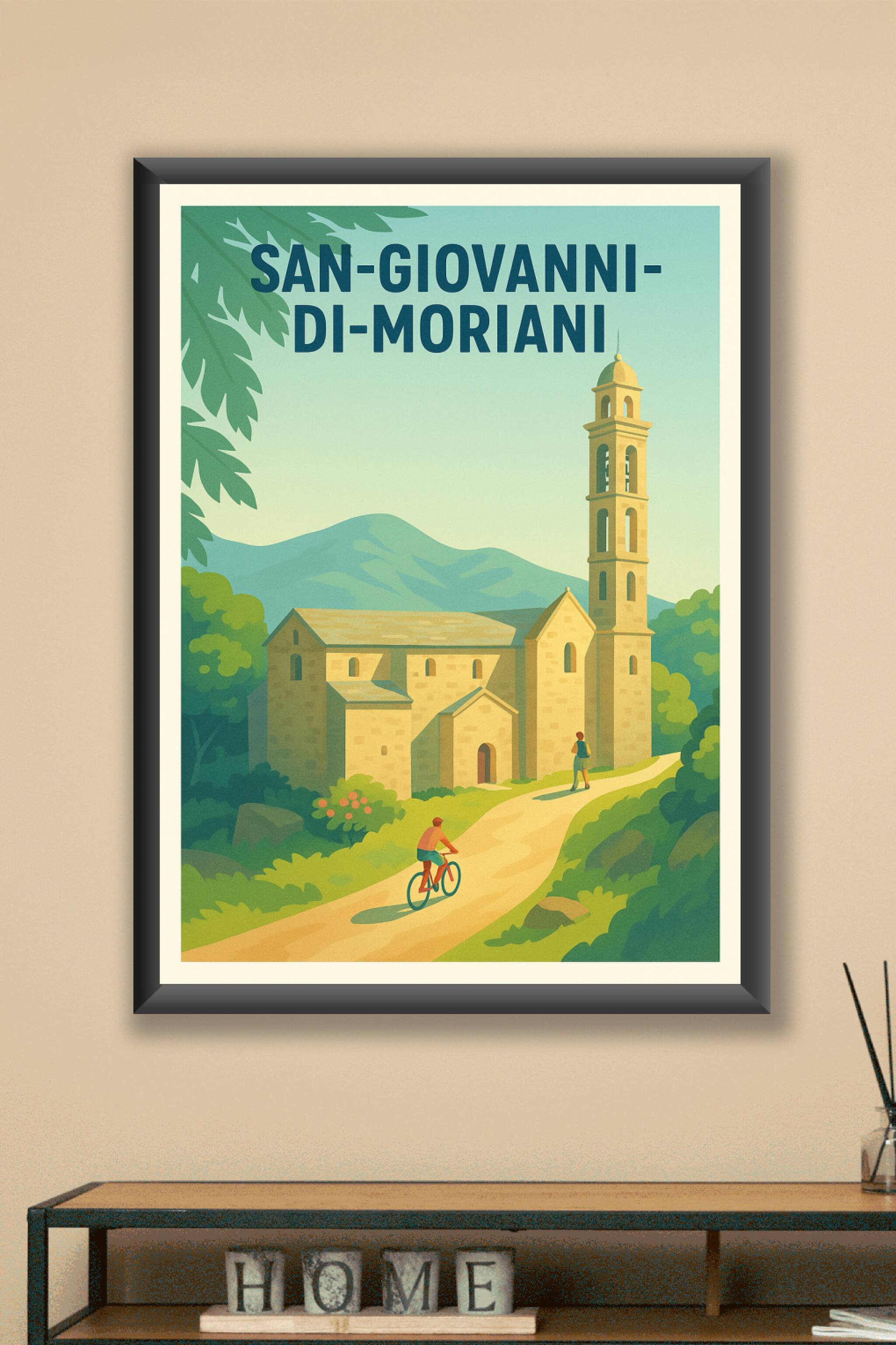 Découvrez le charme authentique de San-Giovanni-di-Moriani à travers cette affiche illustrée au style vintage évoquant la douceur de vivre en Corse...