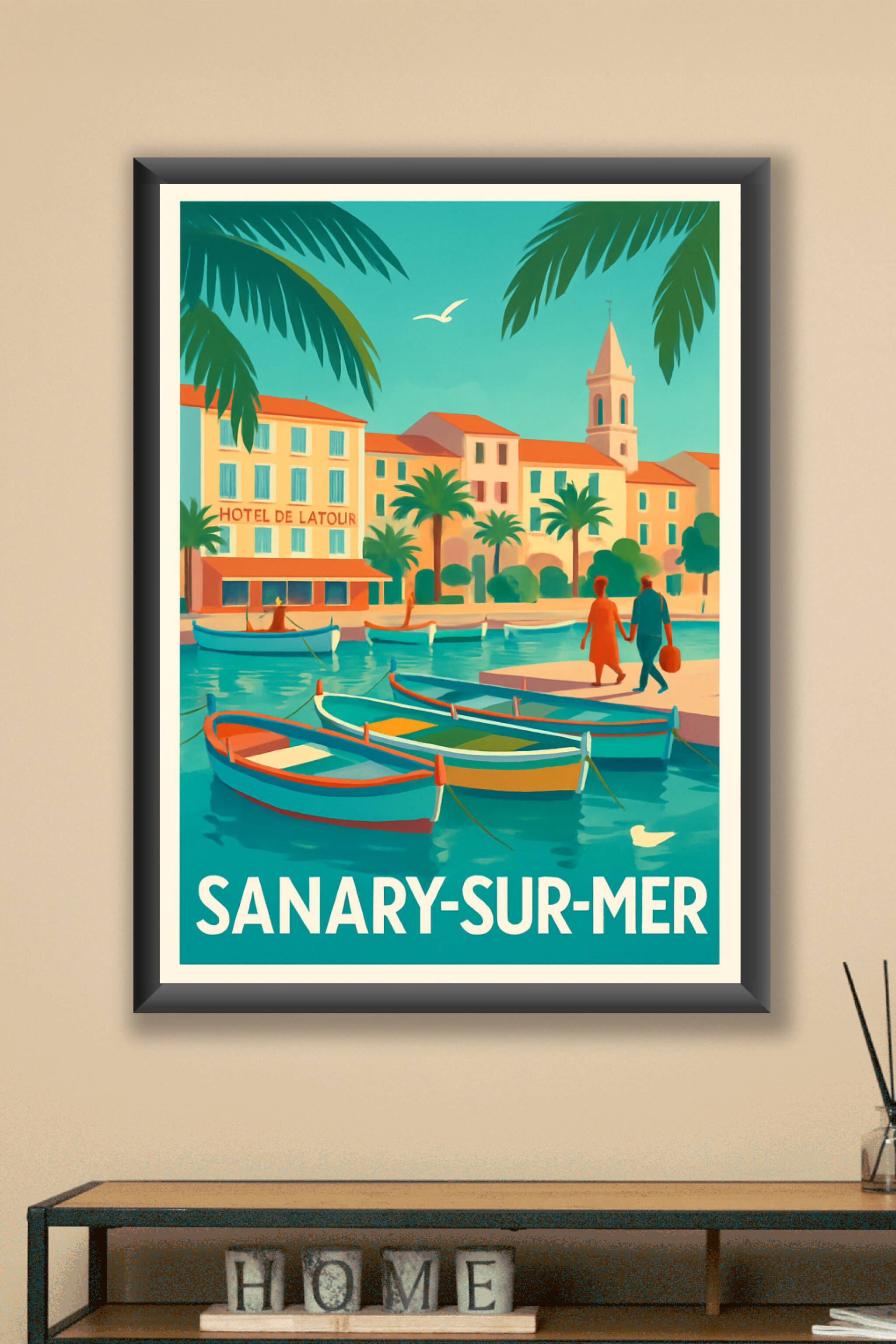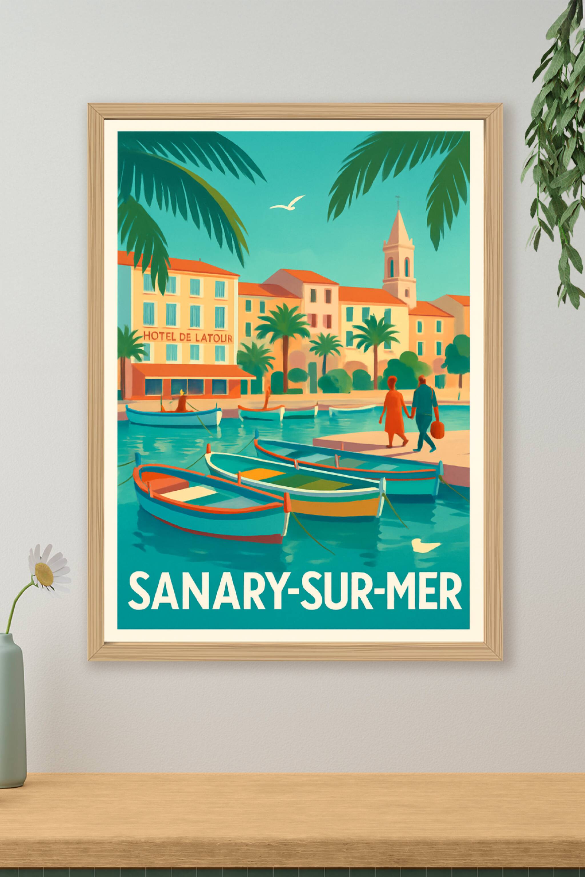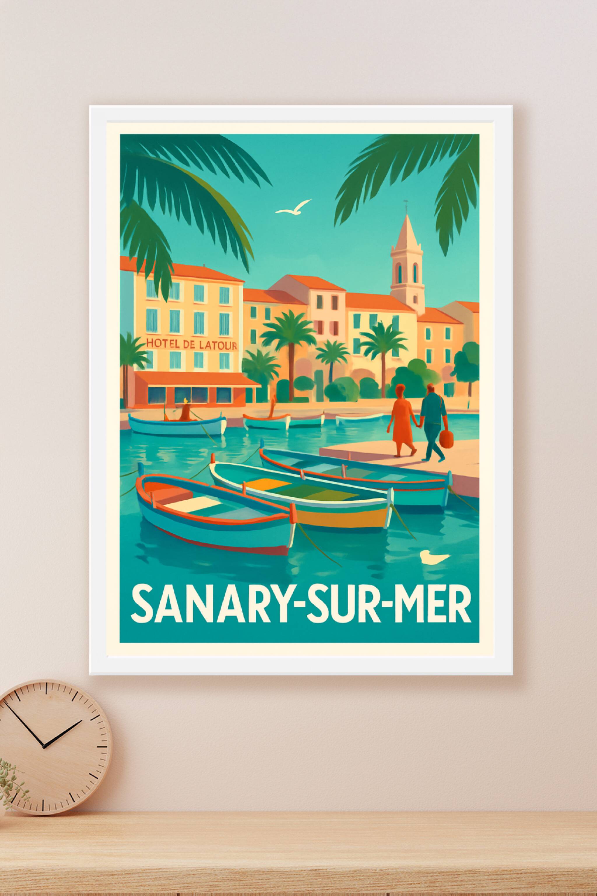 Découvrez la douceur de vivre de Sanary-sur-Mer avec cette affiche illustrée aux couleurs éclatantes et au style rétro qui met en scène les barques...