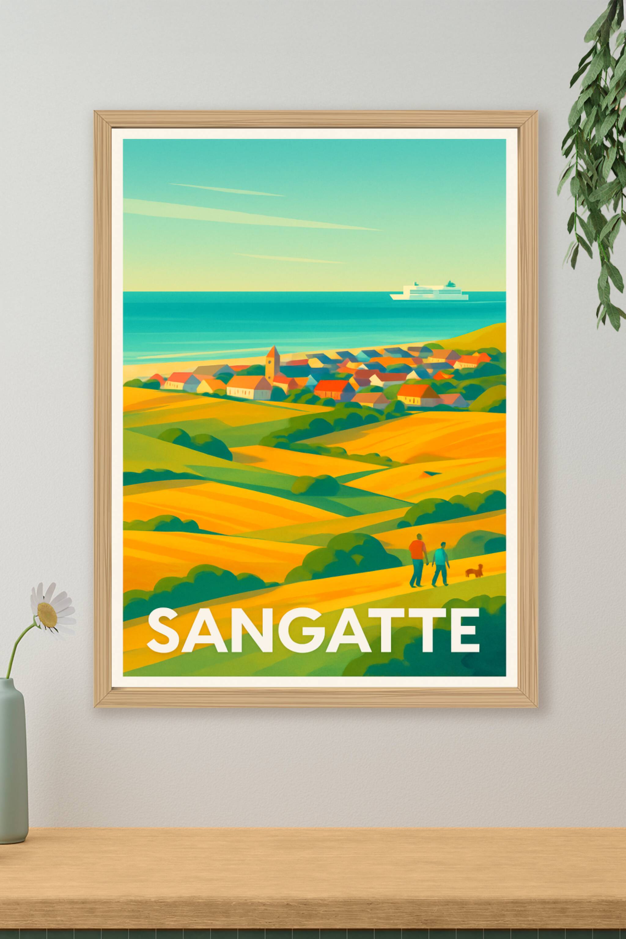 Découvrez l'affiche qui capture toute la sérénité de Sangatte, entre champs dorés et mer apaisante. Cette illustration poétique met en scène un vil...