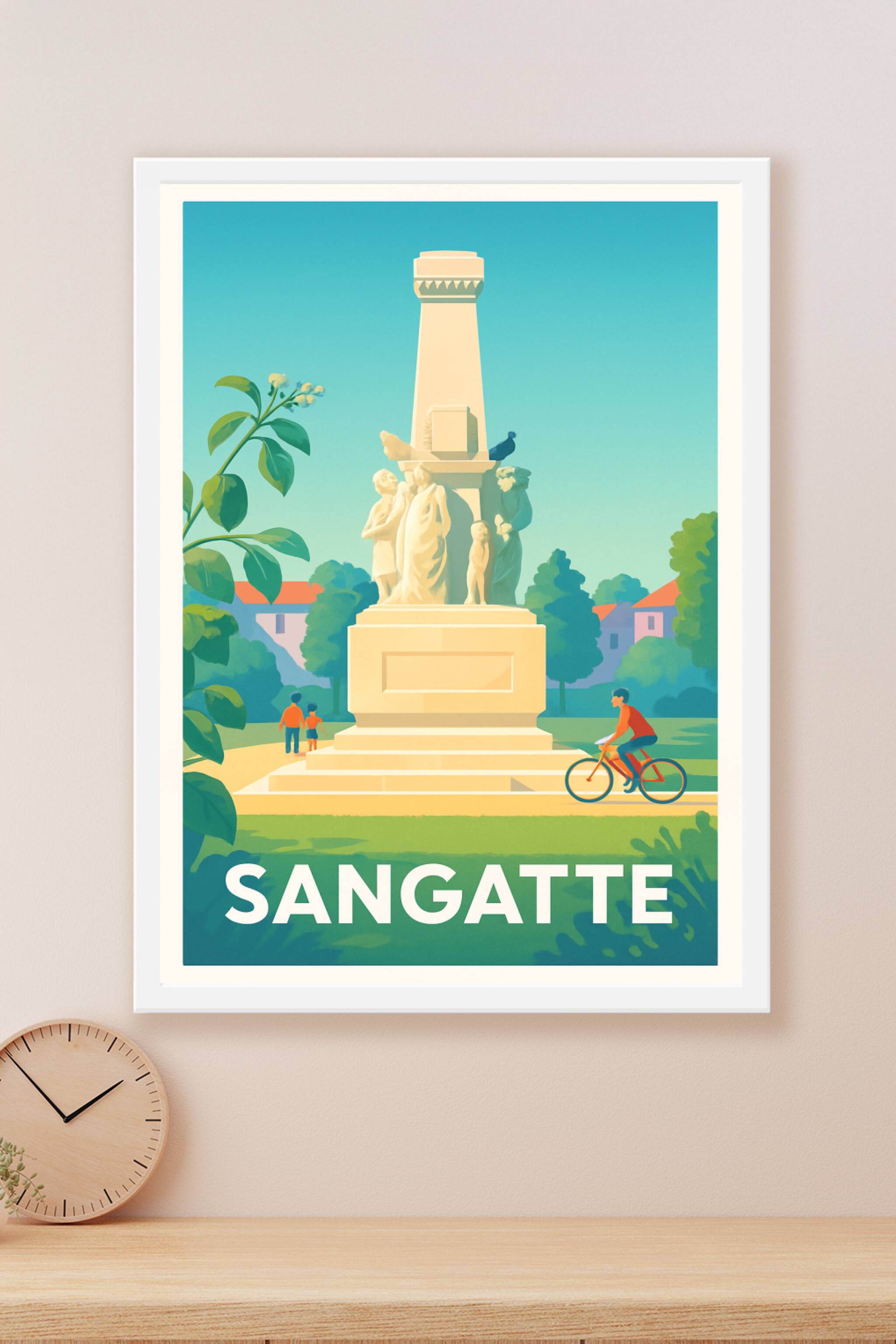 Découvrez cette superbe affiche illustrée représentant un monument emblématique de Sangatte, baigné par une lumière douce et un ciel bleu éclatant....