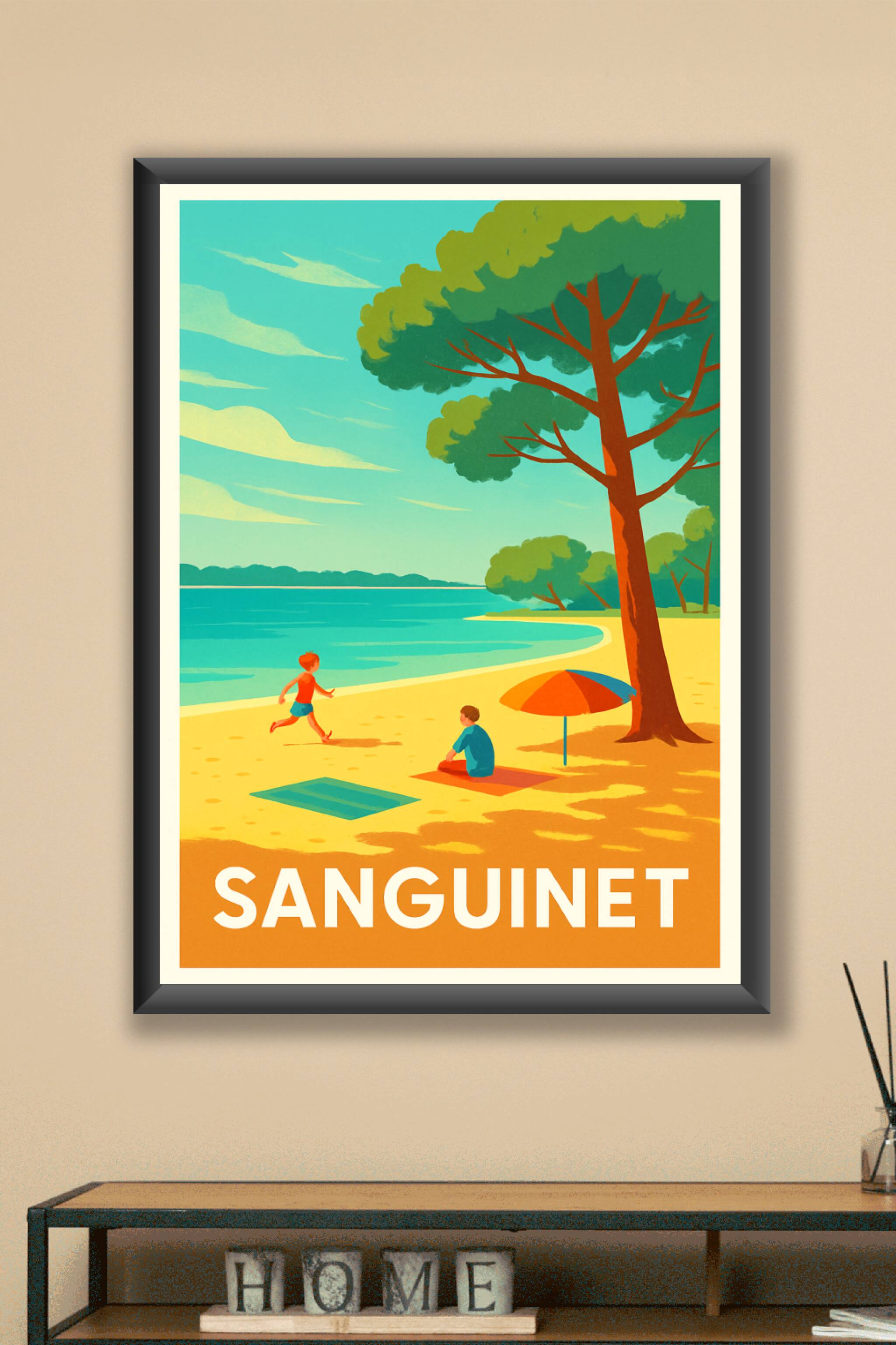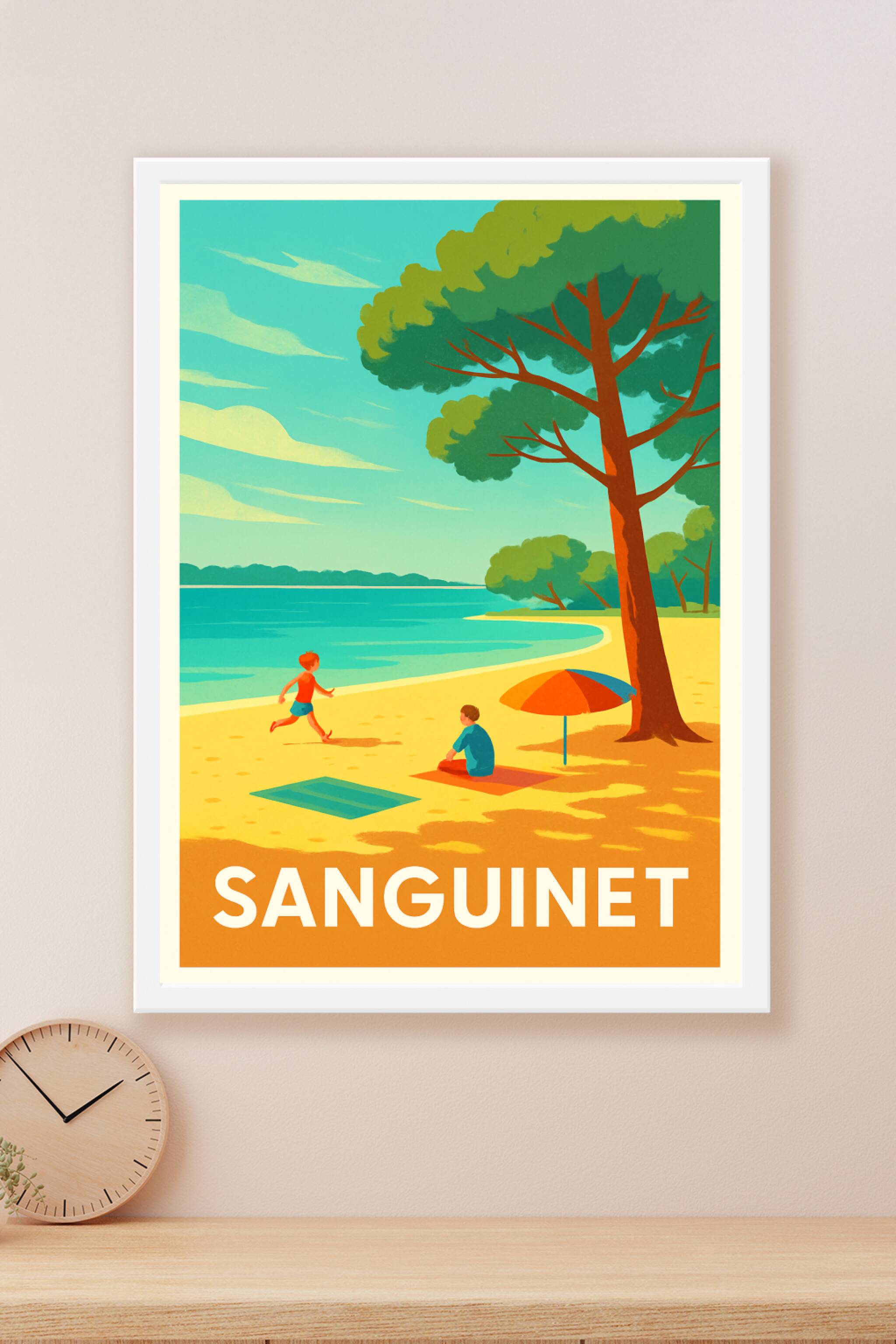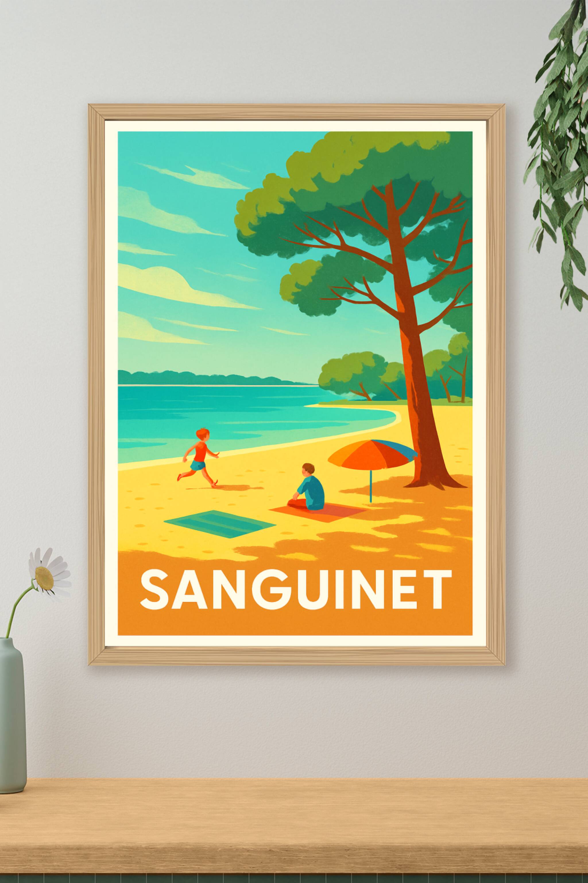 Découvrez la sérénité du littoral de Sanguinet avec cette affiche illustrant une plage baignade de lumière et de douceur. Idéale pour inviter une a...