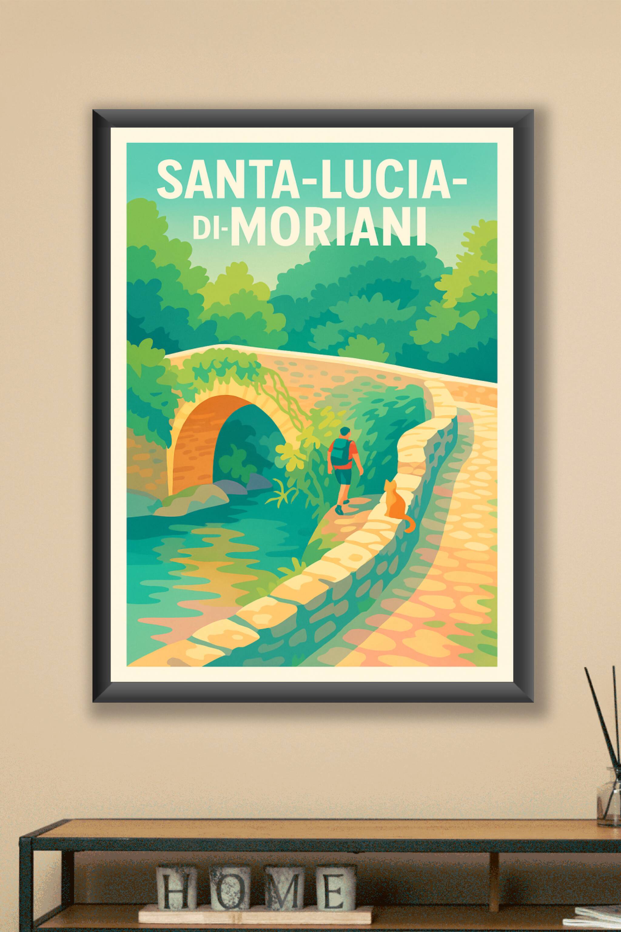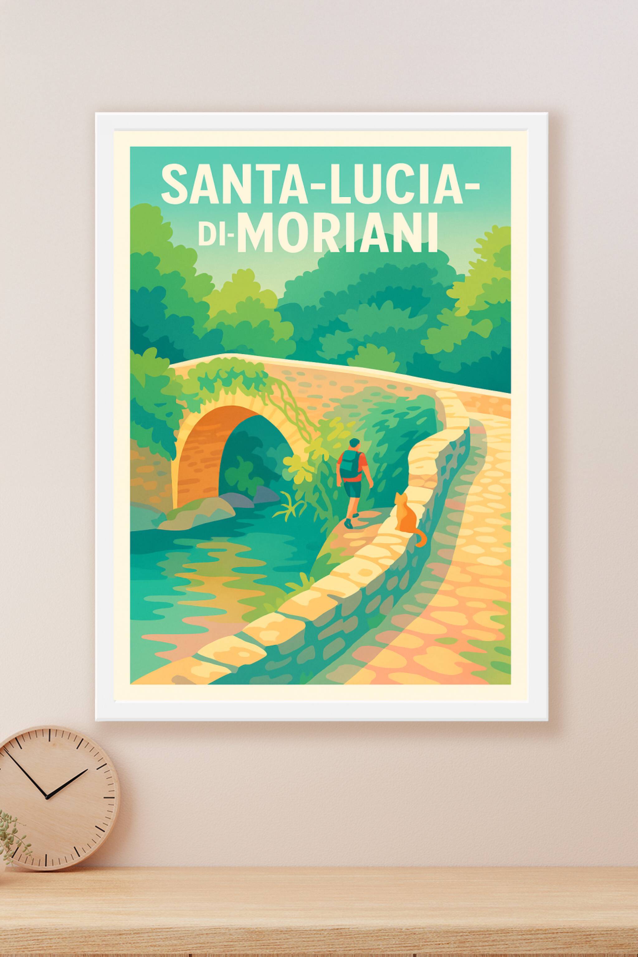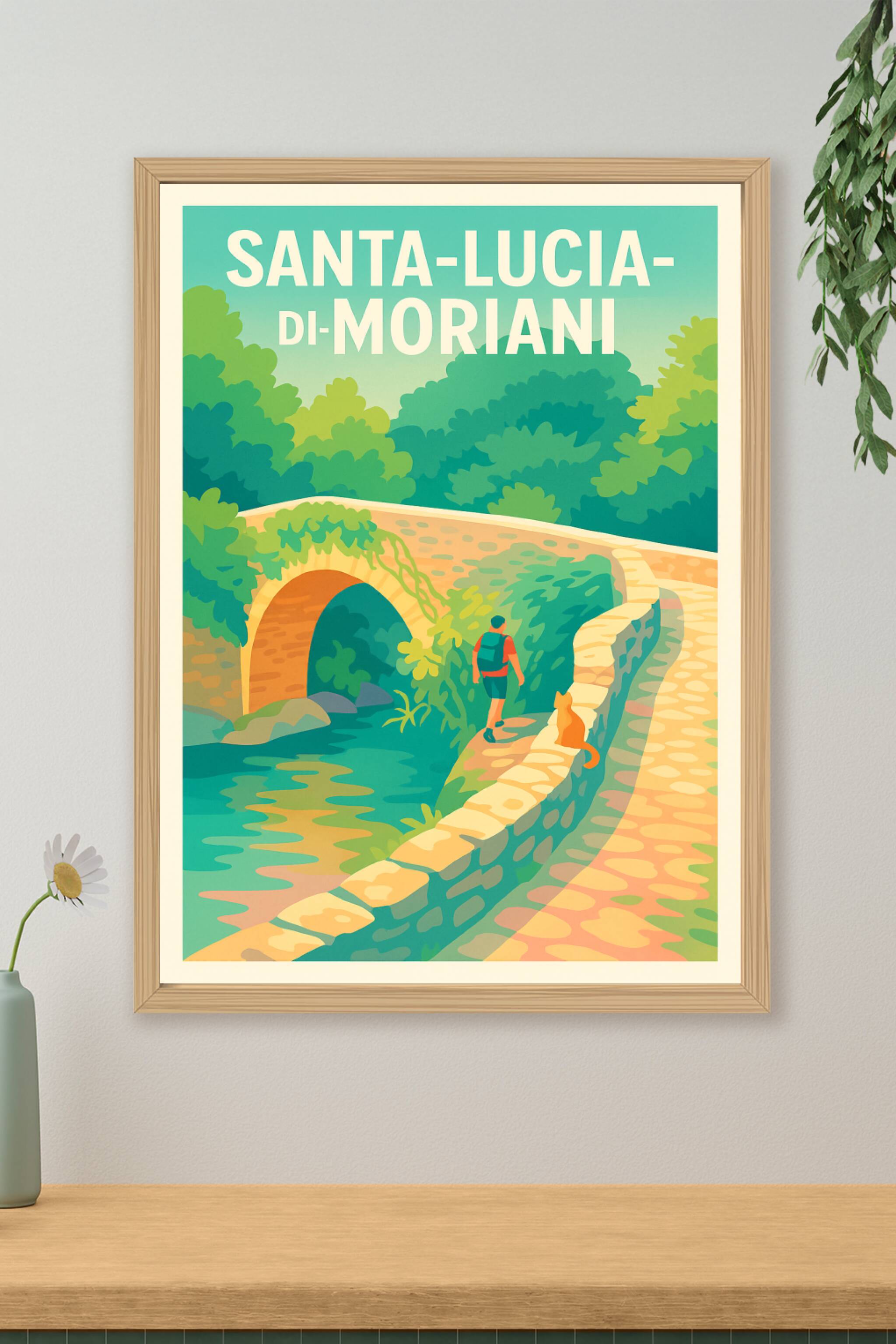 Découvrez la sérénité de Santa-Lucia-di-Moriani avec cette affiche illustrée qui capture la douceur d'une promenade au bord de l'eau et son pont de...