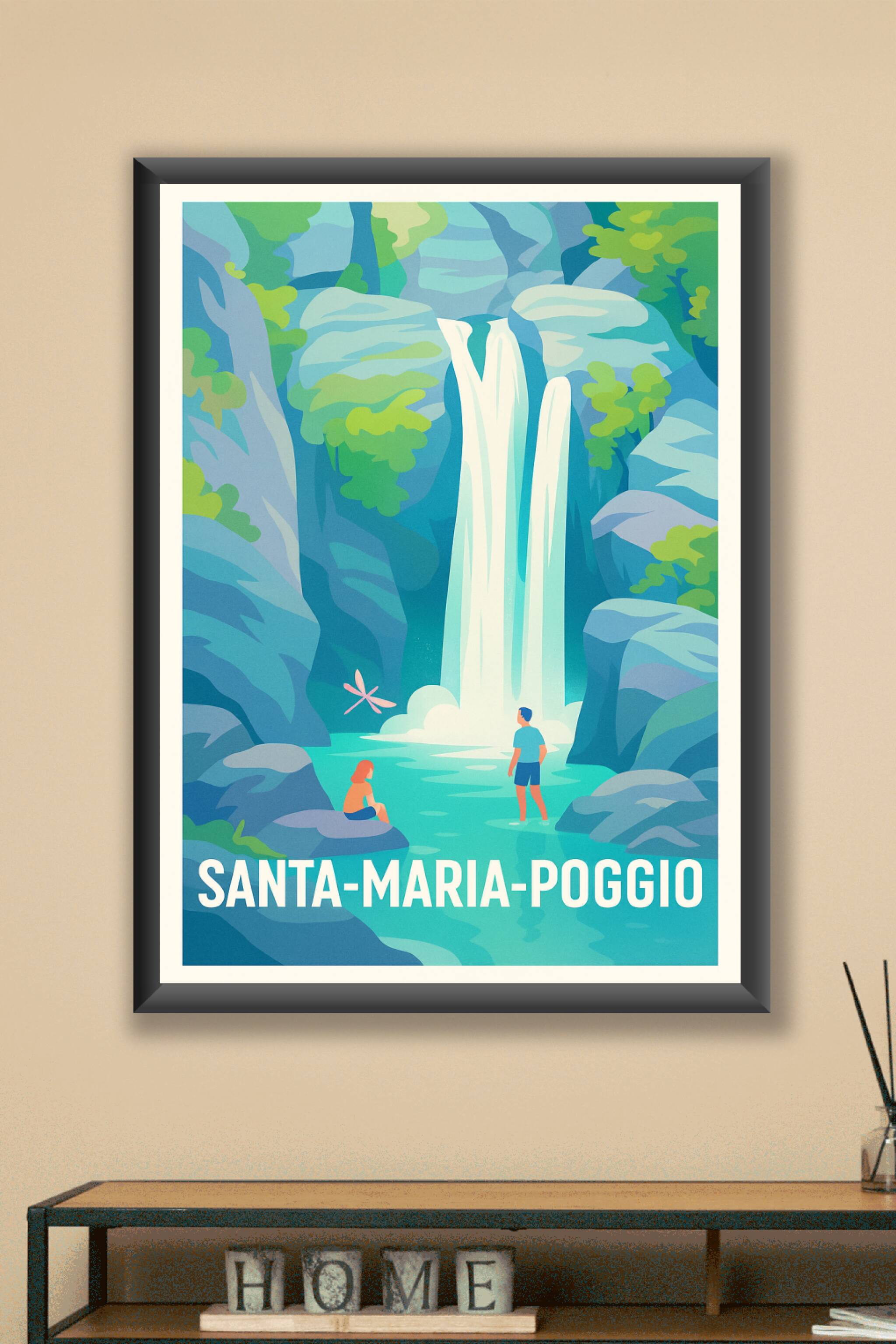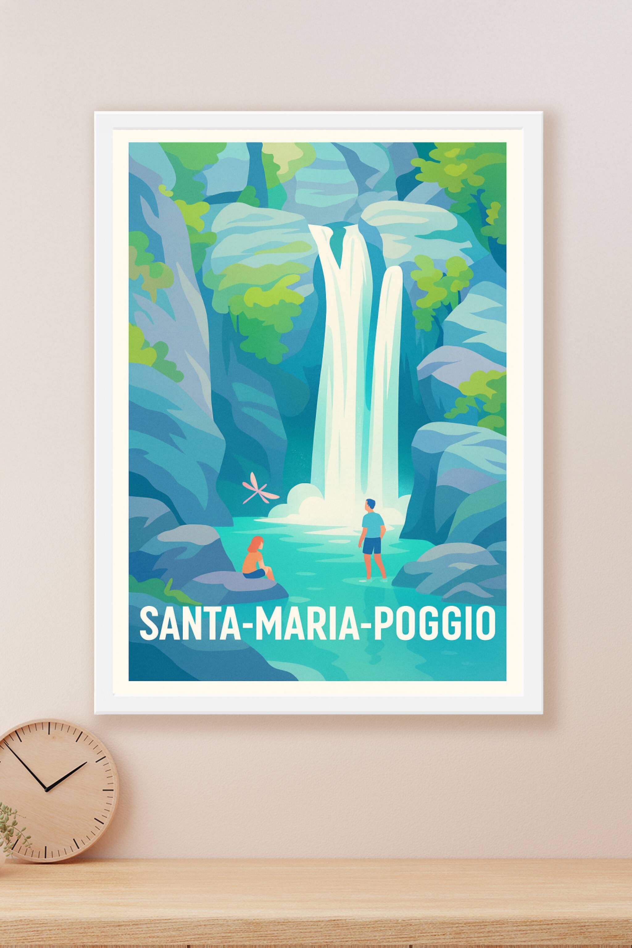 Découvrez la beauté naturelle de Santa-Maria-Poggio avec cette affiche illustrée mettant en scène une cascade cristalline entourée de rochers et de...