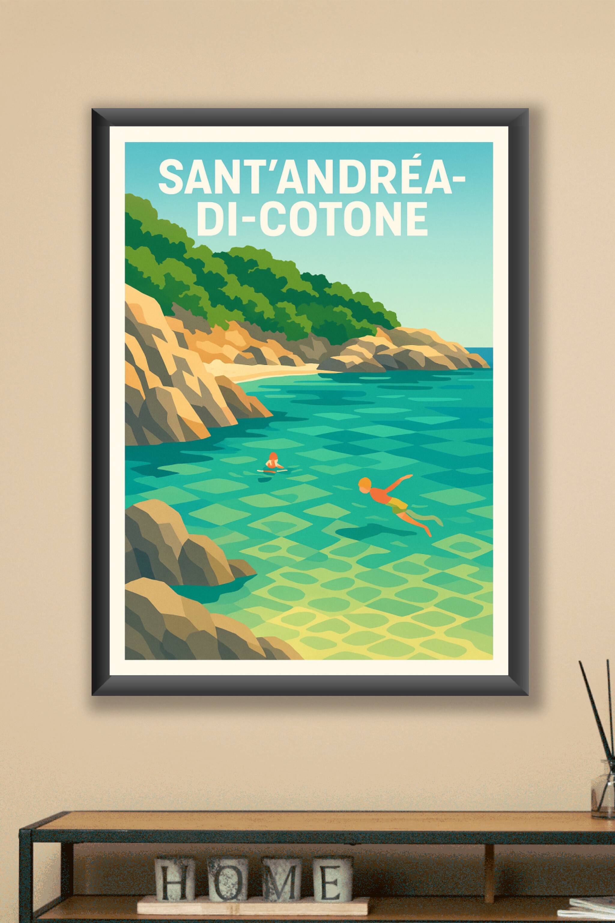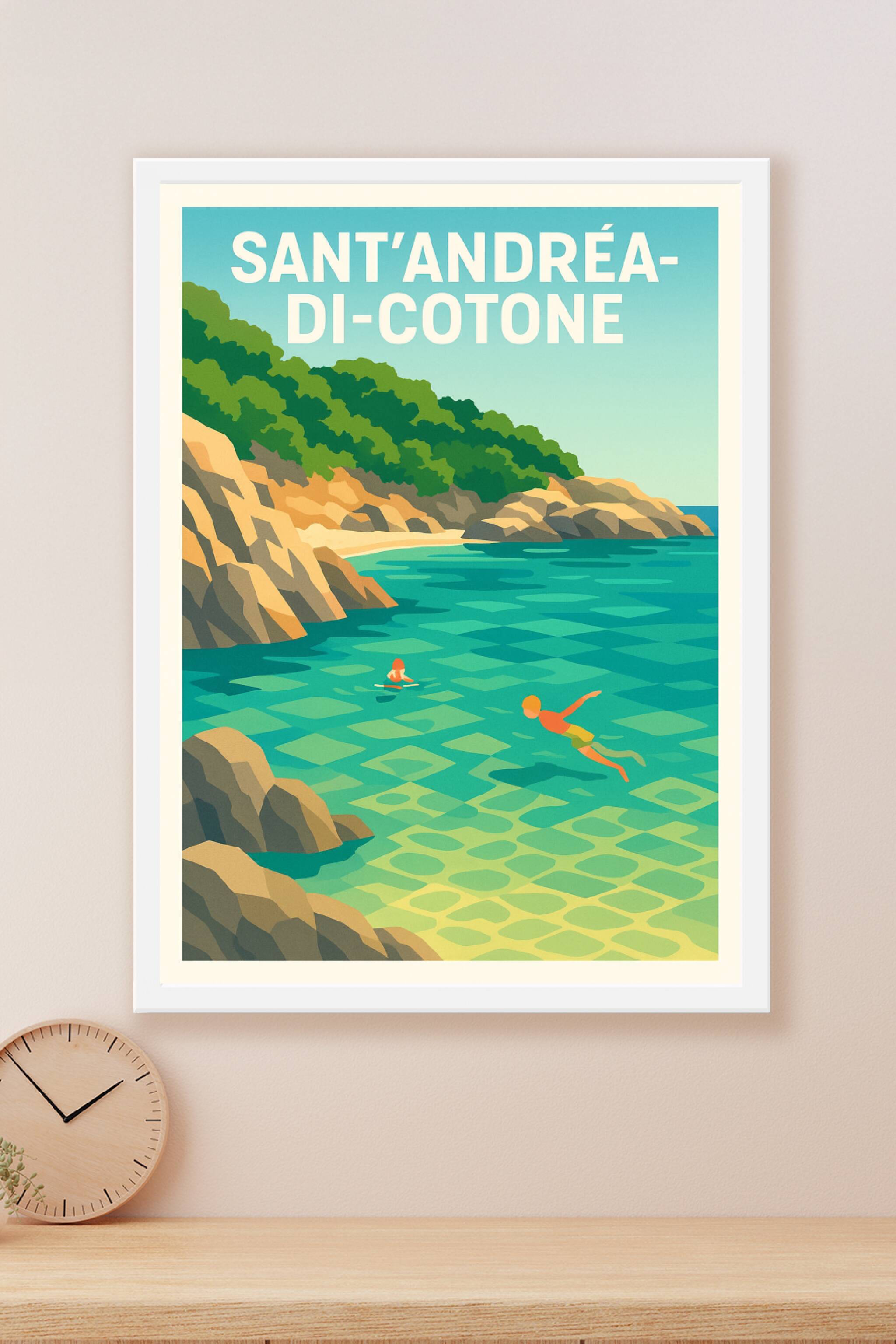 Découvrez la beauté sauvage et paisible de Sant'Andréa-di-Cotone avec cette affiche vintage qui capture une scène de baignade et de plongée au cœur d'une crique aux eaux cristallines. Ce poster invite à l'évasion et à la douceur de vivre méditerranéenne, parfait pour les amoureux de la nature et des paysages côtiers.Cette affiche est proposée en tirage "Fine Art", imprimée sur un papier coton 305g de haute qualité assurant des couleurs éclatantes et une grande longévité. Disponible en formats A1 à A4, elle peut être commandée avec ou sans cadre selon vos envies. Apportez une touche de fraîcheur et de charme artisanal à votre décoration intérieure ou offrez un souvenir unique et élégant de la Corse.