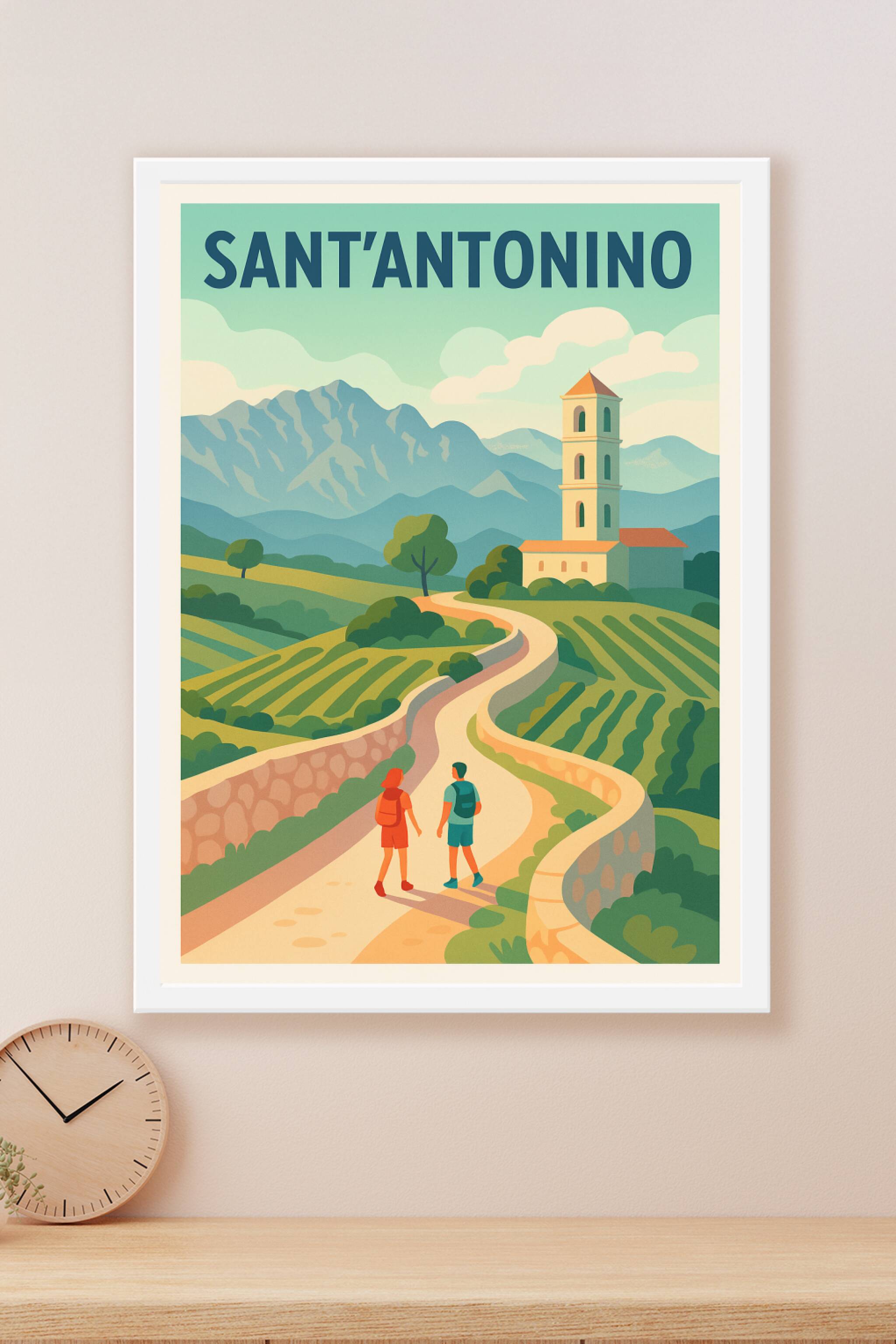 Découvrez la beauté intemporelle de Sant'Antonino à travers cette affiche au style vintage doux et coloré, illustrant un chemin sinueux entouré de ...