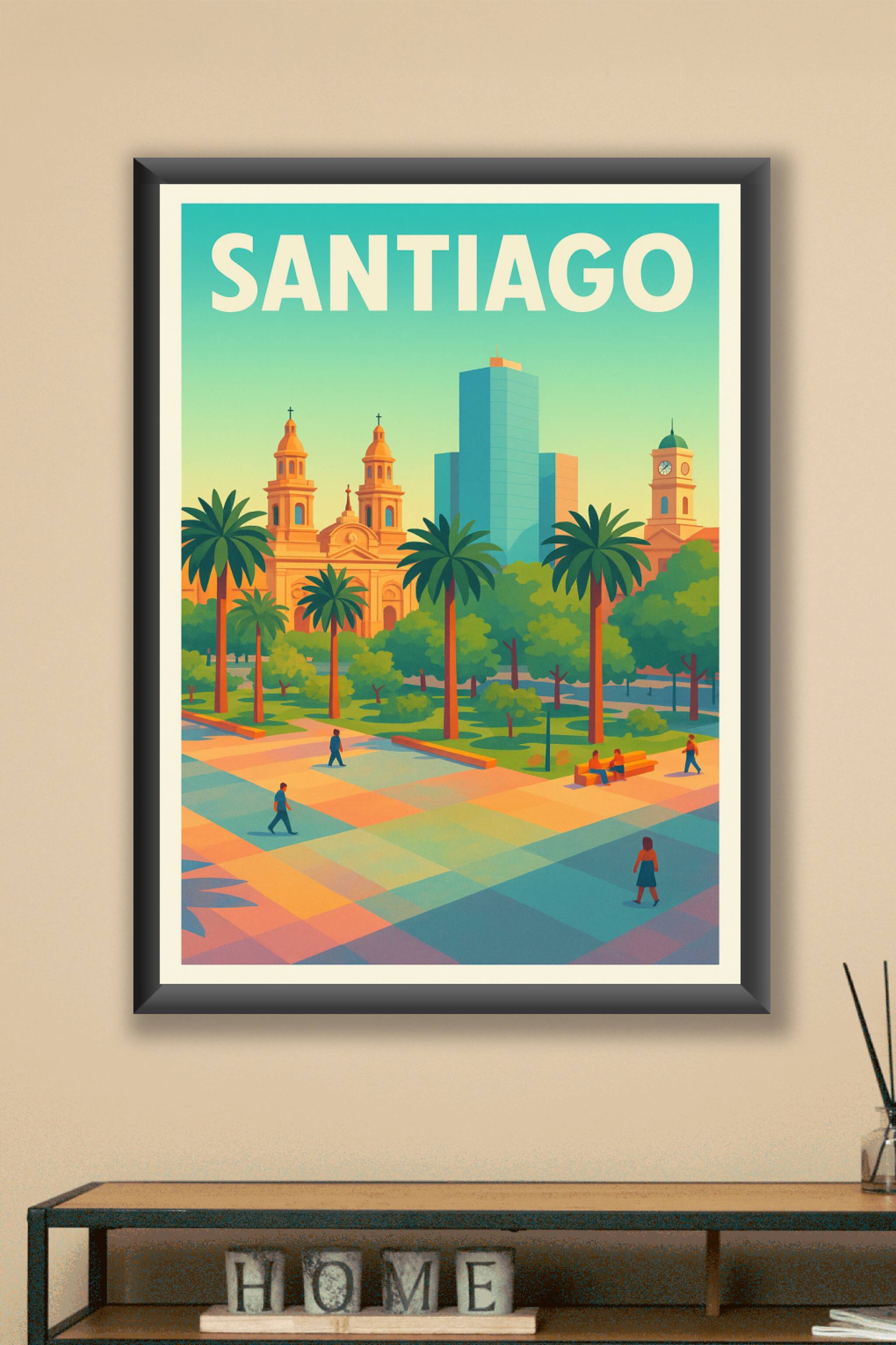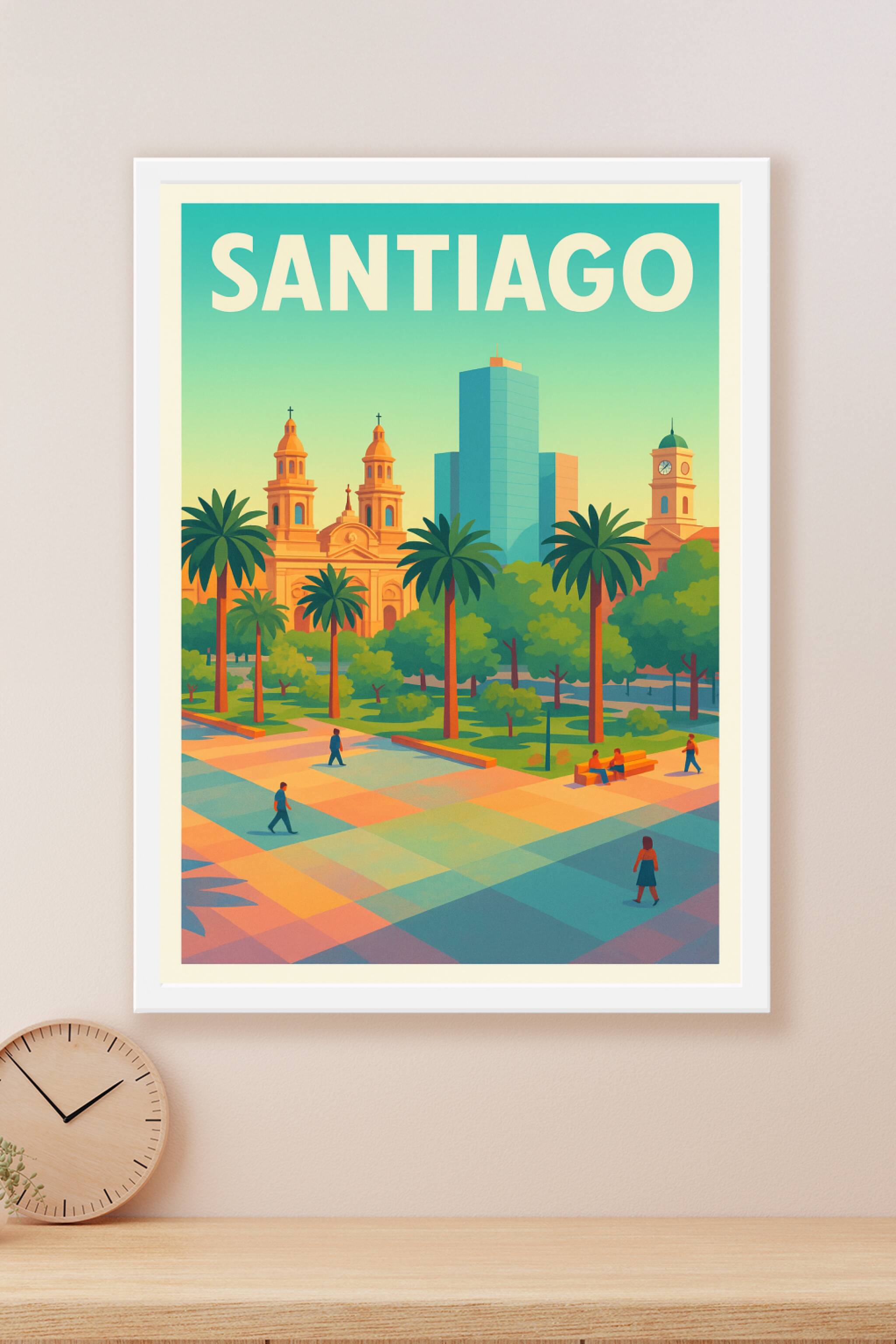 Découvrez la douceur de vivre de Santiago à travers cette affiche illustrée mettant en valeur l'équilibre parfait entre architecture historique et ...
