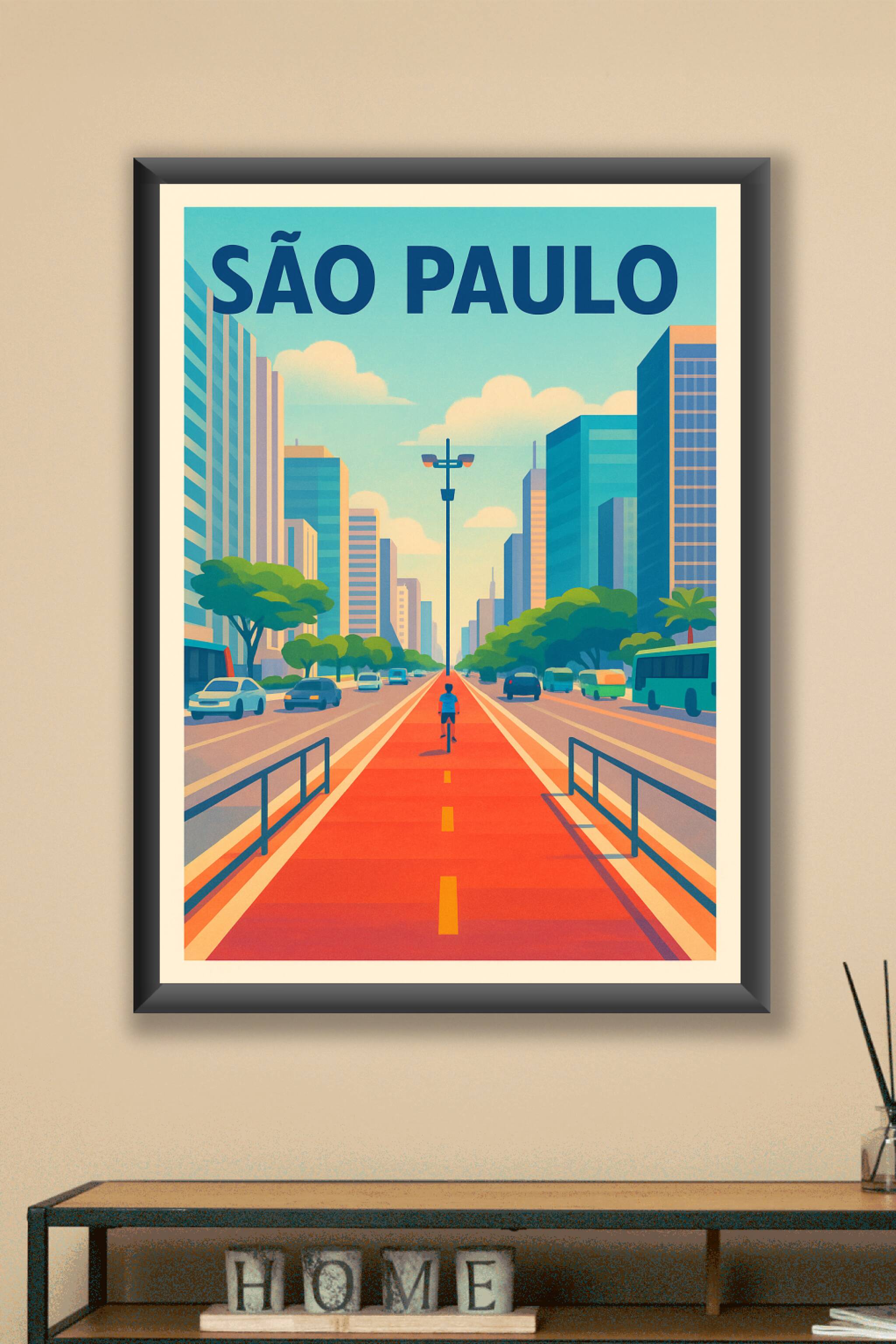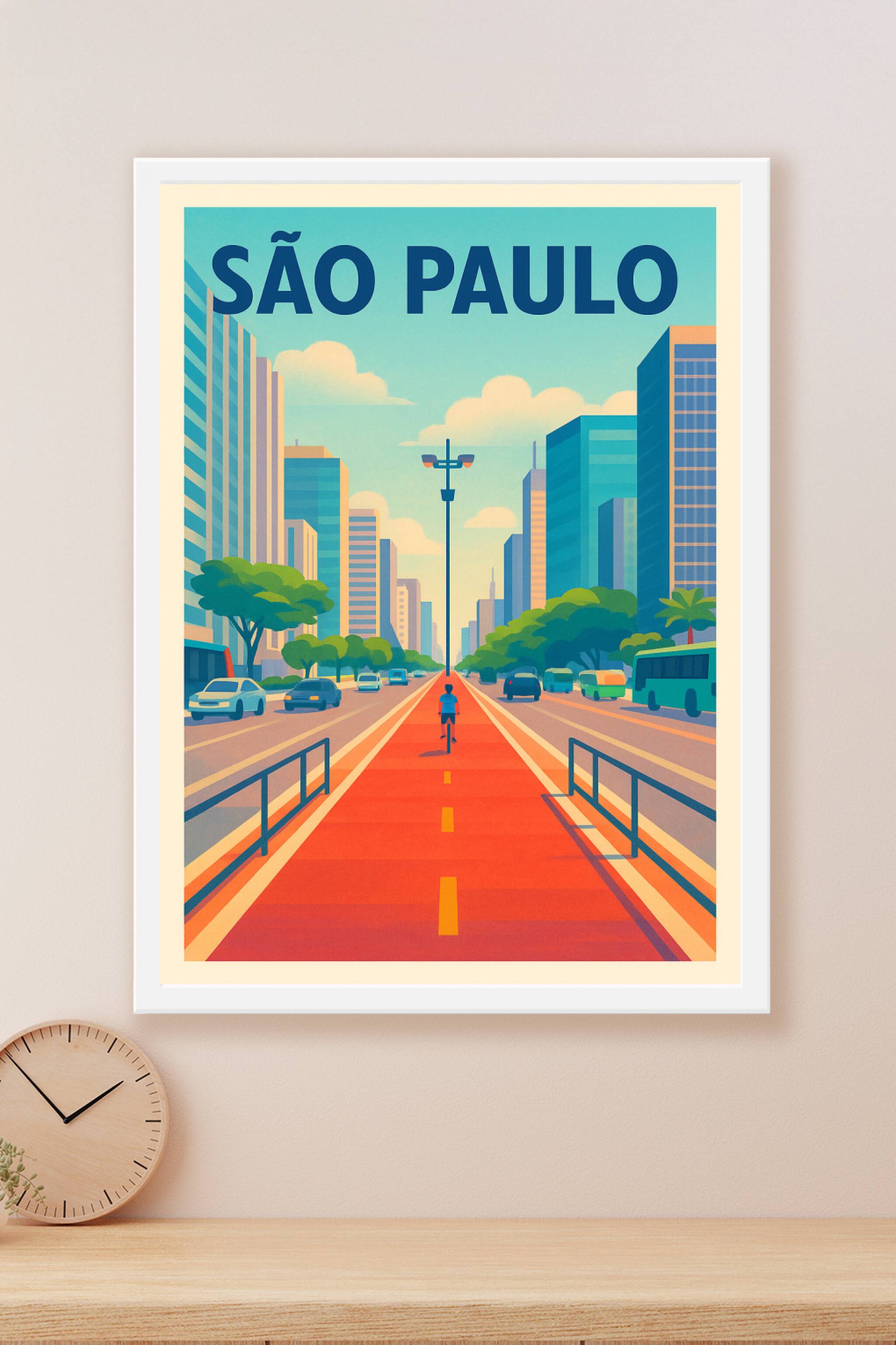 Découvrez l'énergie et la modernité de São Paulo avec cette affiche illustrée dans un style graphique dynamique et coloré. Le poster met en scène u...