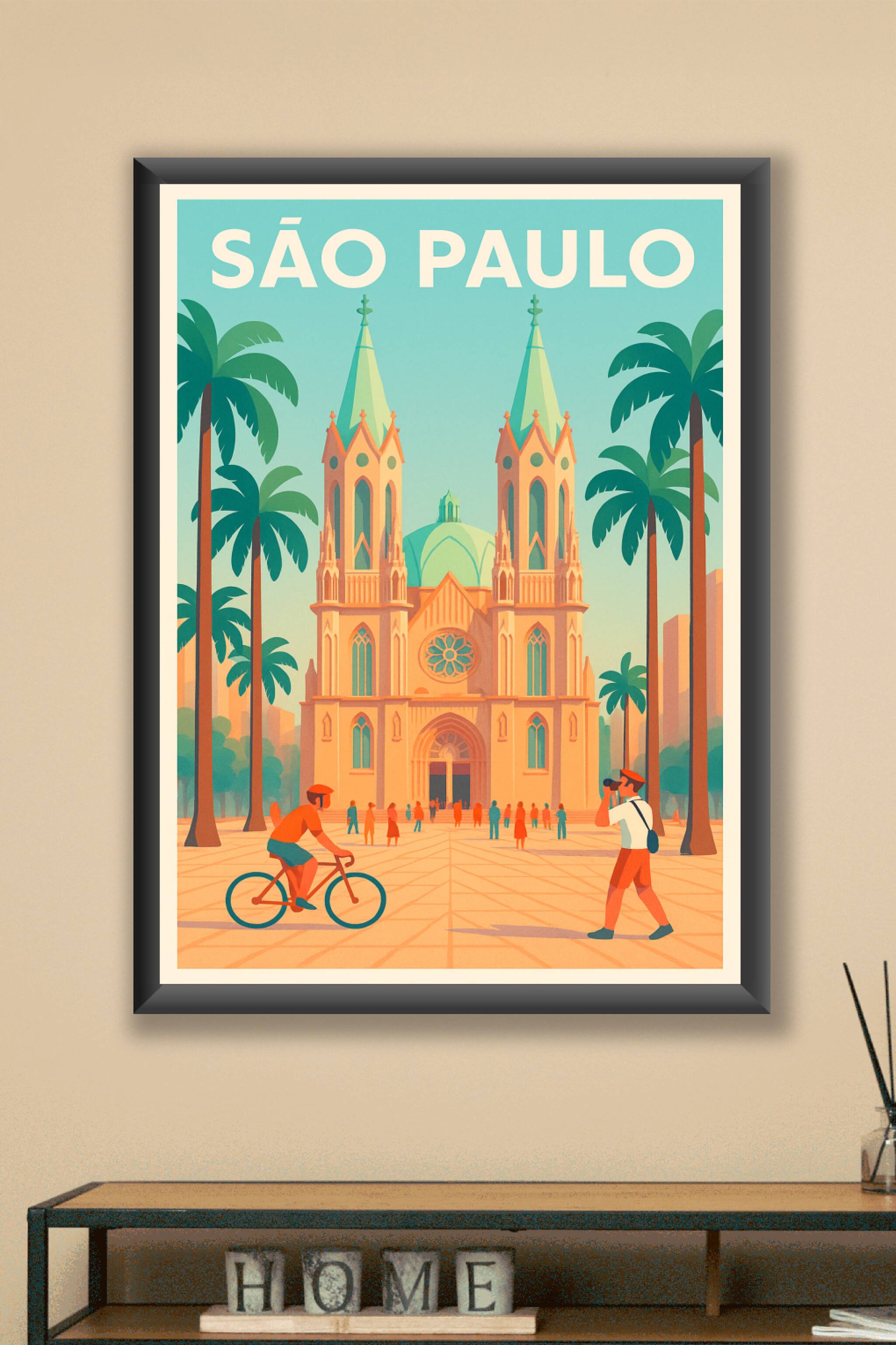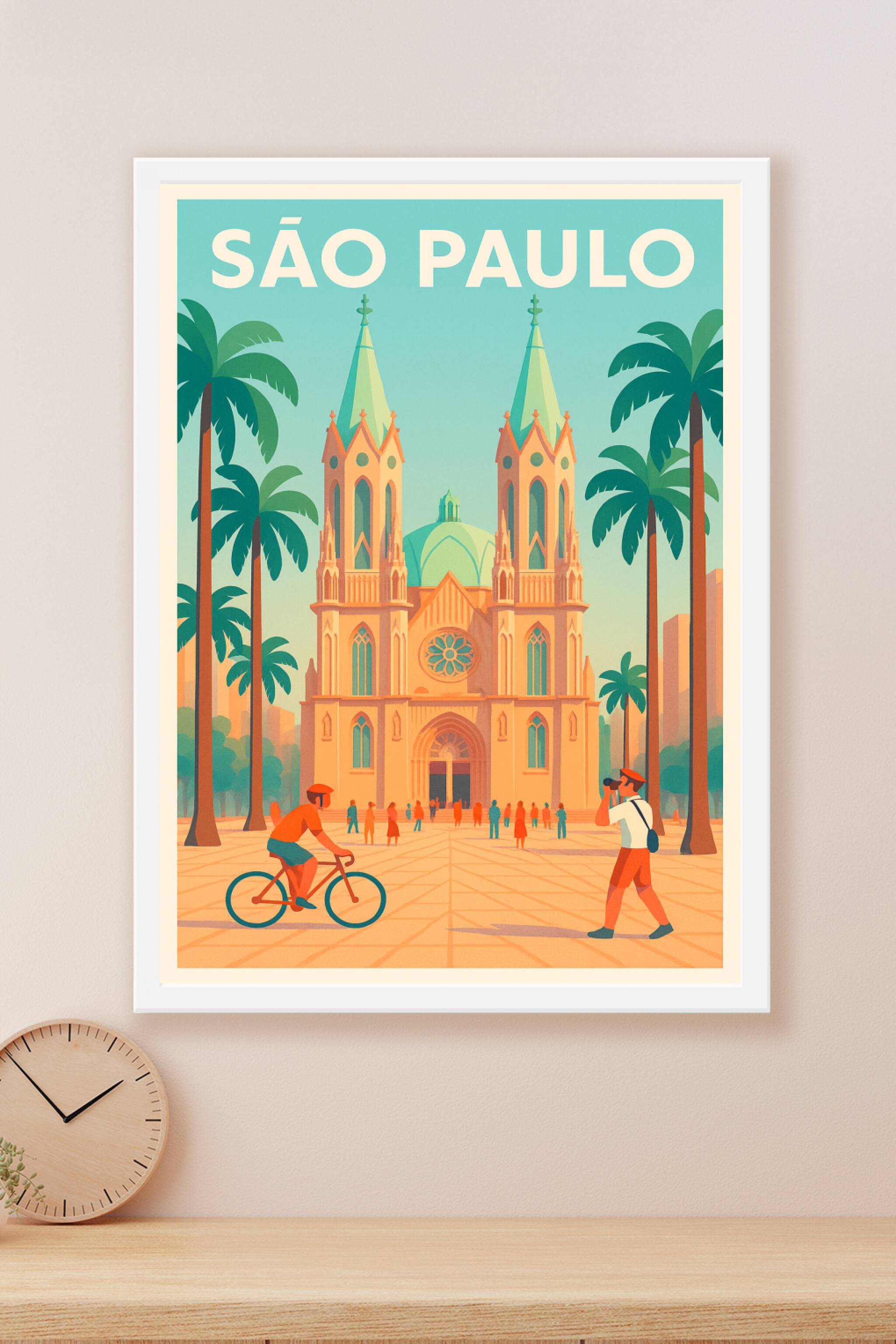 Découvrez l'énergie unique de São Paulo avec ce poster vintage illustrant la majestueuse cathédrale de la ville entourée de palmiers et de passants...