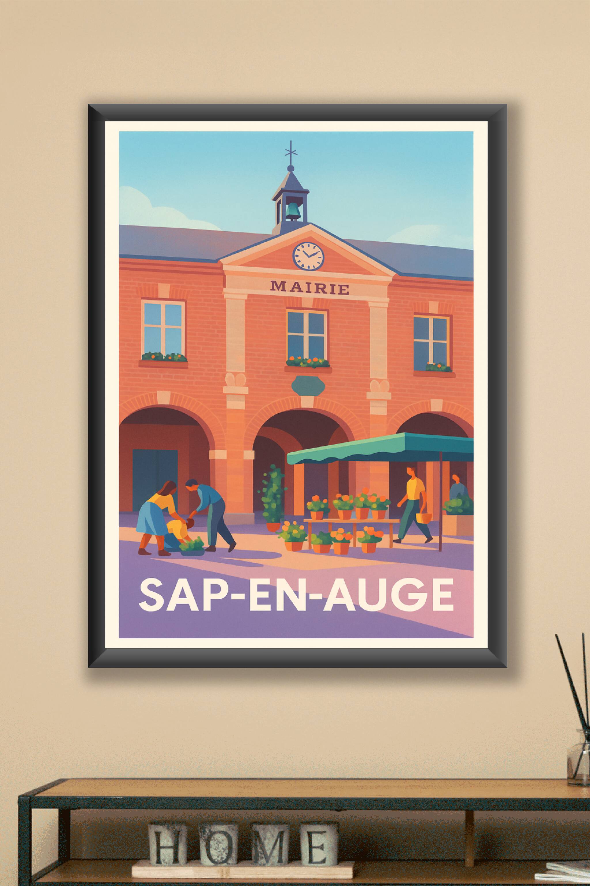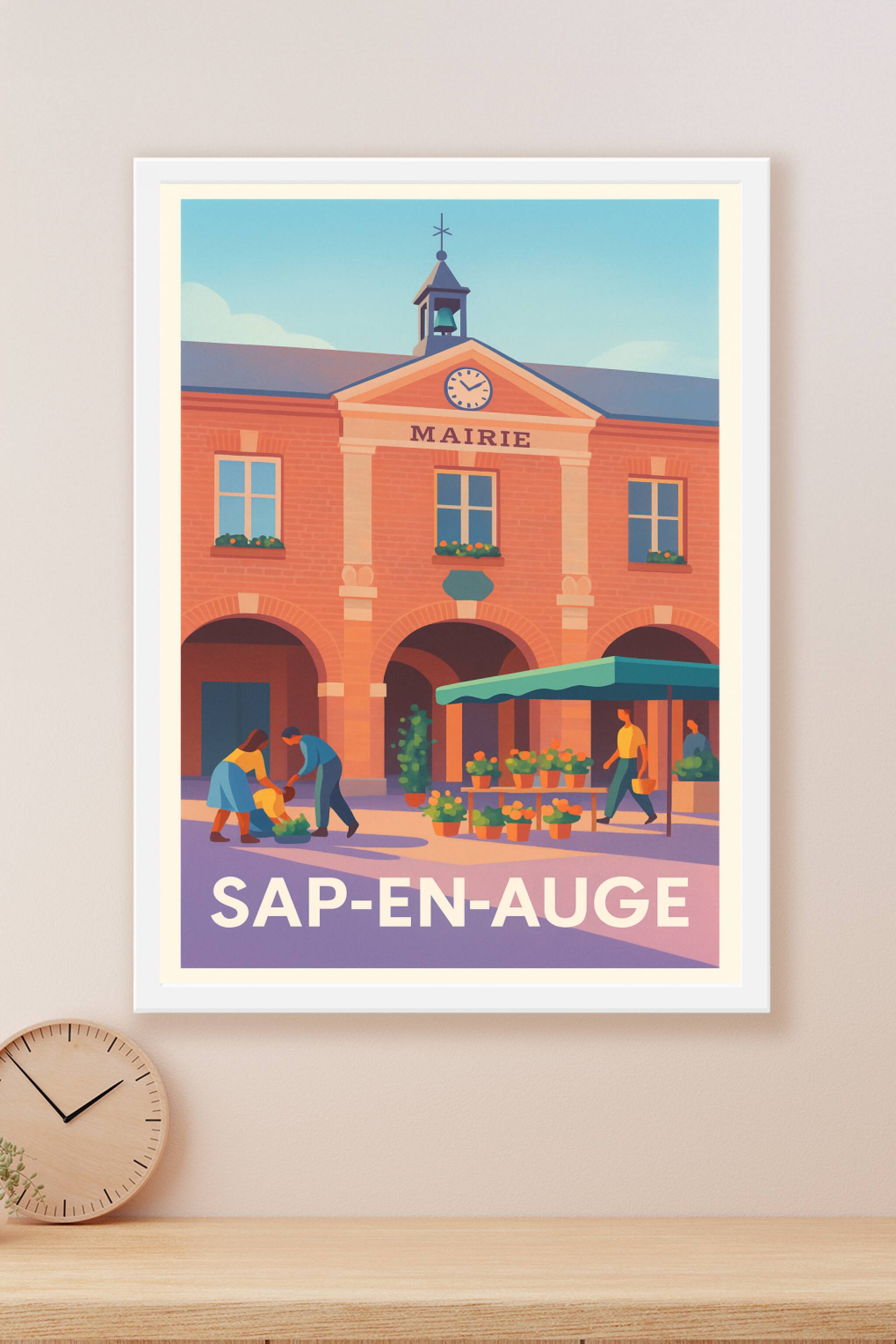 Découvrez l'atmosphère conviviale de Sap-en-Auge à travers cette affiche illustrée mettant en scène la mairie et son marché fleuri. Ce poster au st...