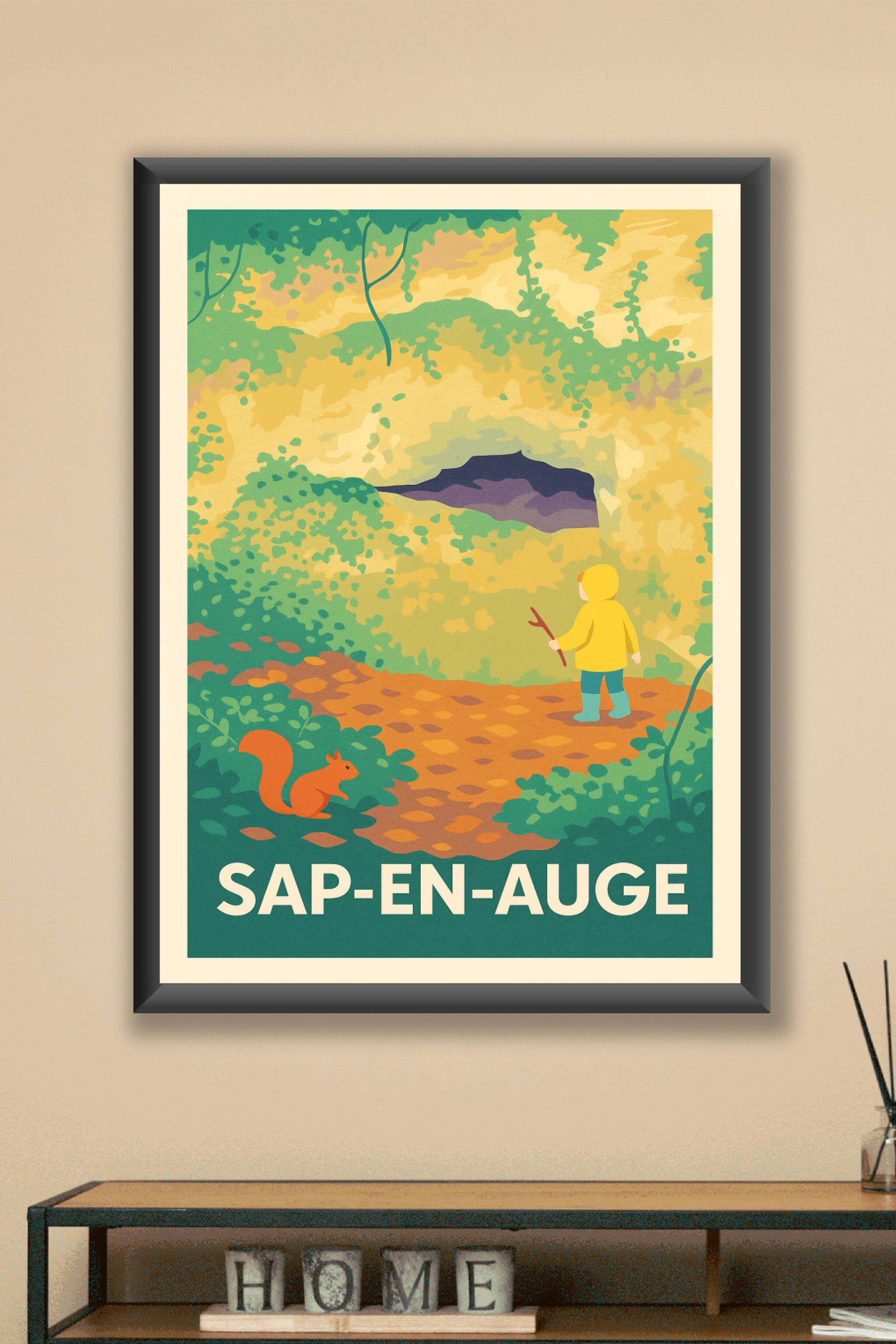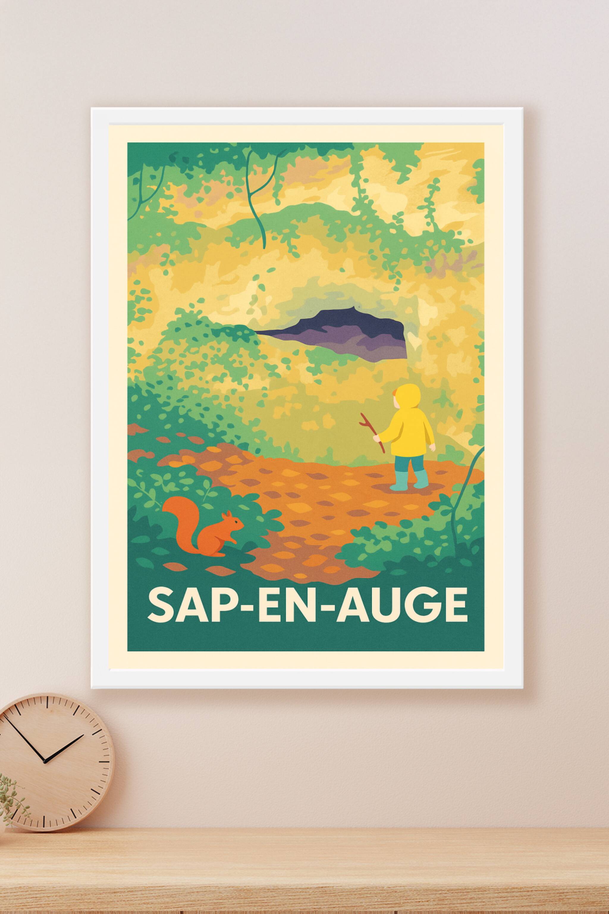 Découvrez la quiétude et la magie de Sap-en-Auge capturées dans cette affiche illustrée au style doux et coloré. Cette scène bucolique met en avant un enfant en ciré jaune explorant un sentier automnal, accompagné d'un écureuil curieux, évoquant une promenade paisible en pleine nature. Ce poster est imprimé en tirage "Fine Art" sur papier 305g coton, garantissant une qualité d'impression exceptionnelle et des couleurs éclatantes. Disponible en formats A1 à A4, avec ou sans cadre, cette affiche ajoutera une touche chaleureuse et poétique à votre décoration intérieure. Un choix parfait pour les amateurs de paysages et de souvenirs authentiques, avec une fabrication 100% française premium.