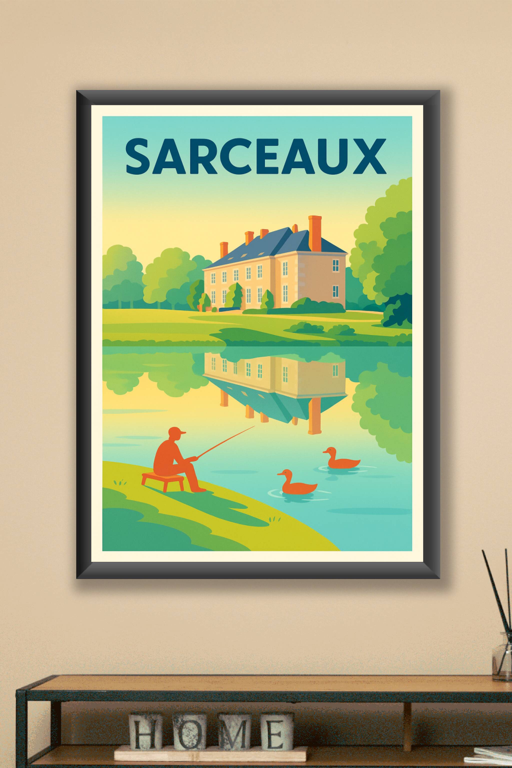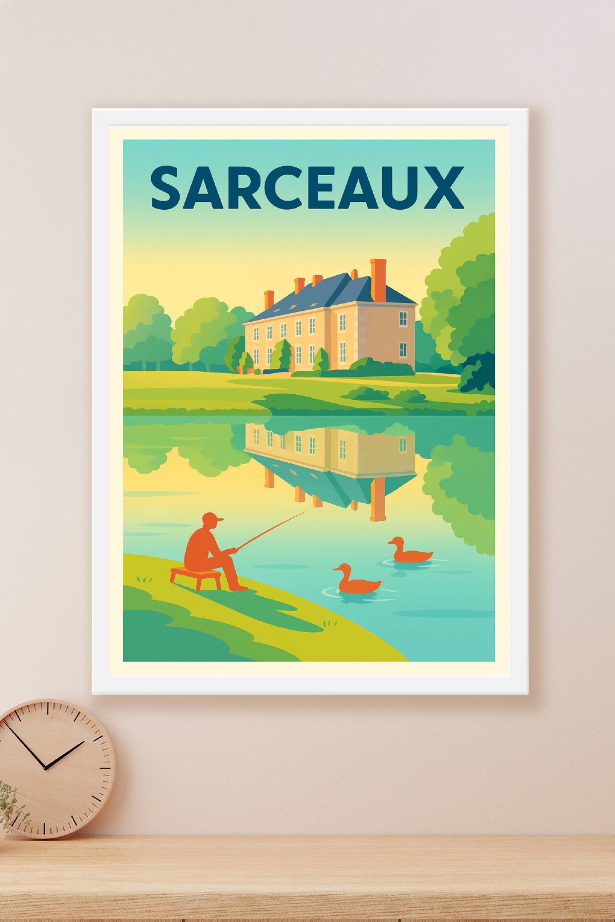 Découvrez la quiétude de Sarceaux avec cette affiche au style rétro, mettant en scène une maison de campagne reflétée dans une rivière paisible, ac...