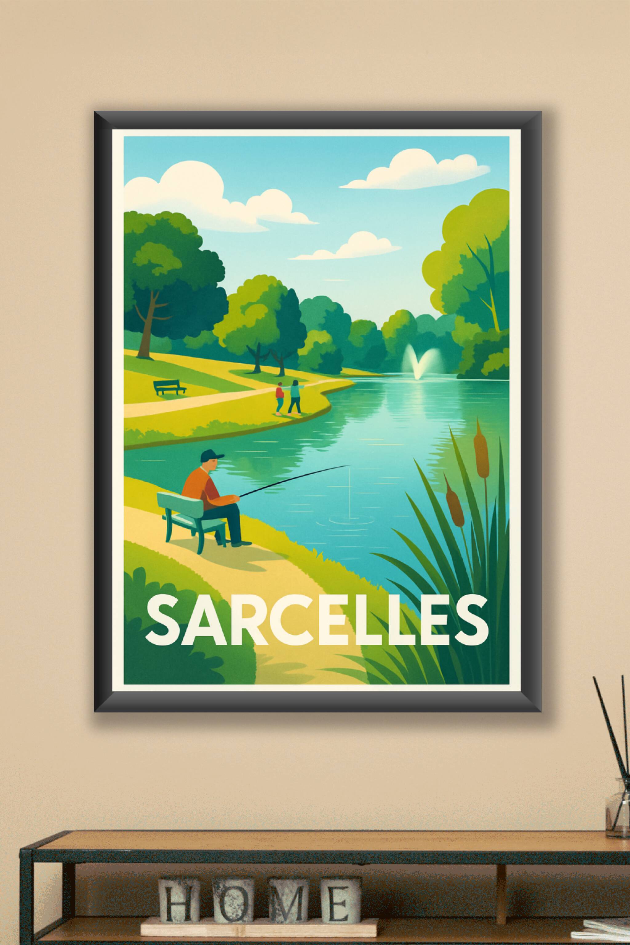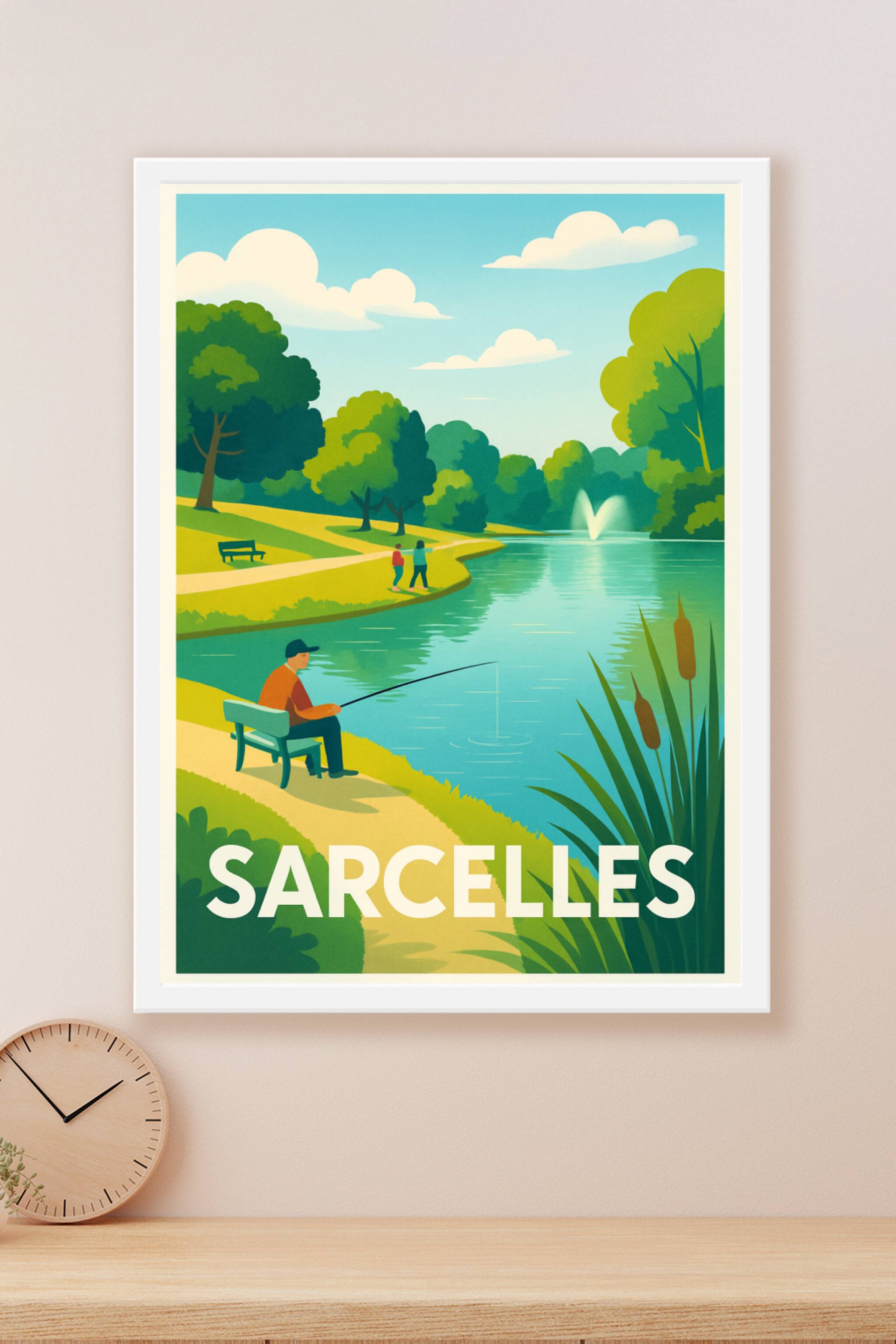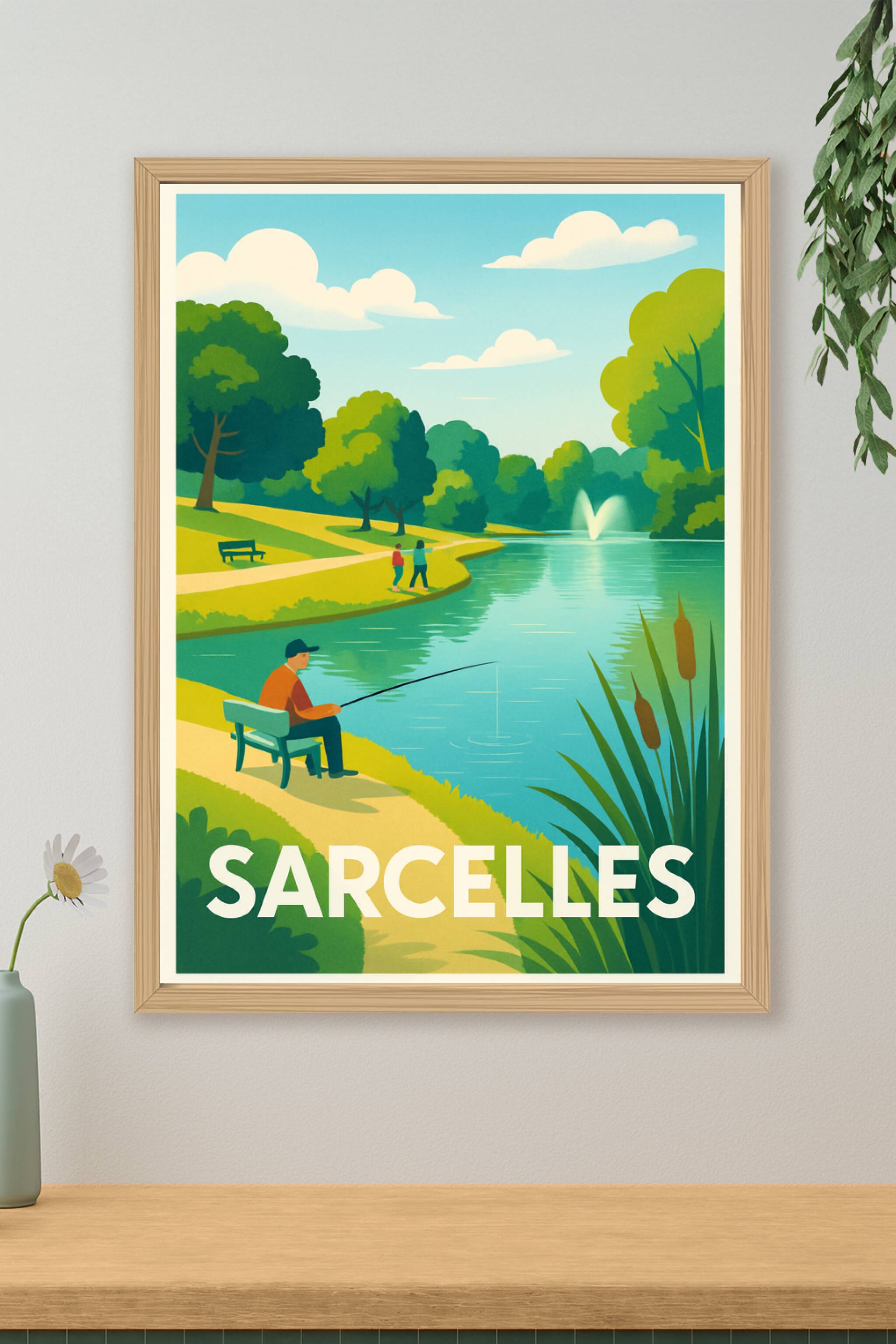 Découvrez la sérénité de Sarcelles avec cette affiche illustrant un moment de détente au bord d'un étang paisible, où pêche et promenade se conjugu...