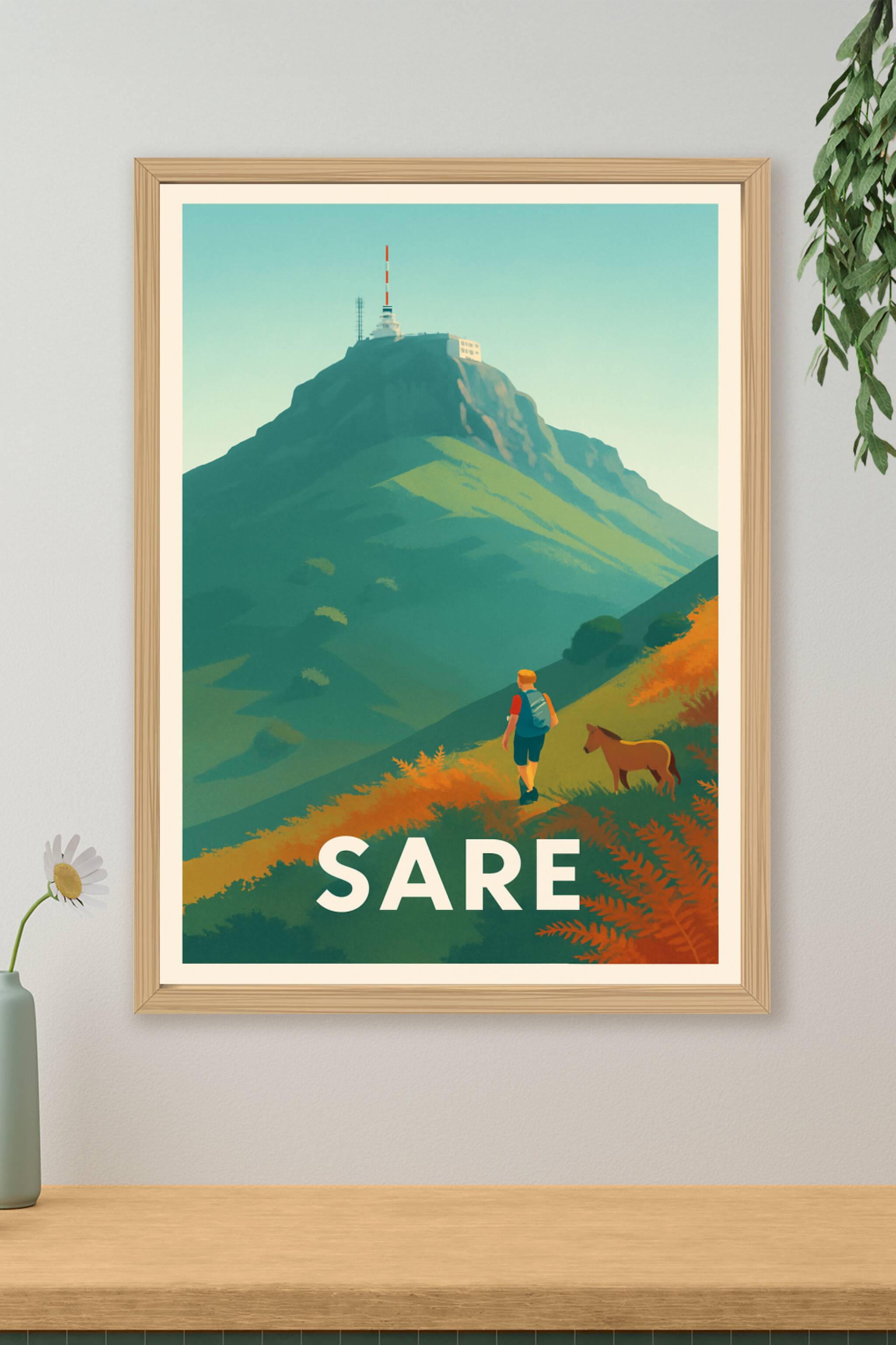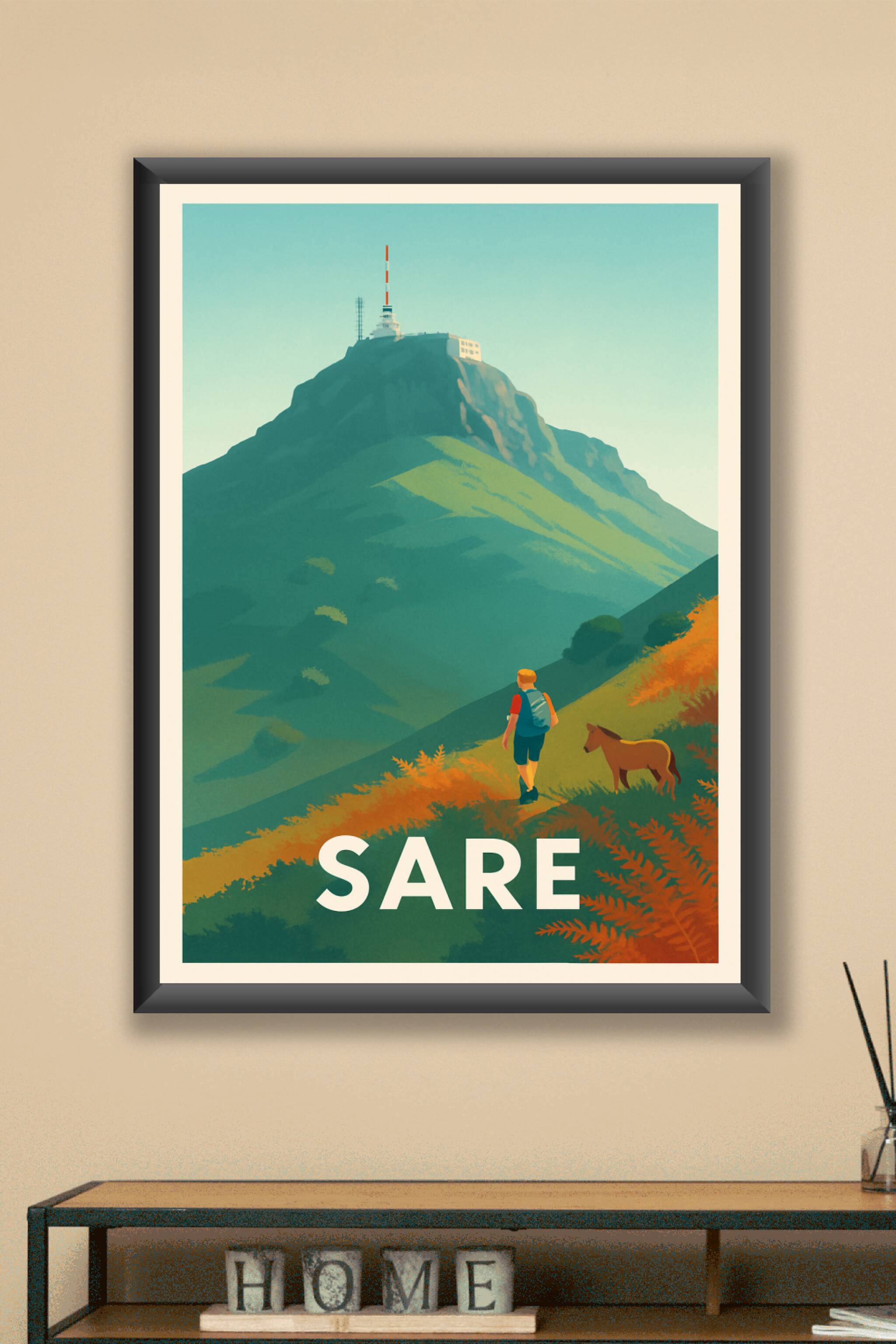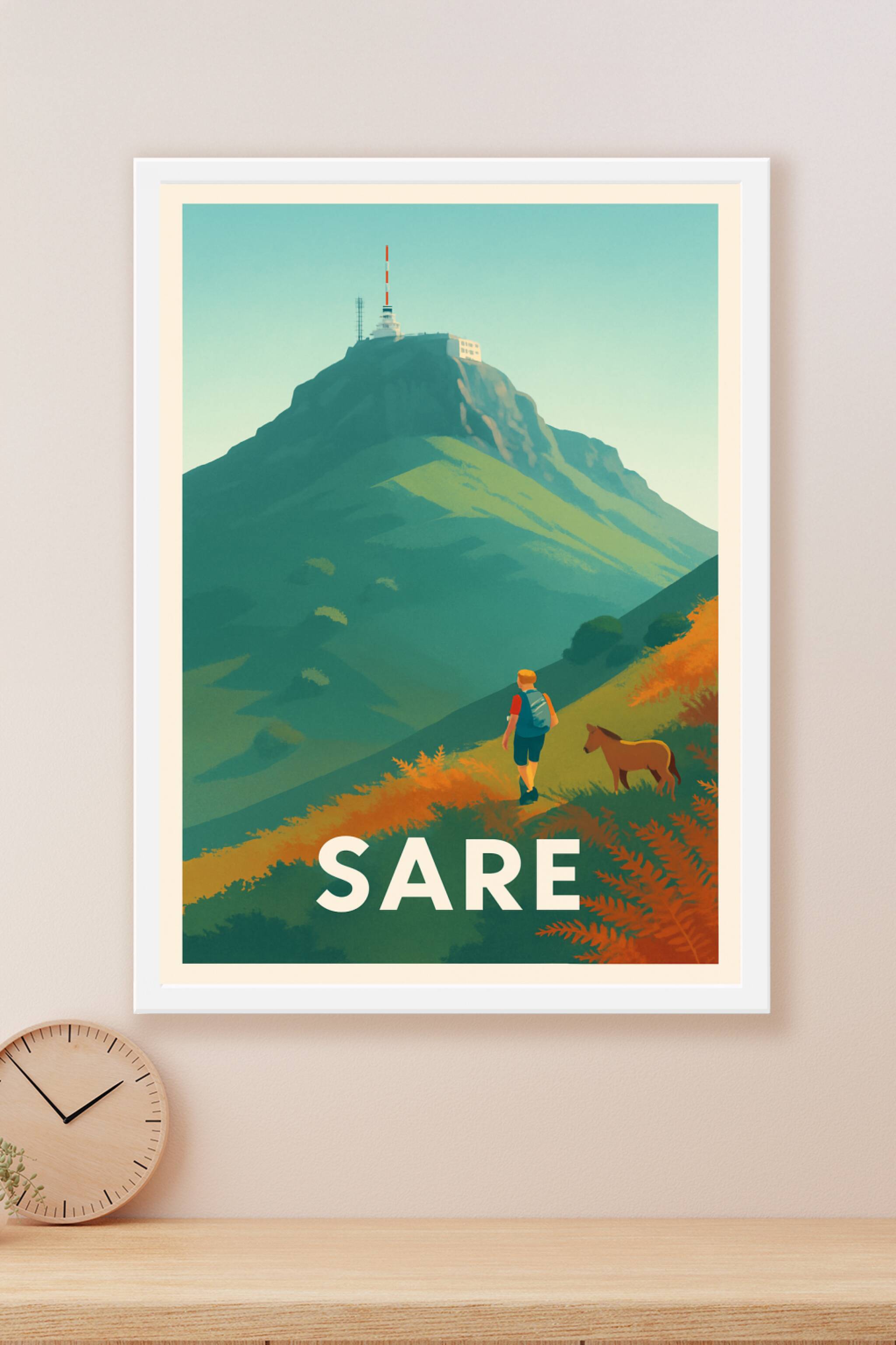 Découvrez la beauté sauvage et apaisante de Sare avec cette affiche illustrée mettant en scène un randonneur et son compagnon équin face au célèbre...