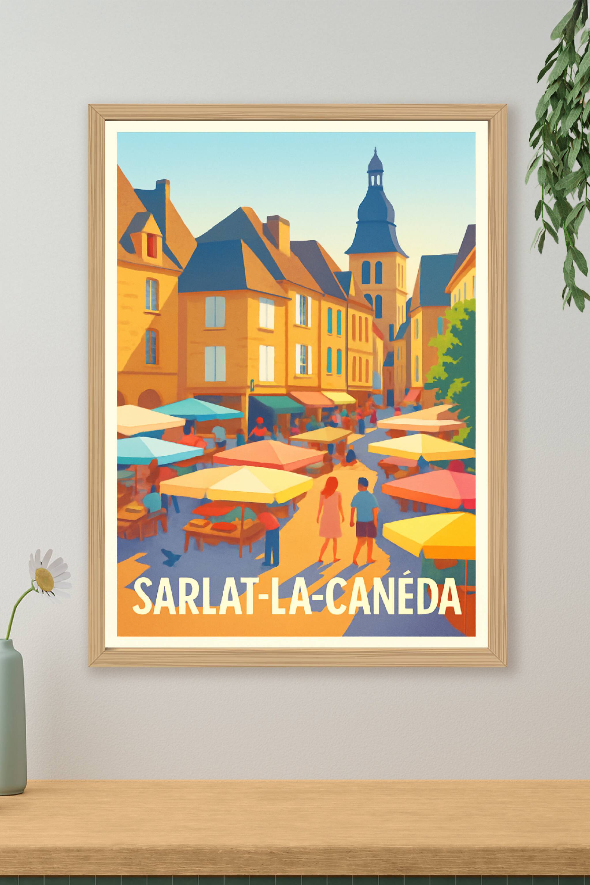 Découvrez l'atmosphère chaleureuse et animée de Sarlat-la-Canéda à travers cette affiche illustrée aux couleurs vives et au style rétro. Ce poster représente une scène typique de marché en plein air, avec ses ruelles pavées et ses bâches colorées, emblématique du patrimoine vivant de cette ville médiévale. Imprimée en tirage Fine Art sur papier 305g coton, cette affiche offre une qualité d'impression supérieure pour une clarté et une longévité optimales. Disponible en formats A1 à A4, avec ou sans cadre, elle apportera une touche d'authenticité et de convivialité à votre intérieur. Parfaite pour les amateurs de décoration artisanale ou les passionnés de voyages, cette affiche est 100% fabriquée en France pour sublimer vos murs avec élégance.