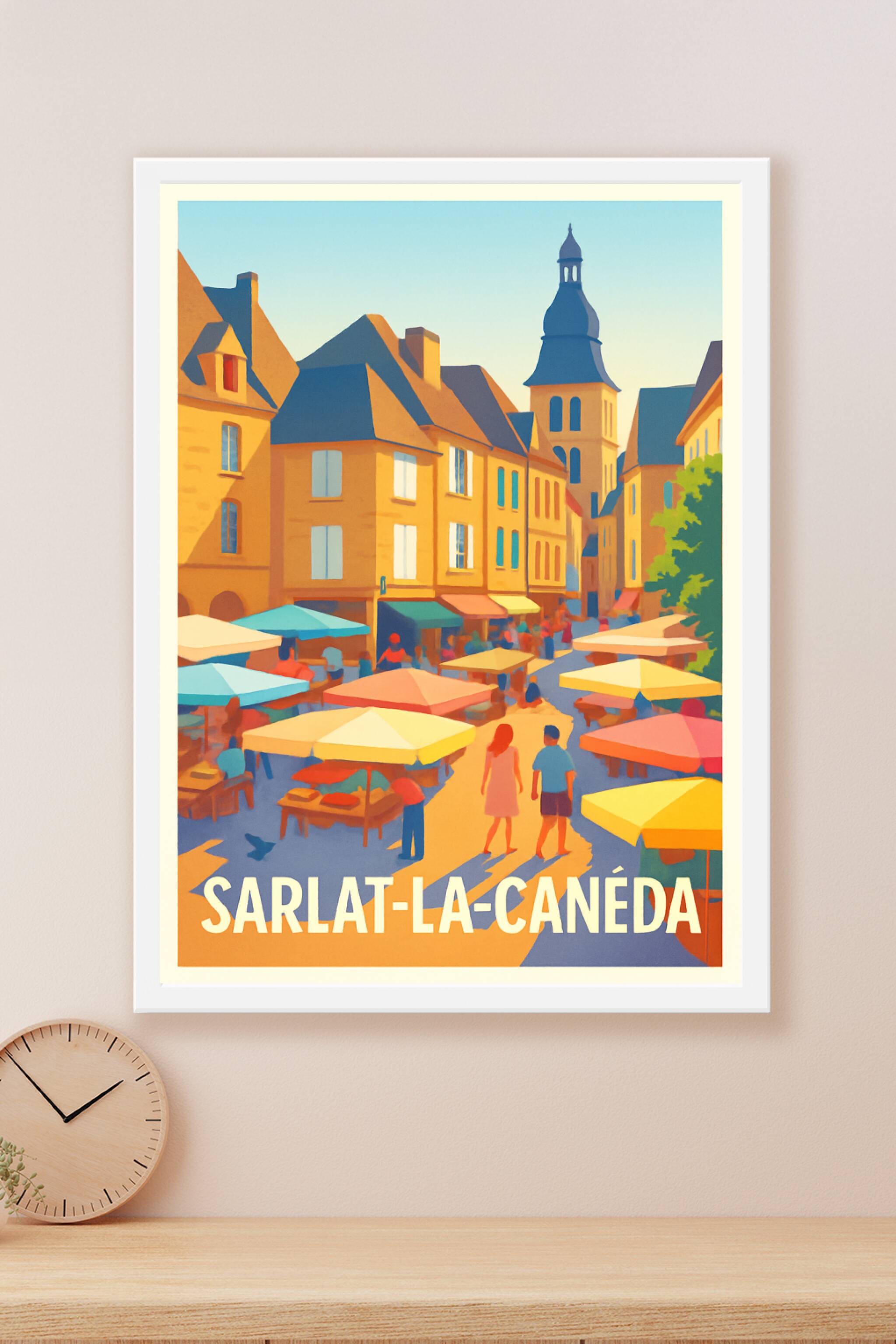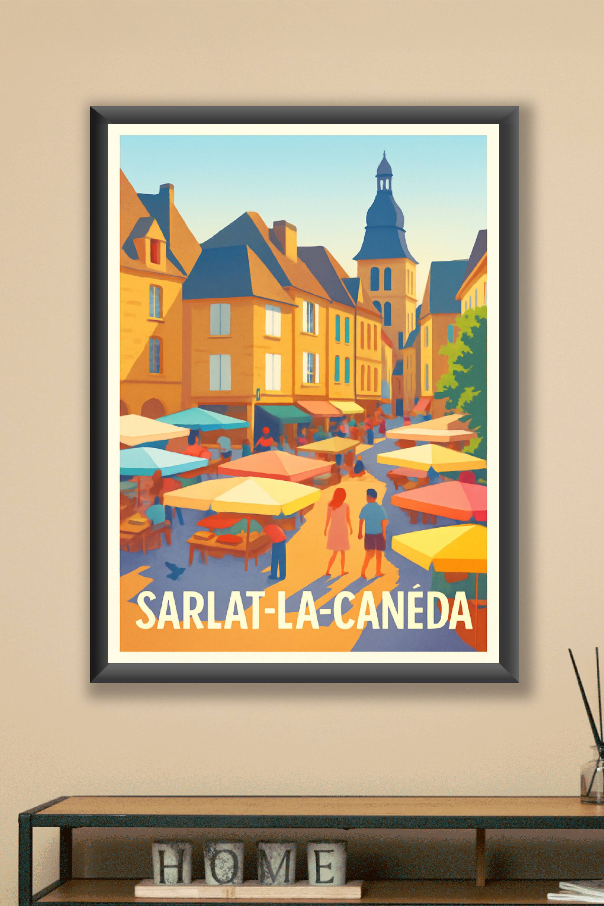 Découvrez l'atmosphère chaleureuse et animée de Sarlat-la-Canéda à travers cette affiche illustrée aux couleurs vives et au style rétro. Ce poster ...