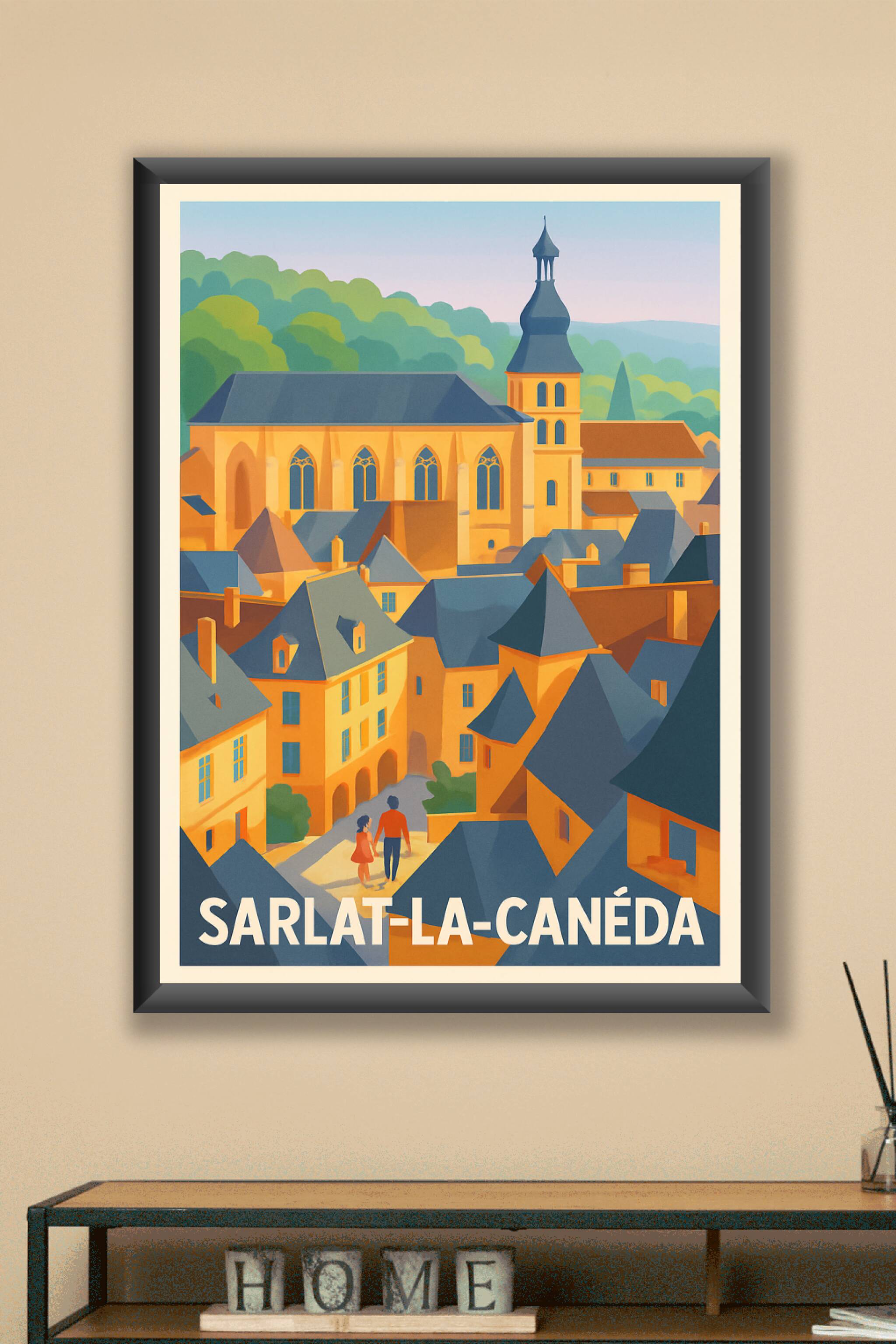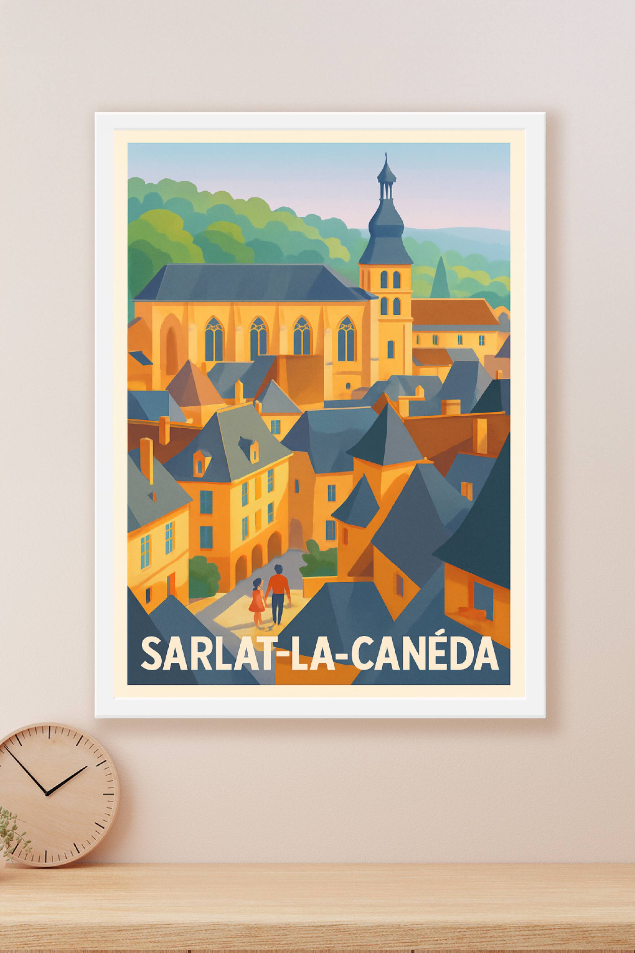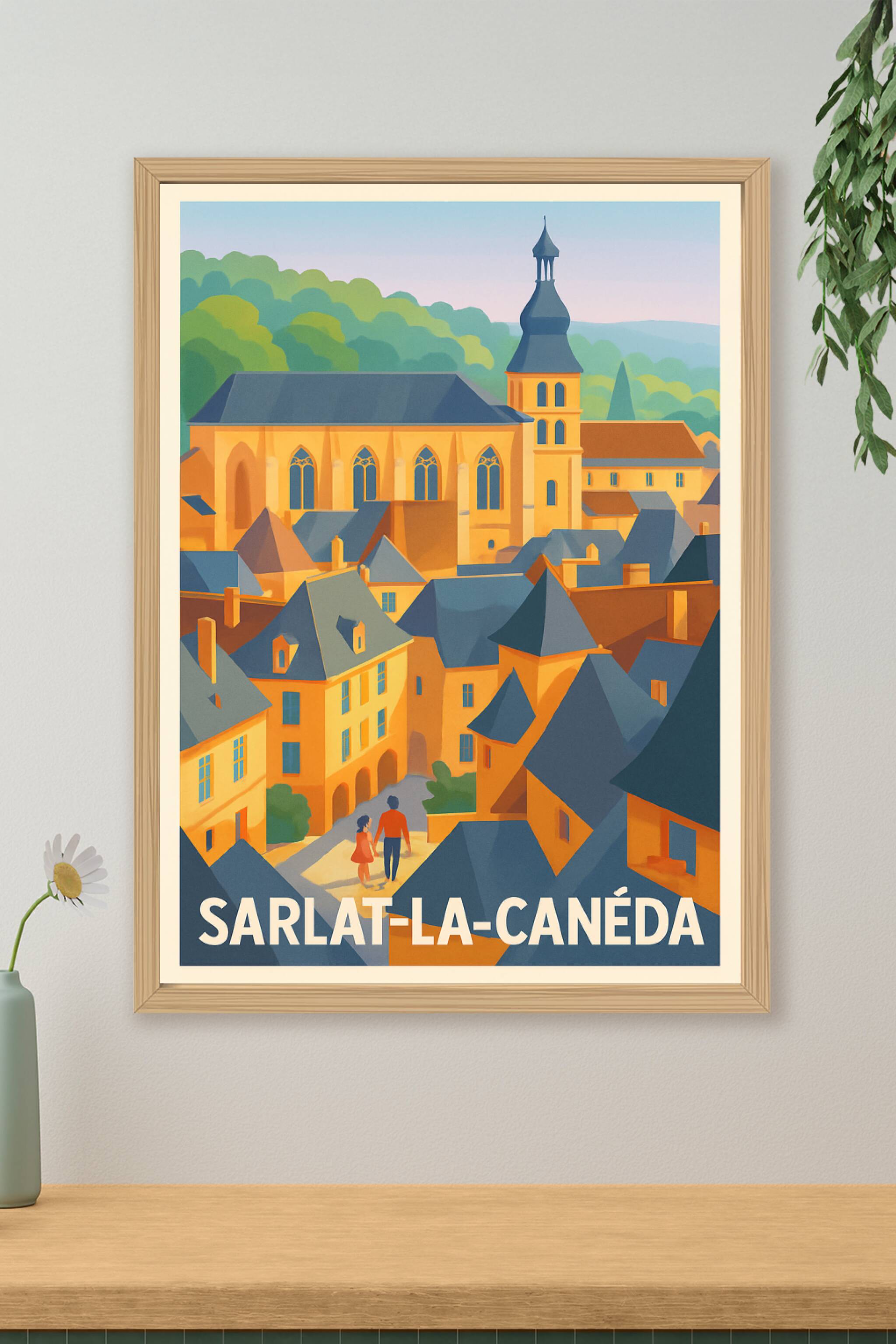 Découvrez l'élégance pittoresque de Sarlat-la-Canéda avec cette affiche illustrée mettant en valeur ses toits emblématiques et son architecture méd...