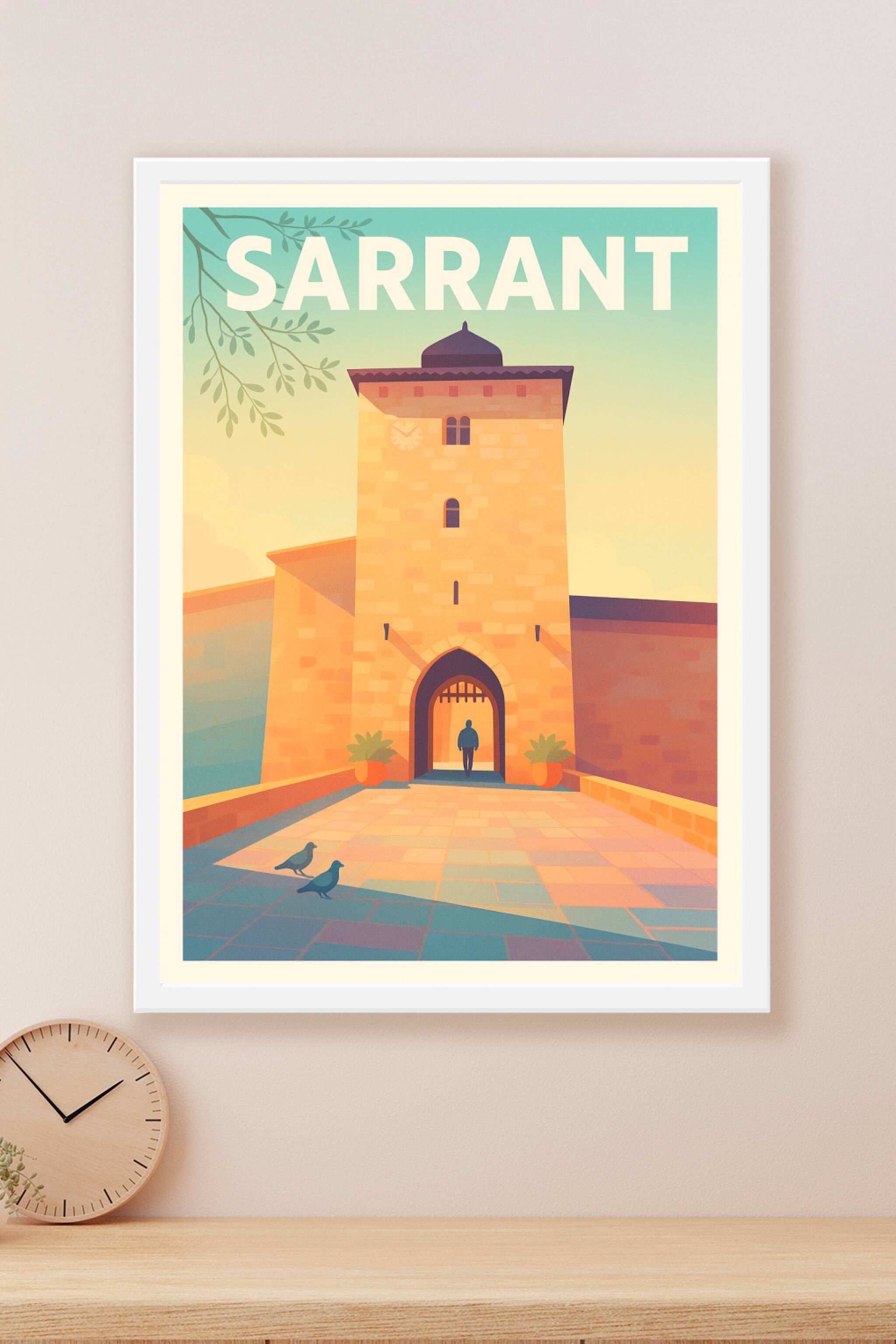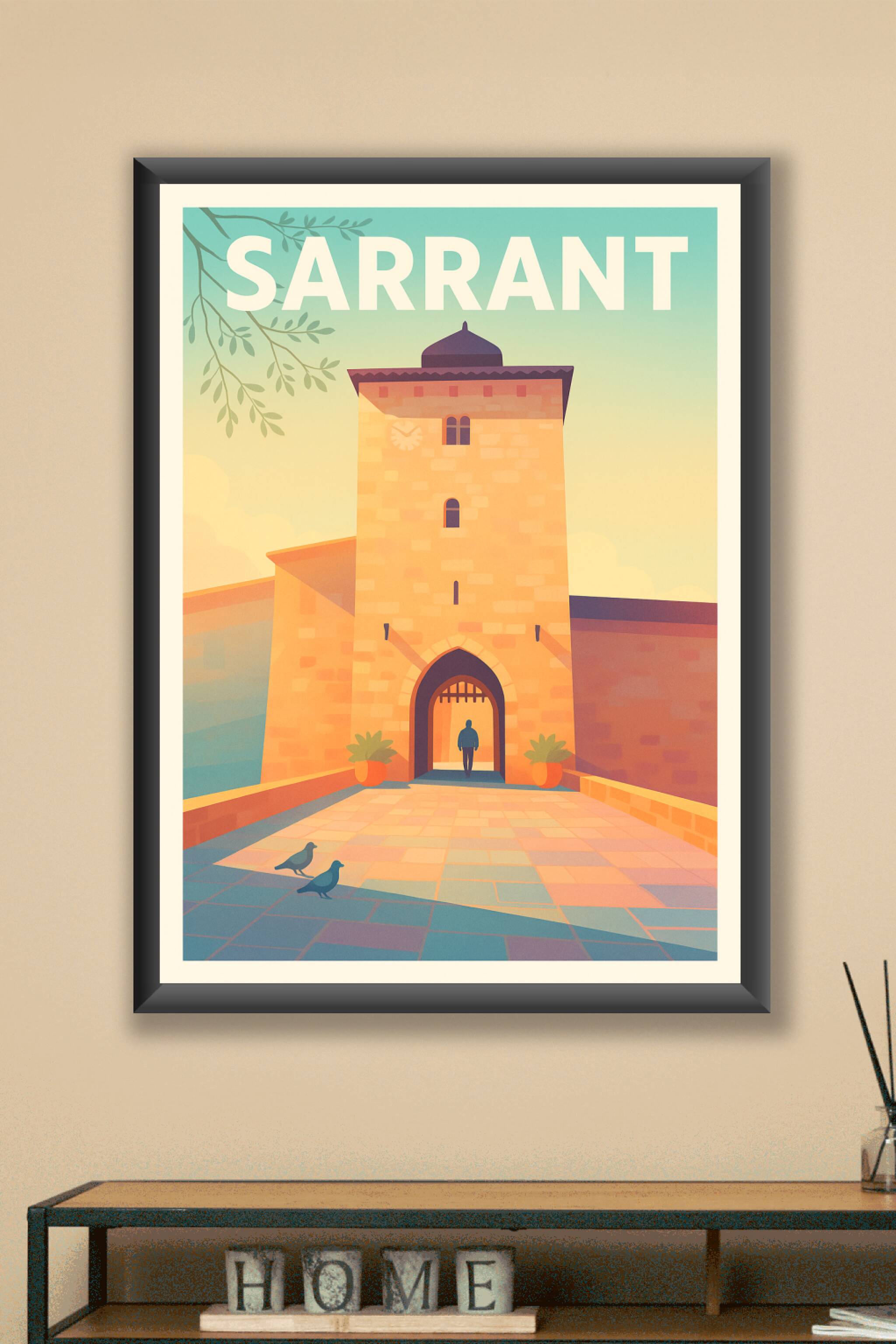 Découvrez l'atmosphère unique de Sarrant avec cette affiche au style illustratif doux qui met en valeur une architecture médiévale emblématique de ...
