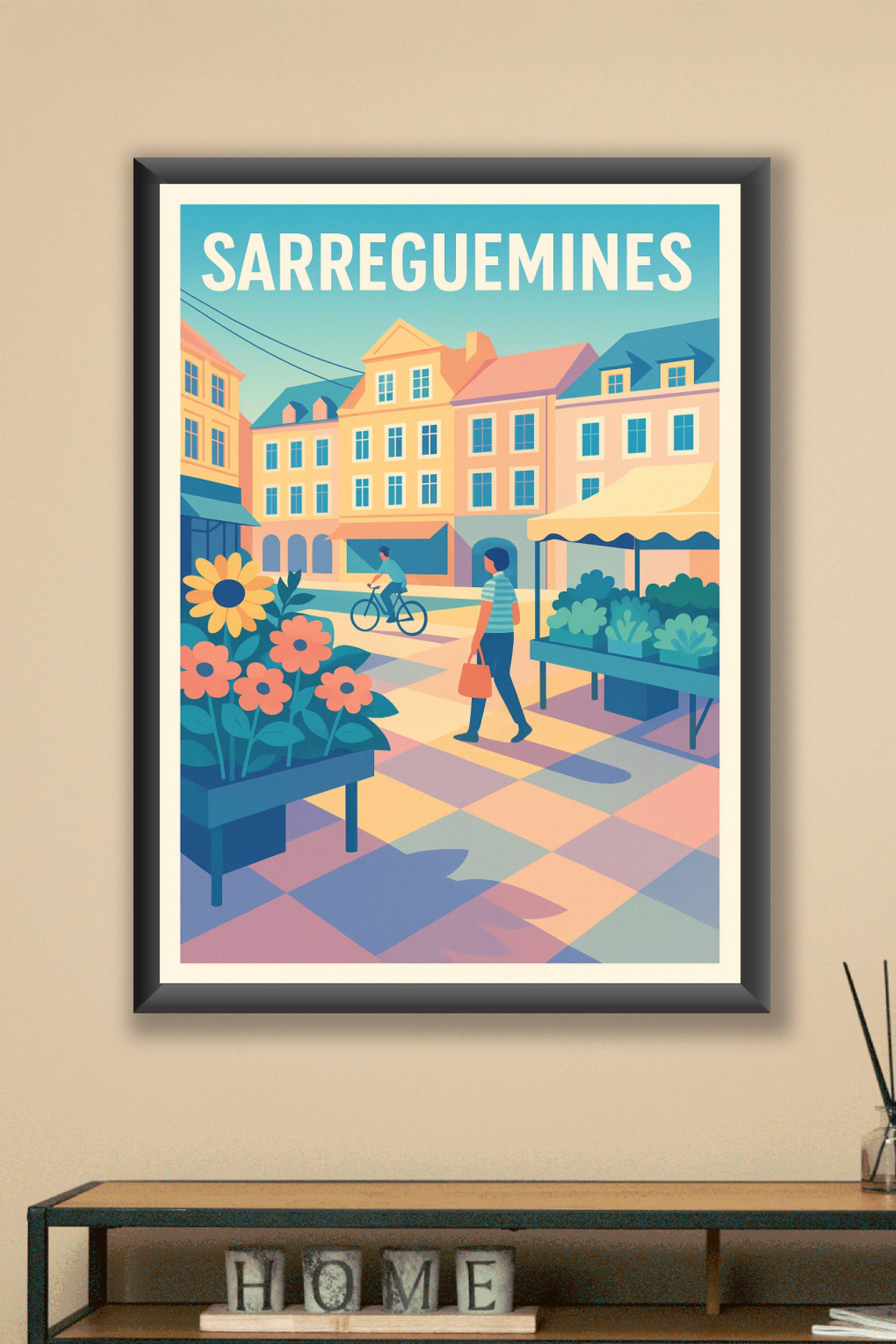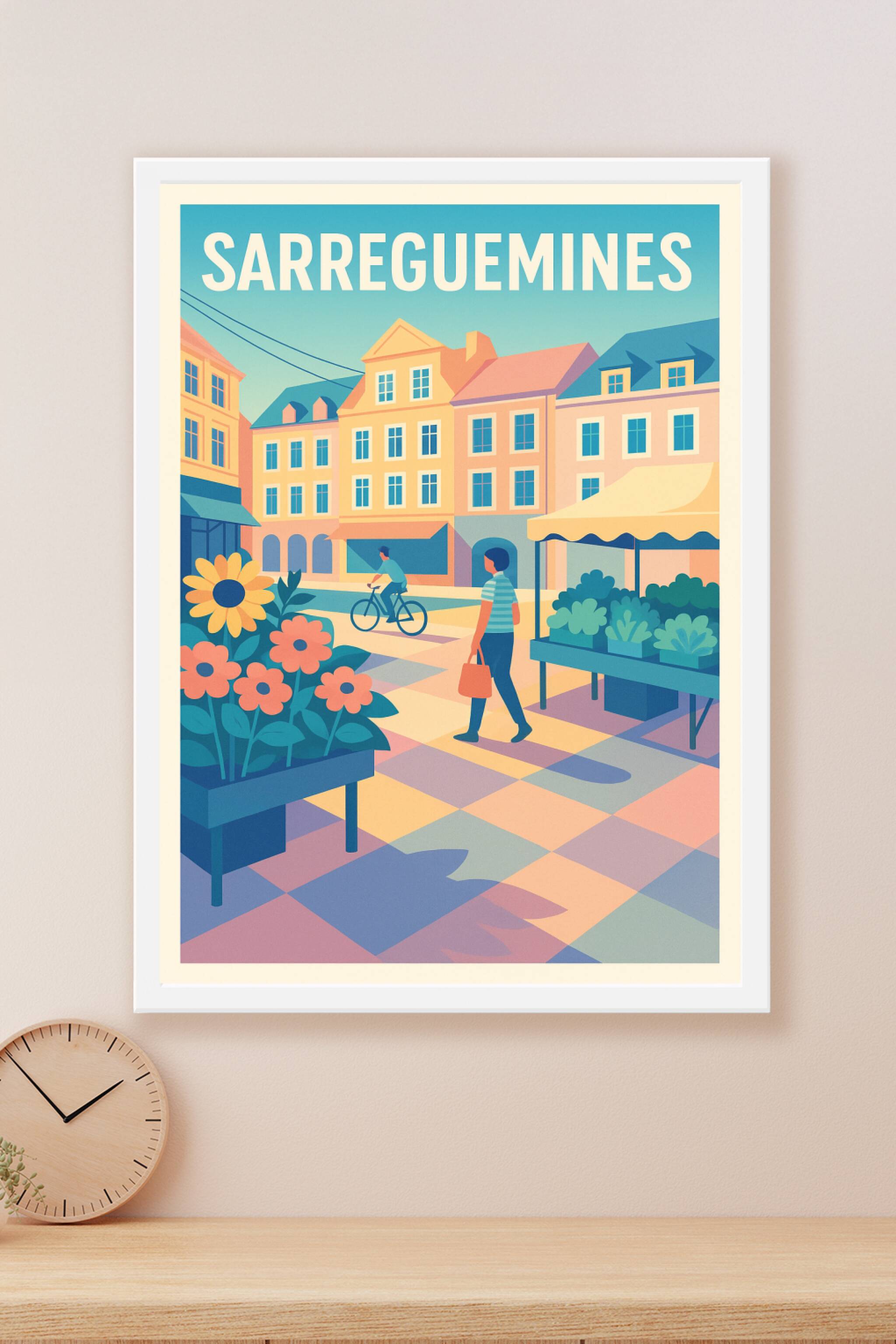 Découvrez l'ambiance chaleureuse et colorée de Sarreguemines avec cette affiche illustrée mettant en scène une place animée et fleurie, typique de la ville. Ce poster au style graphique moderne capture le quotidien paisible et charmant de ses rues pavées où les habitants flânent et profitent du marché local.Cette affiche est imprimée en tirage "Fine Art" sur papier 305g coton, garantissant une qualité d'impression exceptionnelle, des couleurs éclatantes et une durabilité optimale. Disponible en plusieurs formats allant de A1 à A4, avec ou sans cadre, ce poster s'adapte parfaitement à votre décoration intérieure ou à une idée cadeau originale.Profitez d'un savoir-faire artisanal français pour apporter une touche d'élégance et de convivialité à votre intérieur grâce à cette superbe affiche de Sarreguemines.