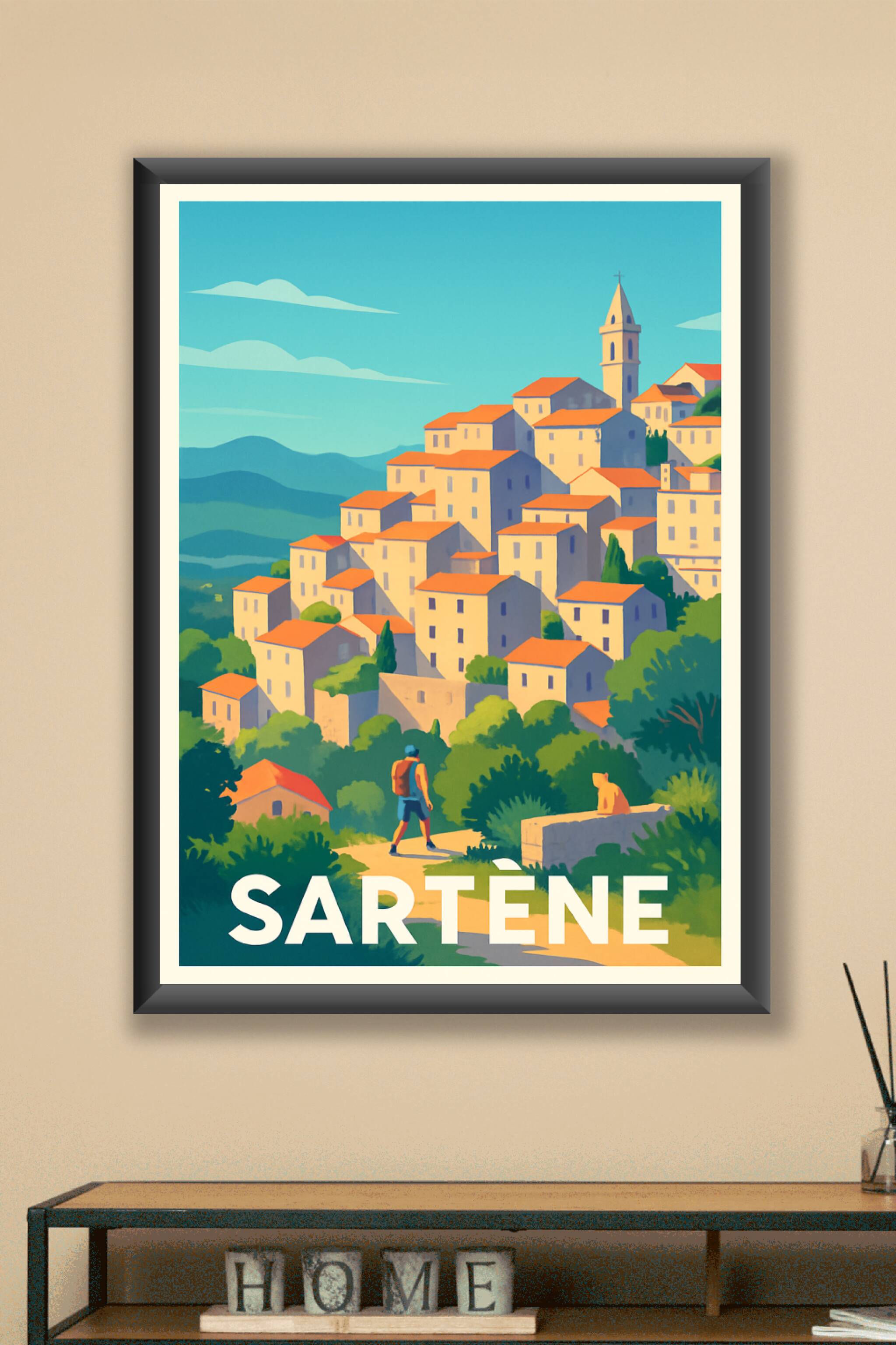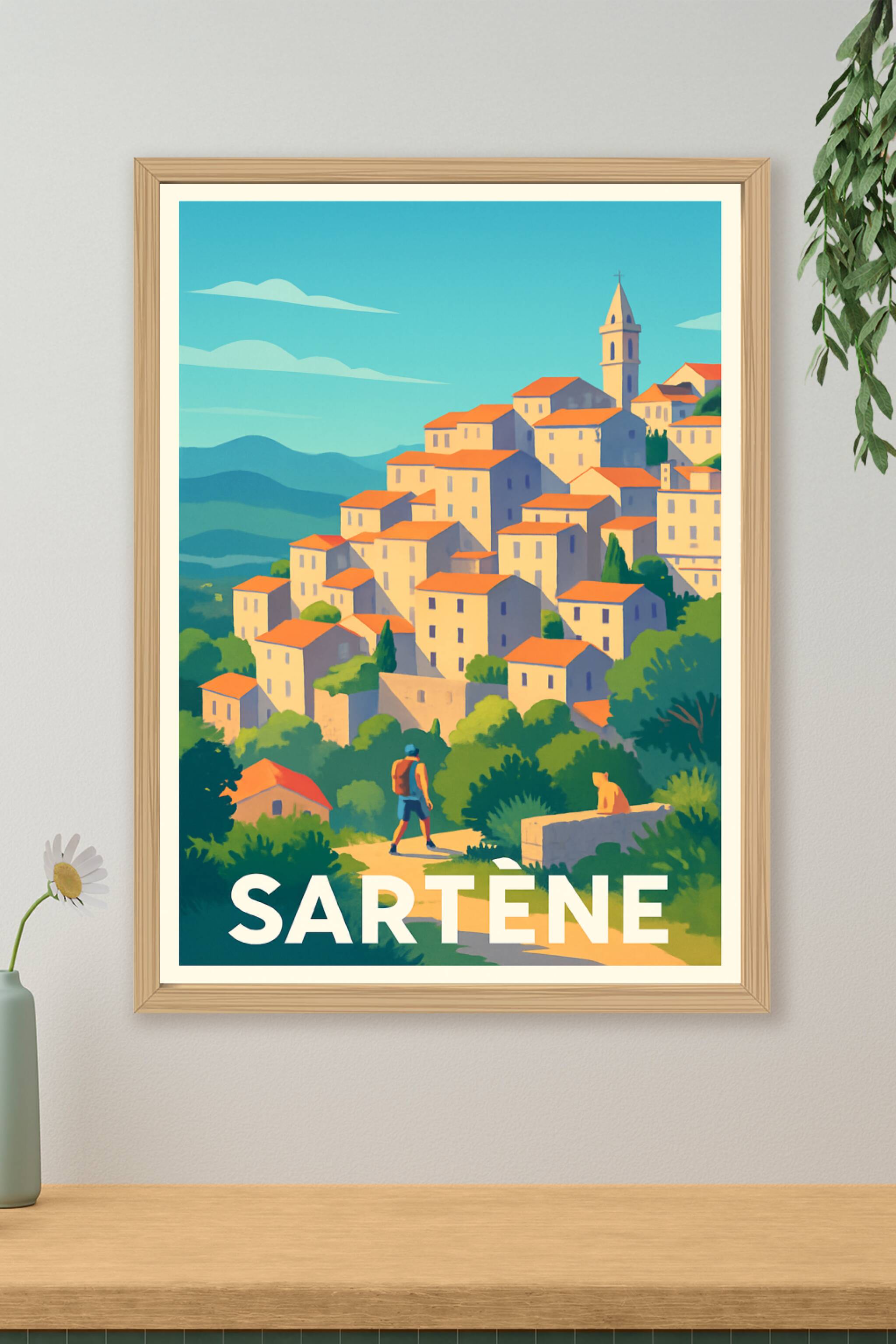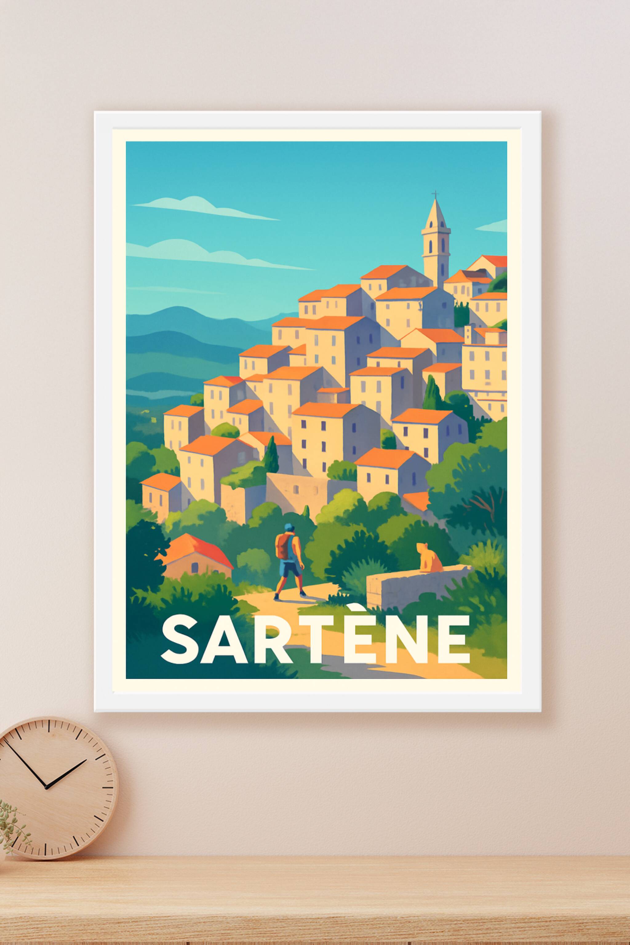 Découvrez la beauté pittoresque de Sartène avec cette affiche illustrée qui capture l'essence typique de ce village corse, ses maisons aux toits ro...
