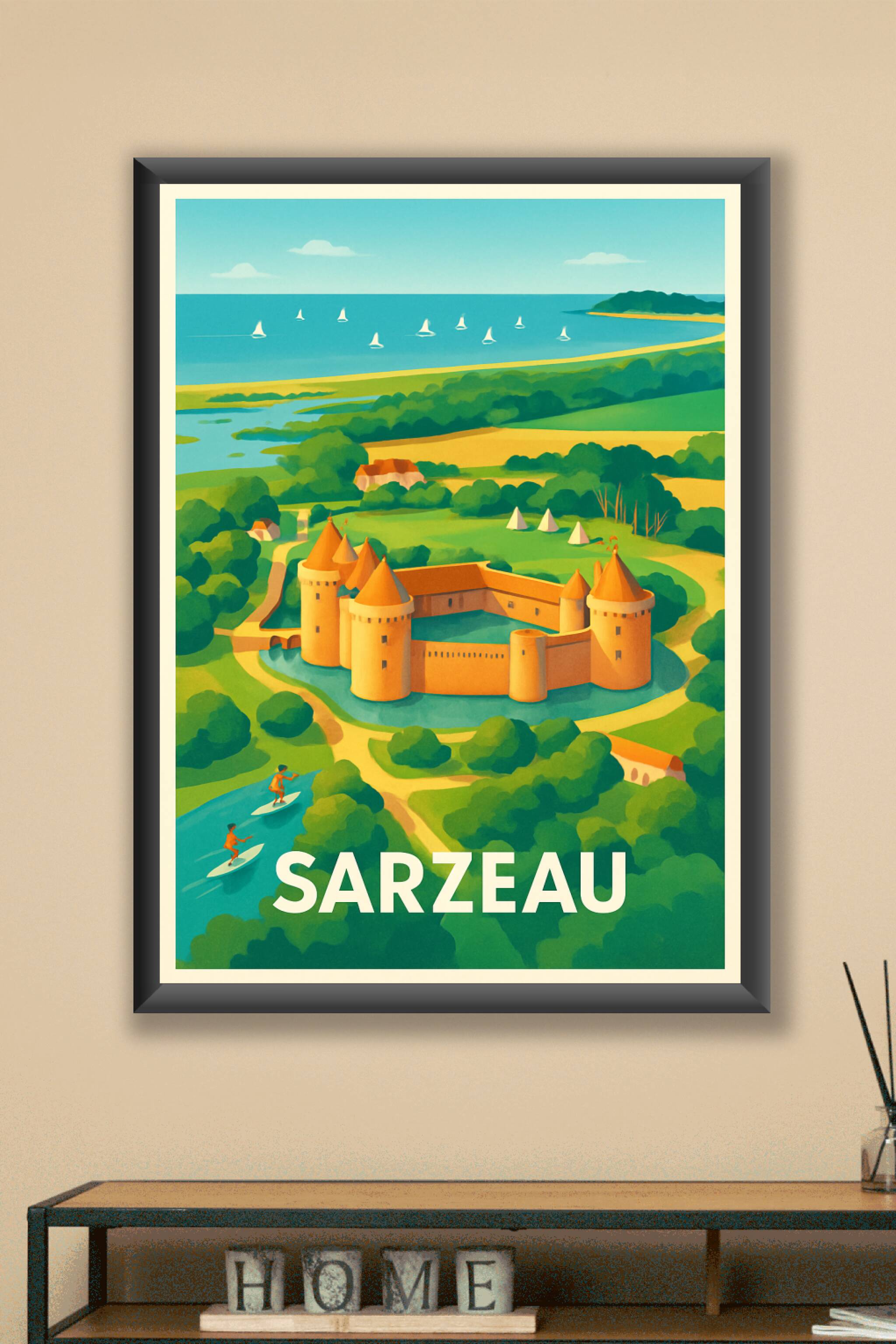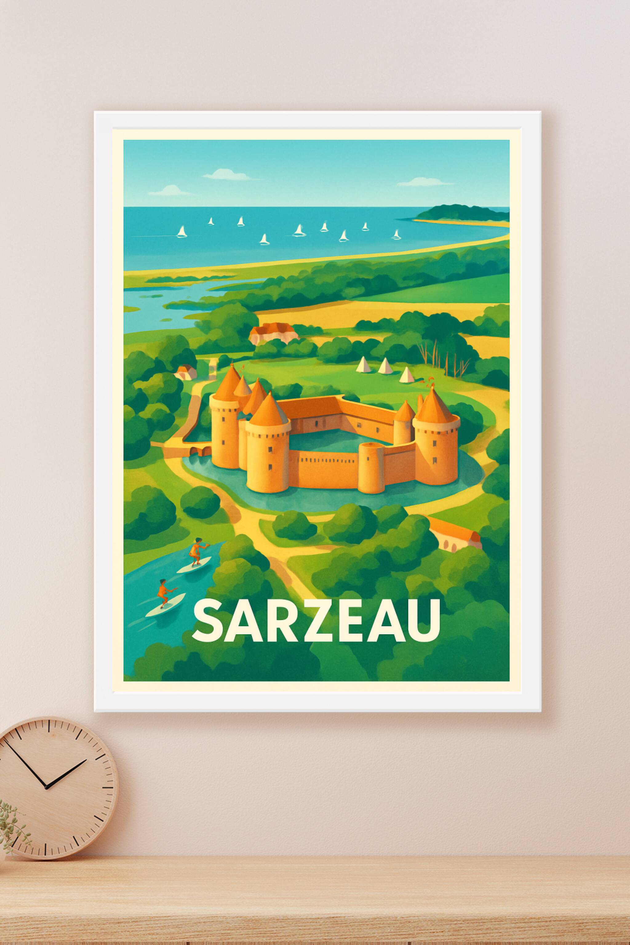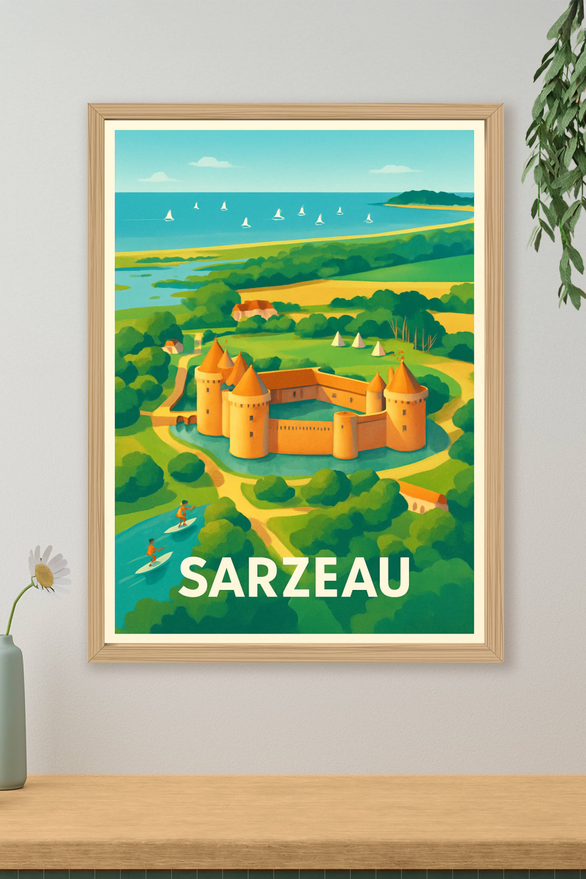 Découvrez la beauté unique de Sarzeau avec cette affiche représentant son emblématique château entouré de verdure luxuriante et de la douceur de la...