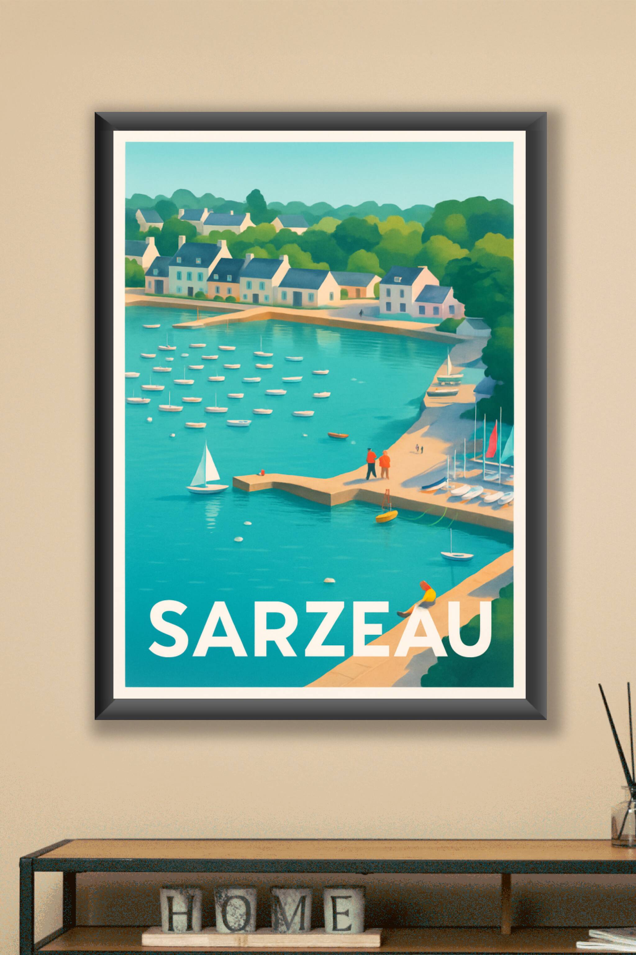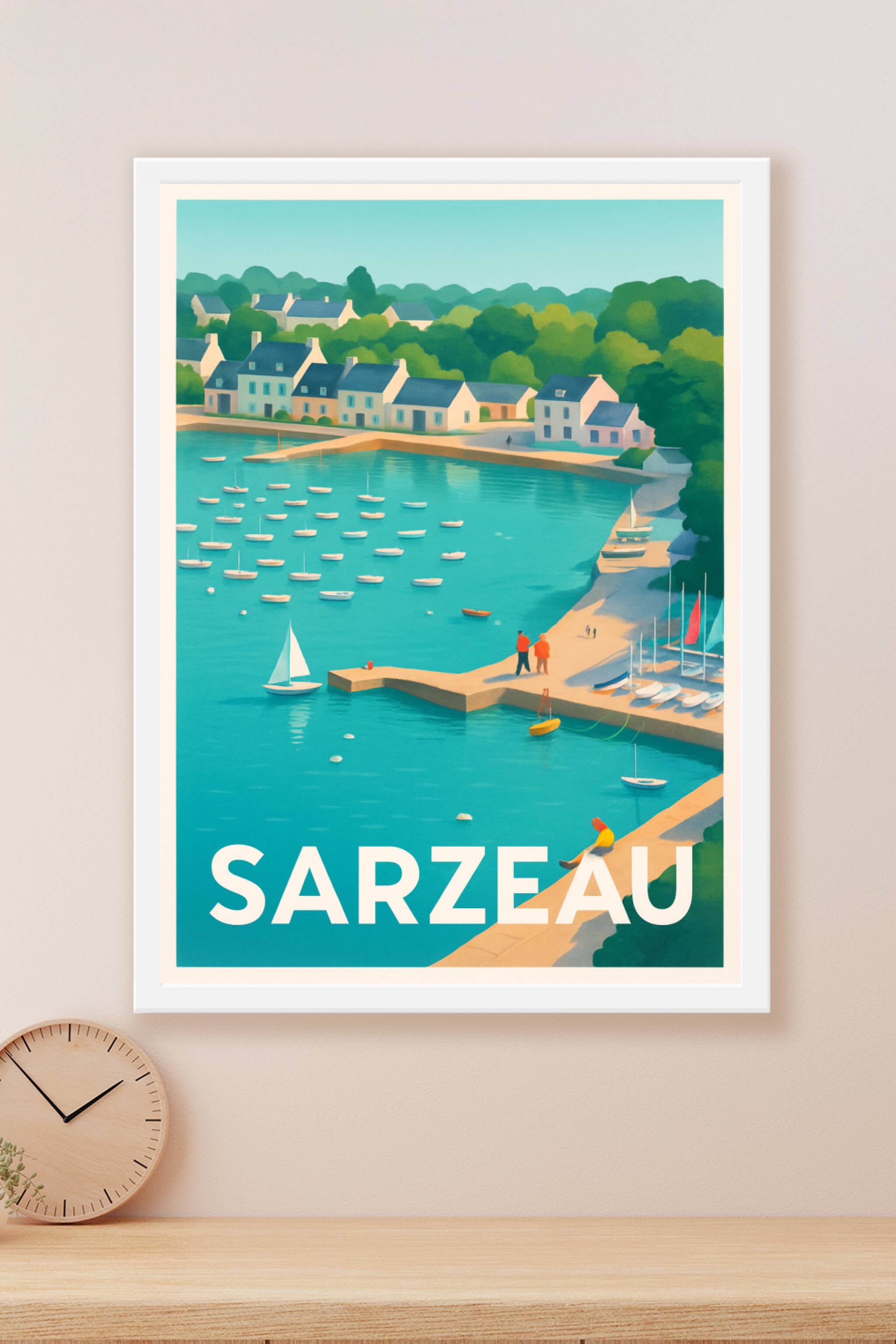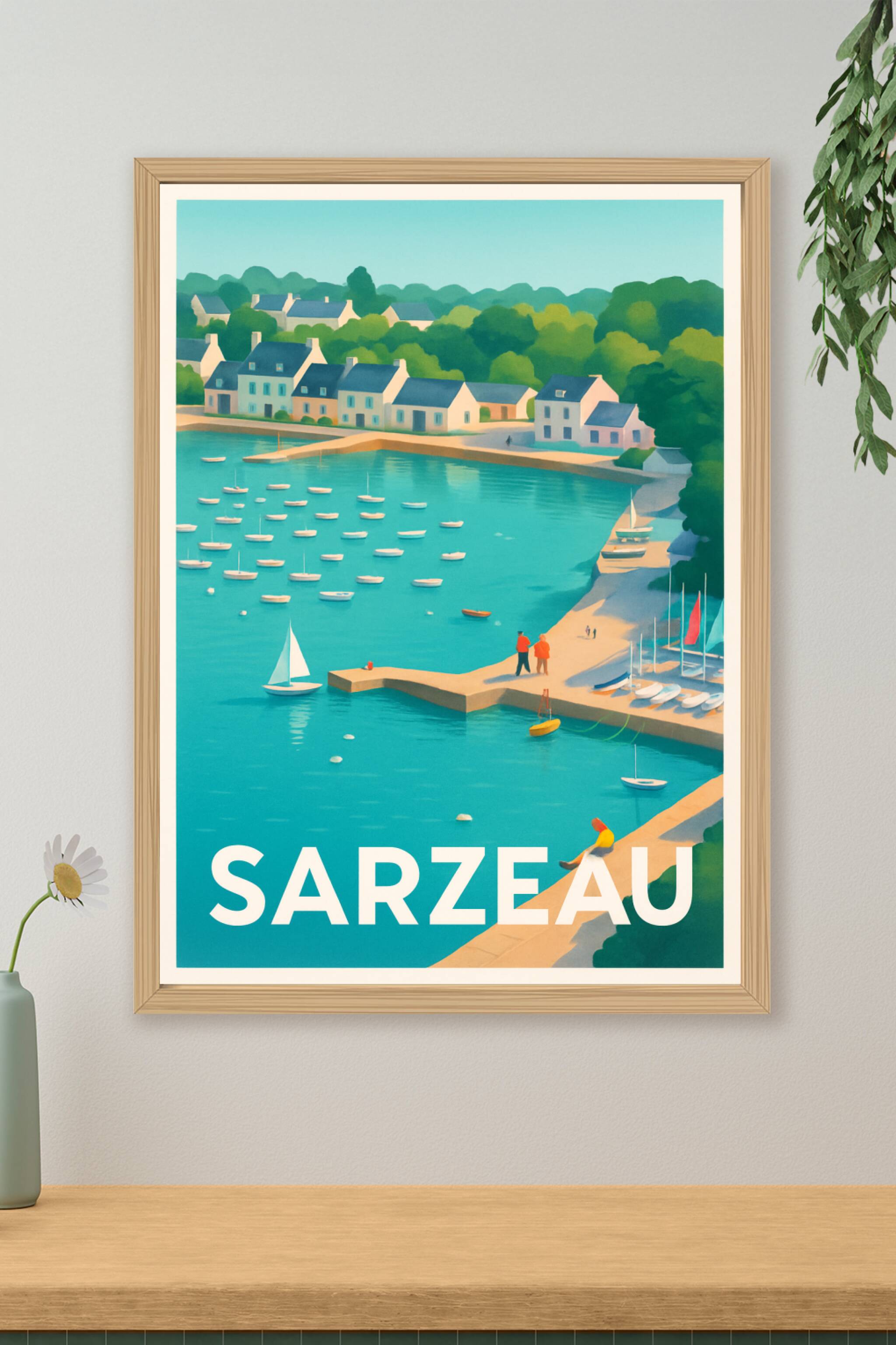 Découvrez la quiétude de Sarzeau à travers cette superbe affiche illustrée, mettant en scène son charmant port et ses maisons traditionnelles baign...
