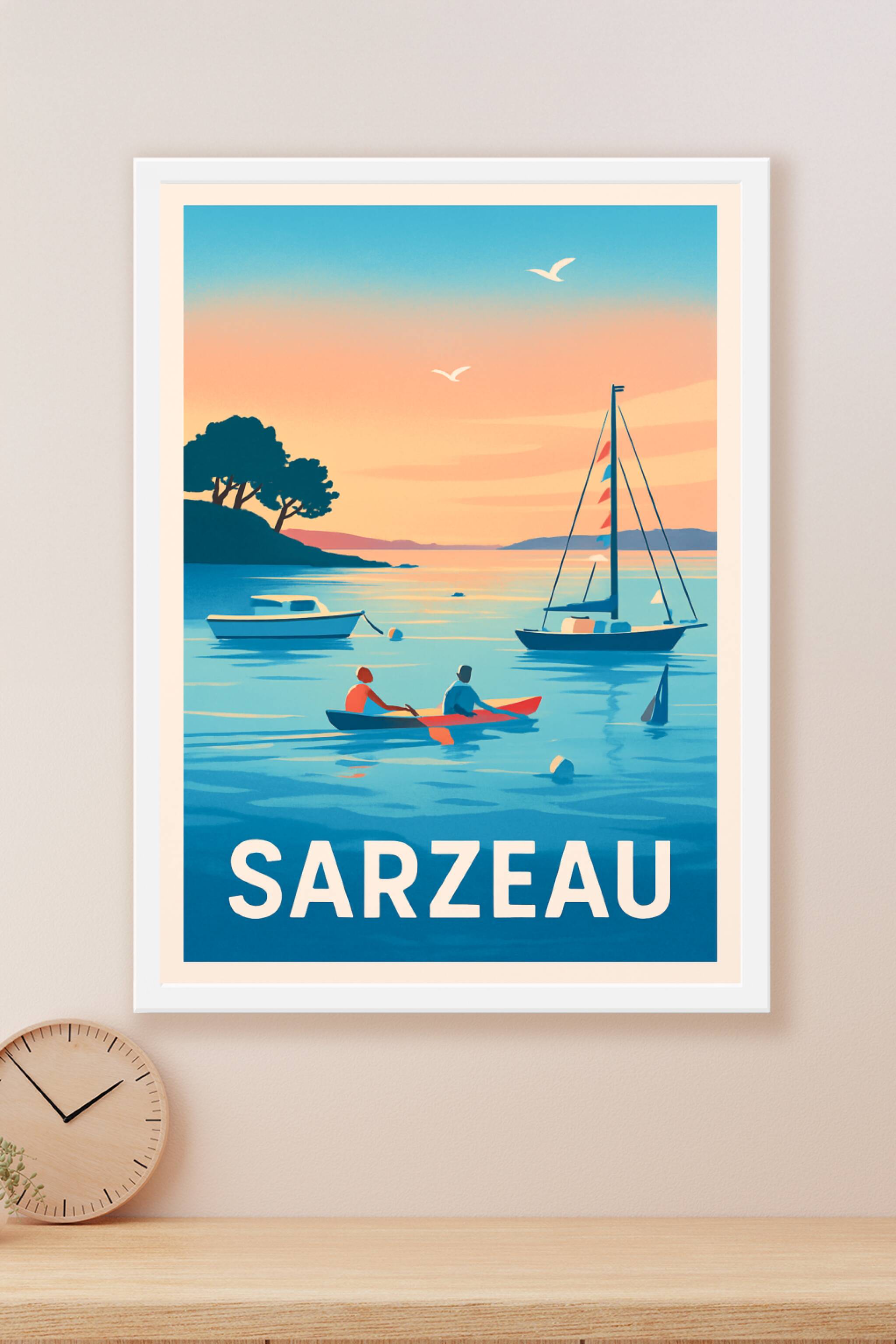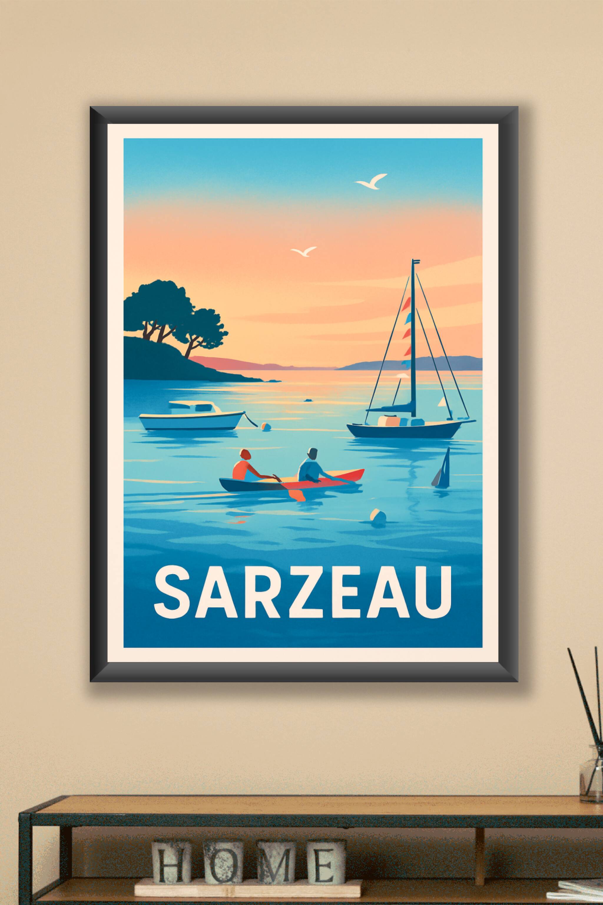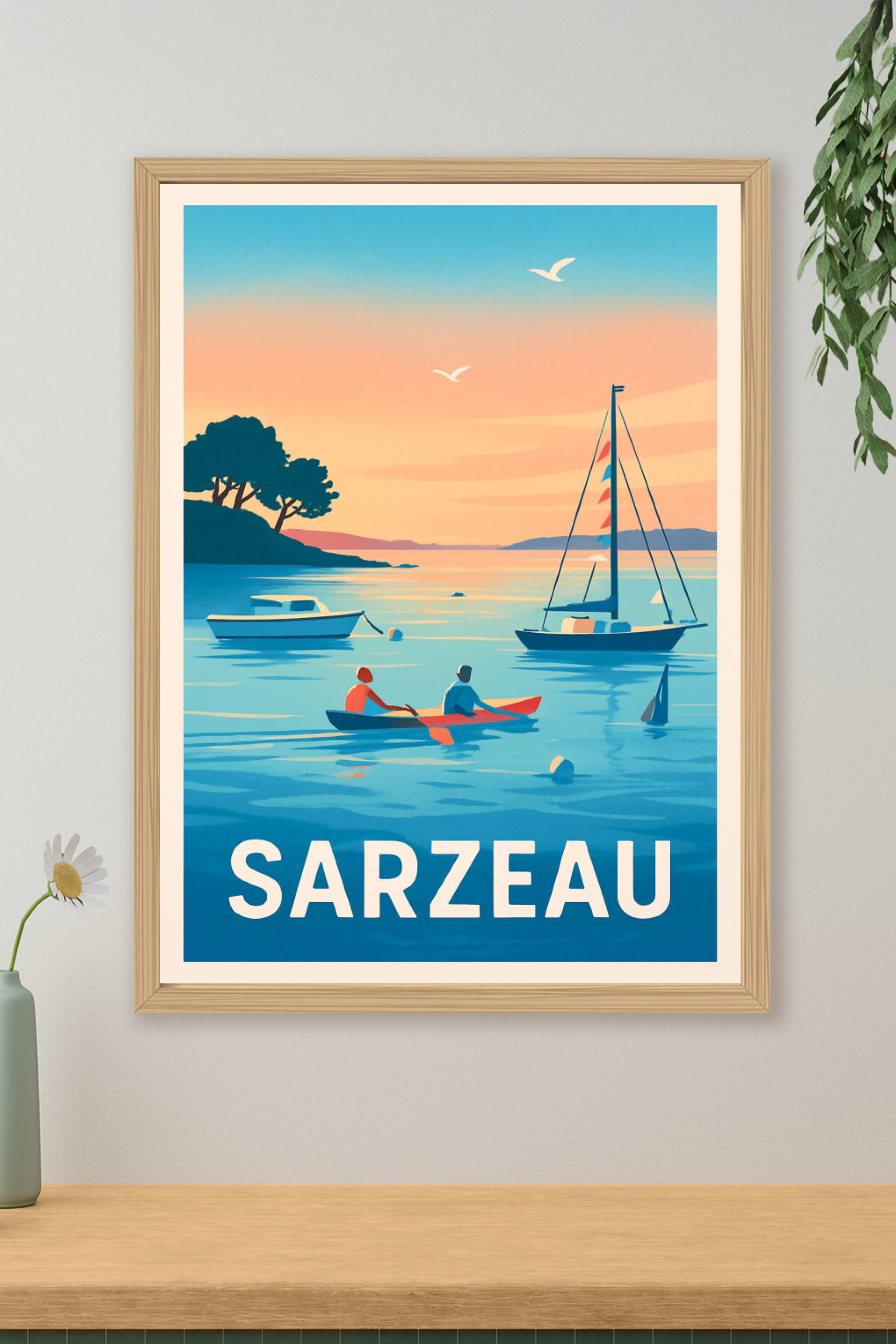 Découvrez la douceur de vivre à Sarzeau avec cette affiche envoûtante illustrant un coucher de soleil paisible sur l'eau, où voiliers et barques co...