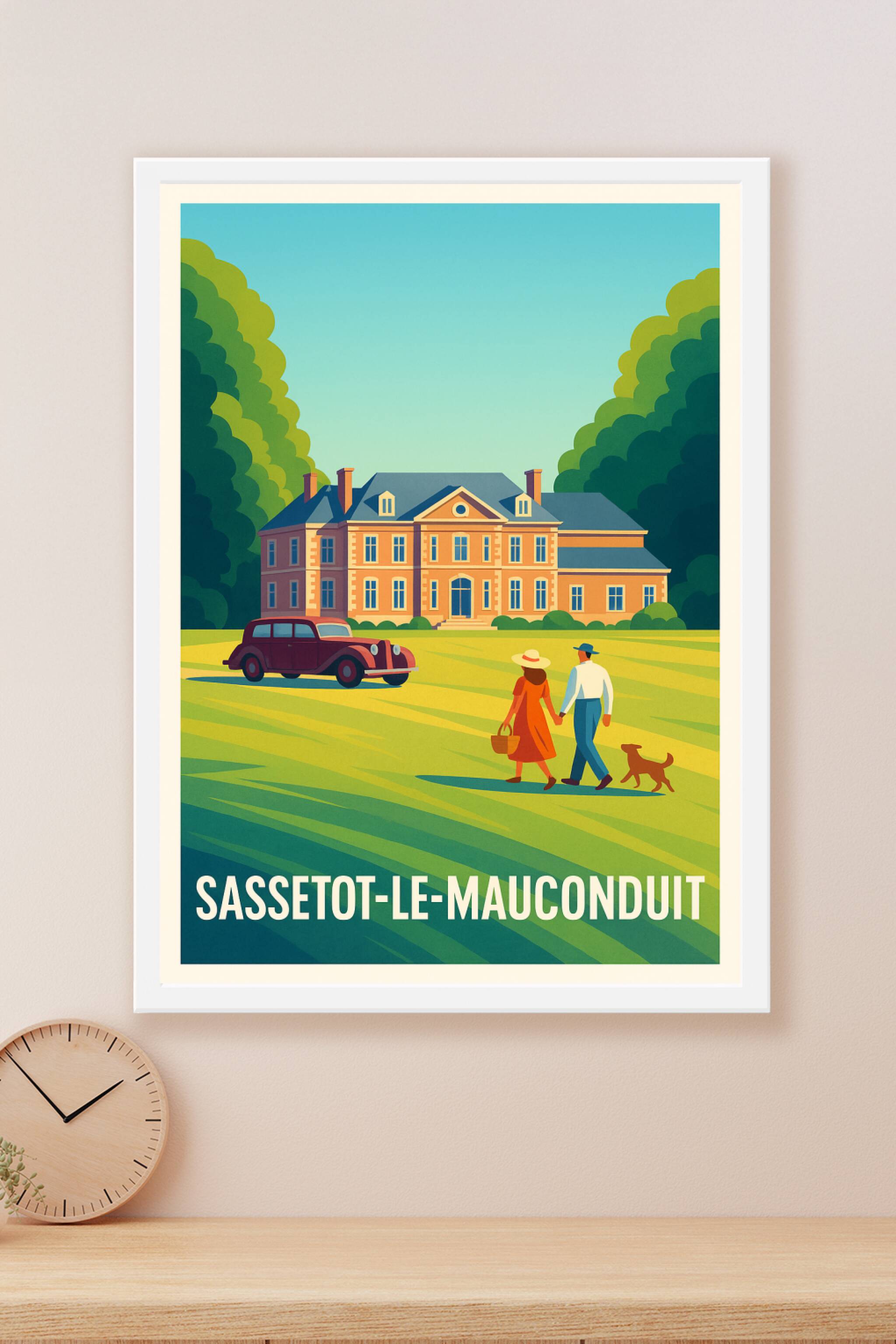 Découvrez l'atmosphère bucolique et raffinée de Sassetot-le-Mauconduit avec cette affiche illustrée au style vintage. Cette scène paisible met en a...