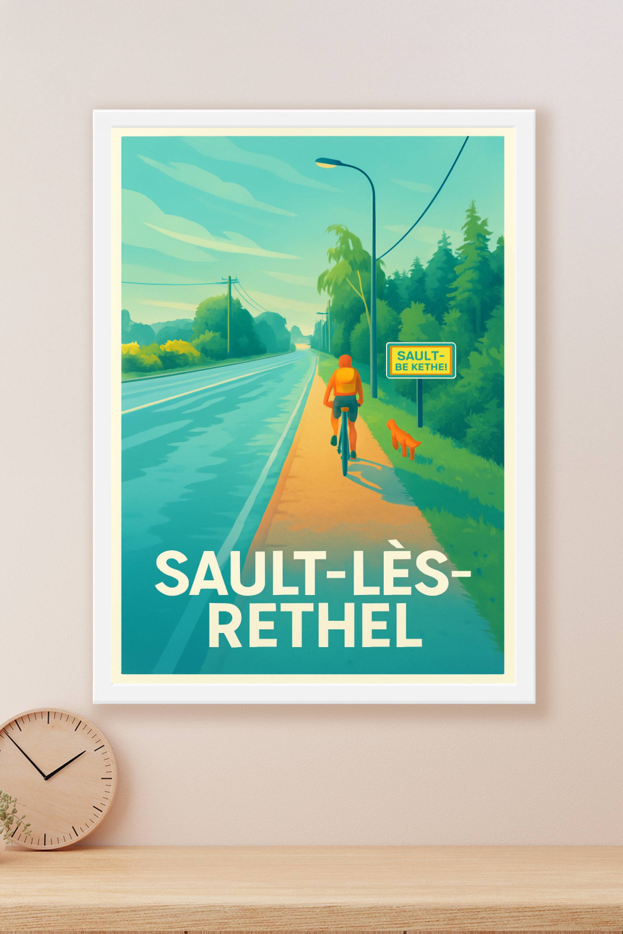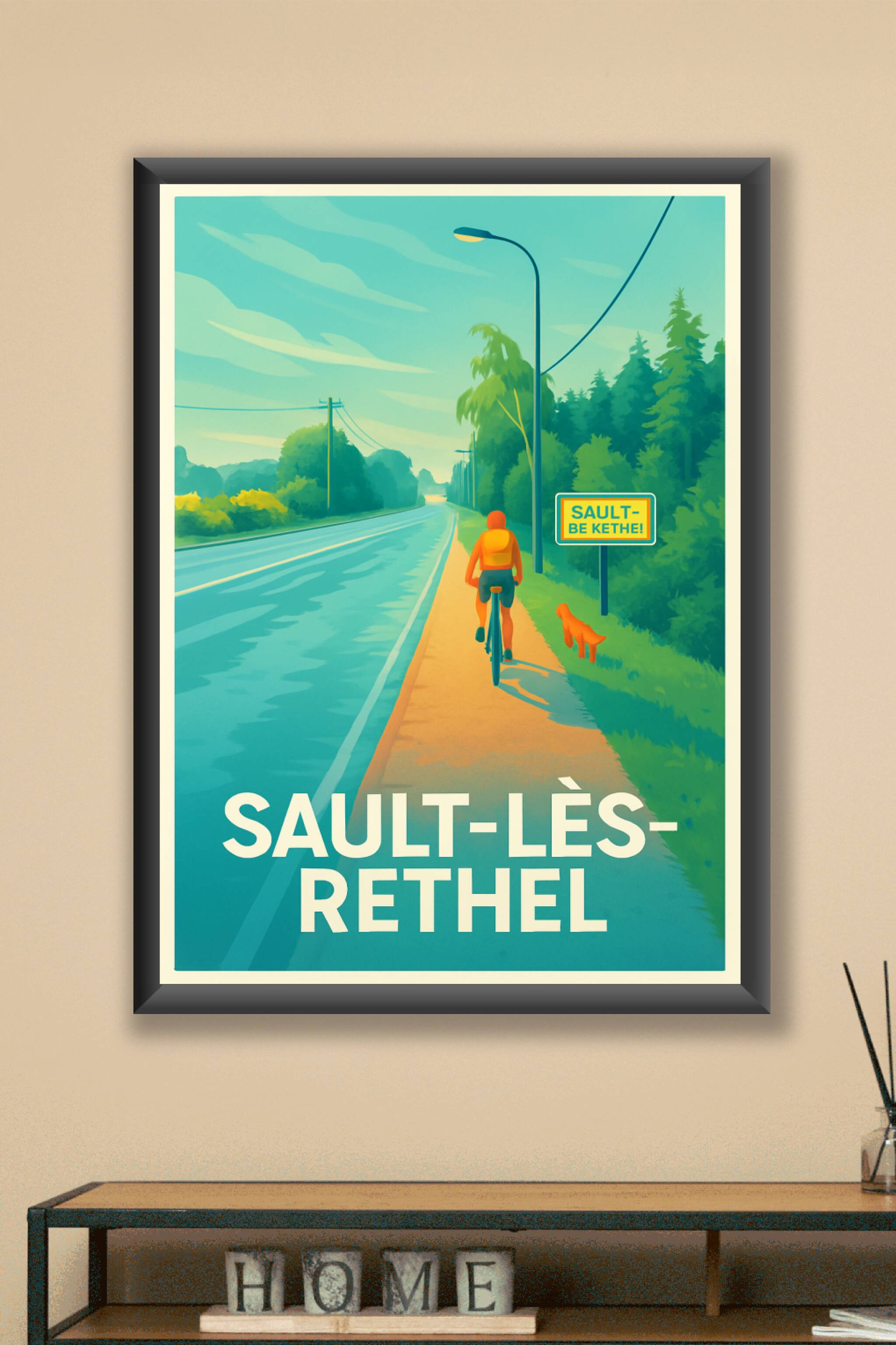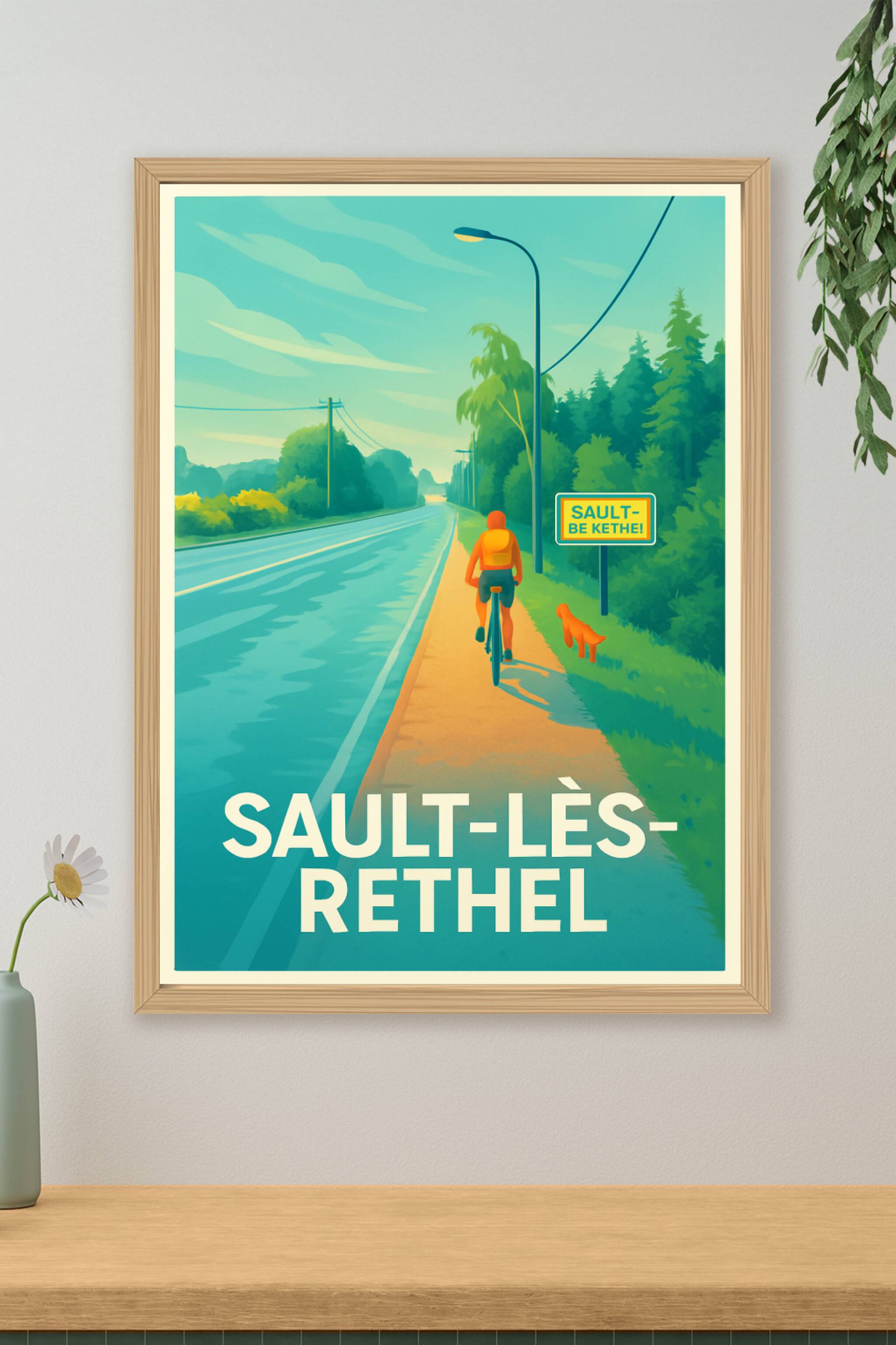 Découvrez l'esprit de Sault-lès-Rethel avec cette affiche qui capture la sérénité d'une balade à vélo en pleine campagne, accompagnée de votre fidè...