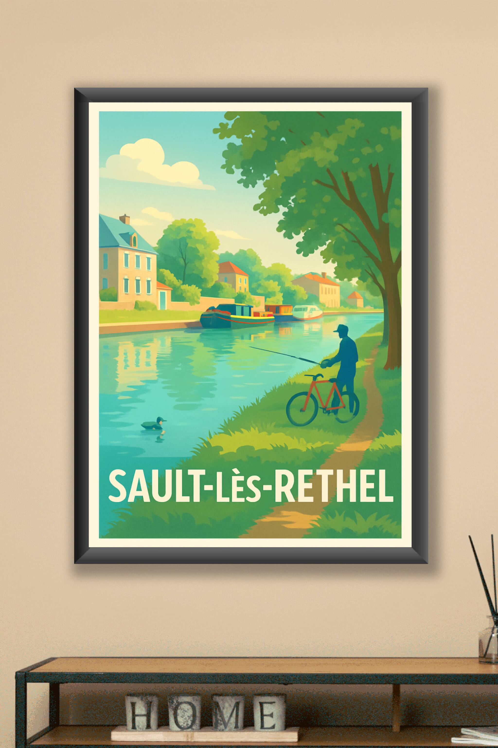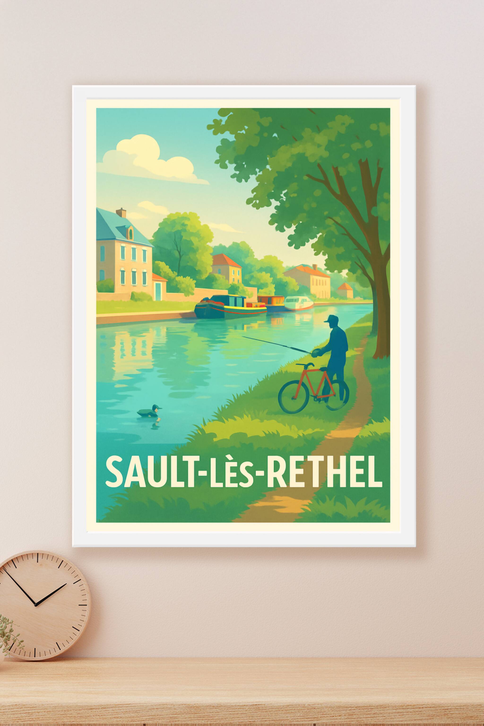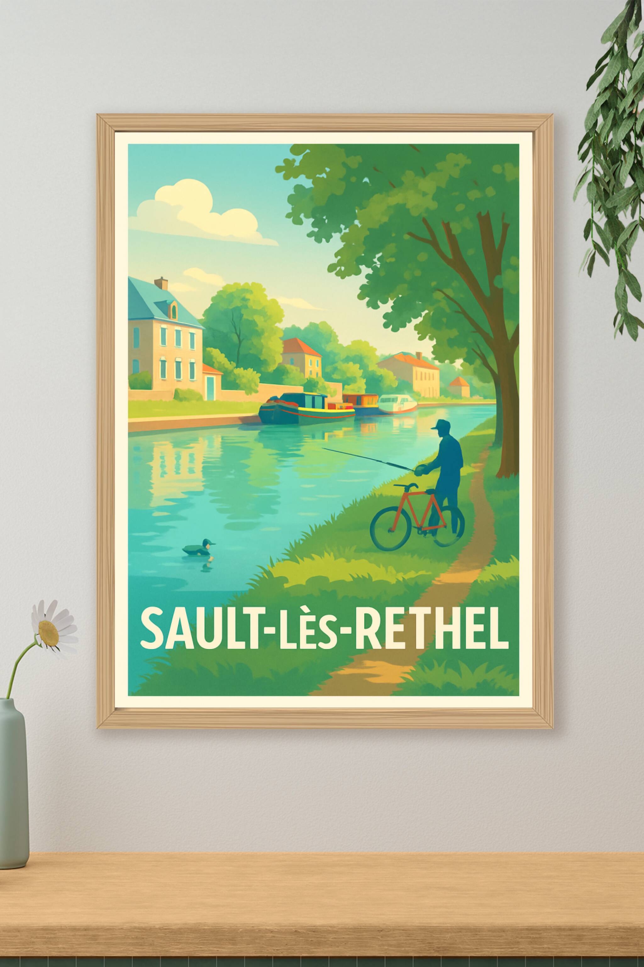 Découvrez la douceur de vivre de Sault-lès-Rethel avec cette affiche illustrée mettant en scène un paysage paisible au bord du canal, où un pêcheur...