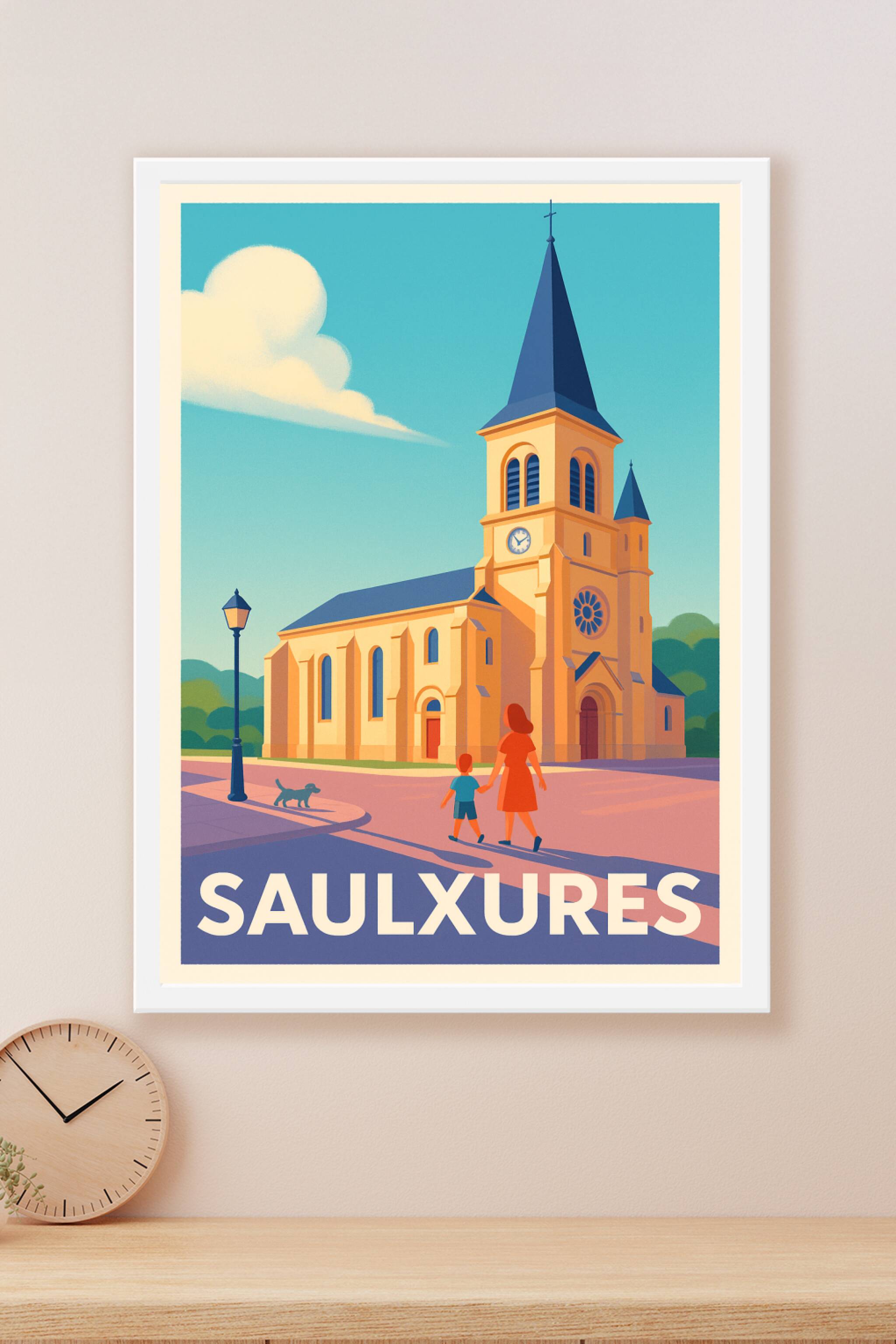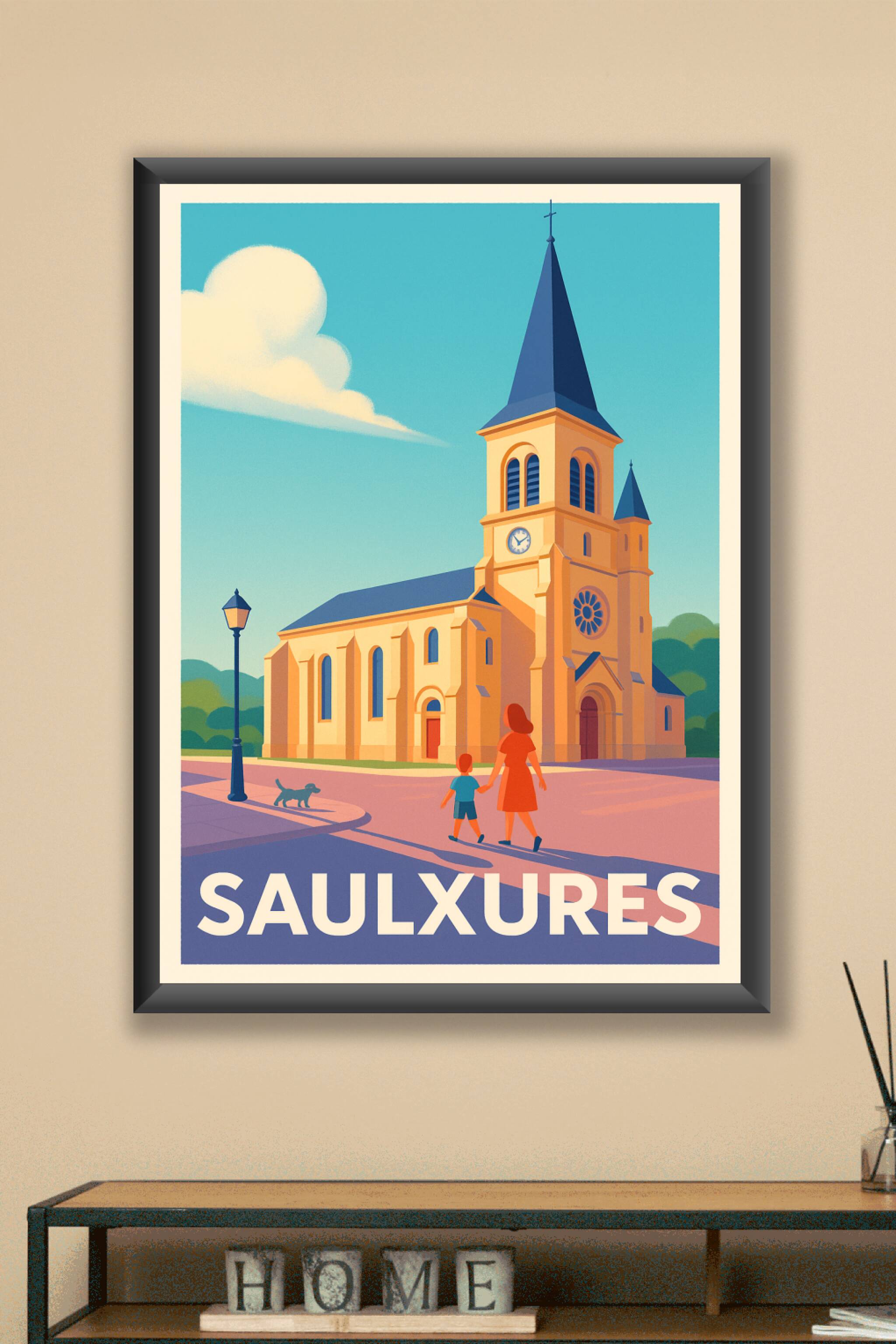 Découvrez le charme intemporel de Saulxures à travers cette affiche illustrée évoquant une scène paisible devant l'église emblématique de la ville....
