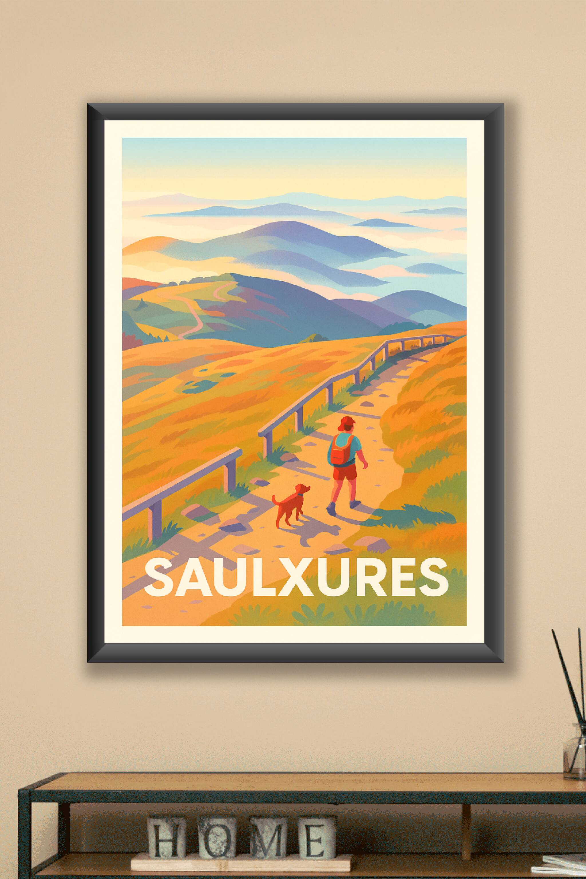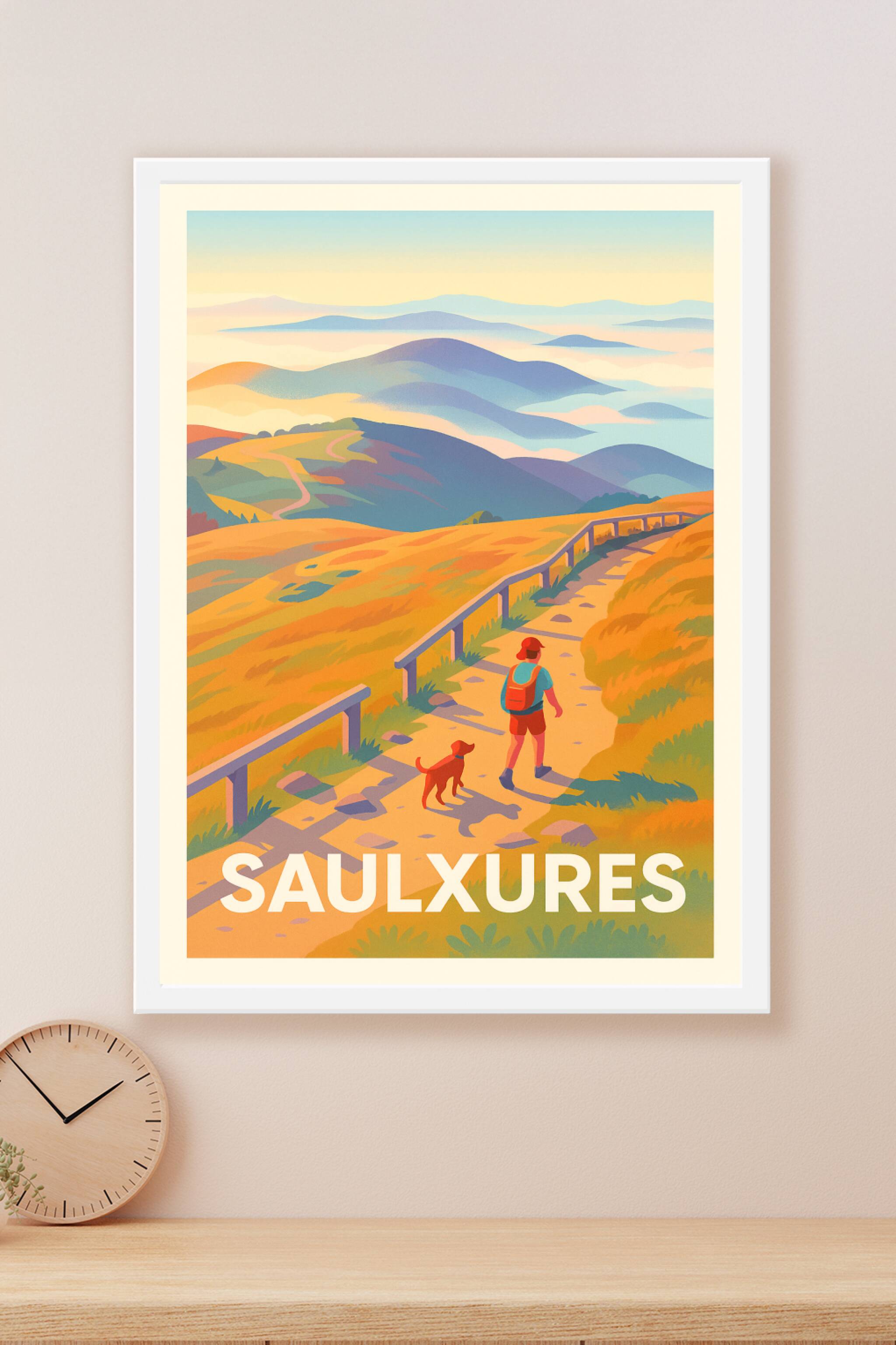Découvrez la sérénité des paysages vallonnés de Saulxures avec cette affiche illustrant une promenade en montagne au lever du jour. Le chemin calme...
