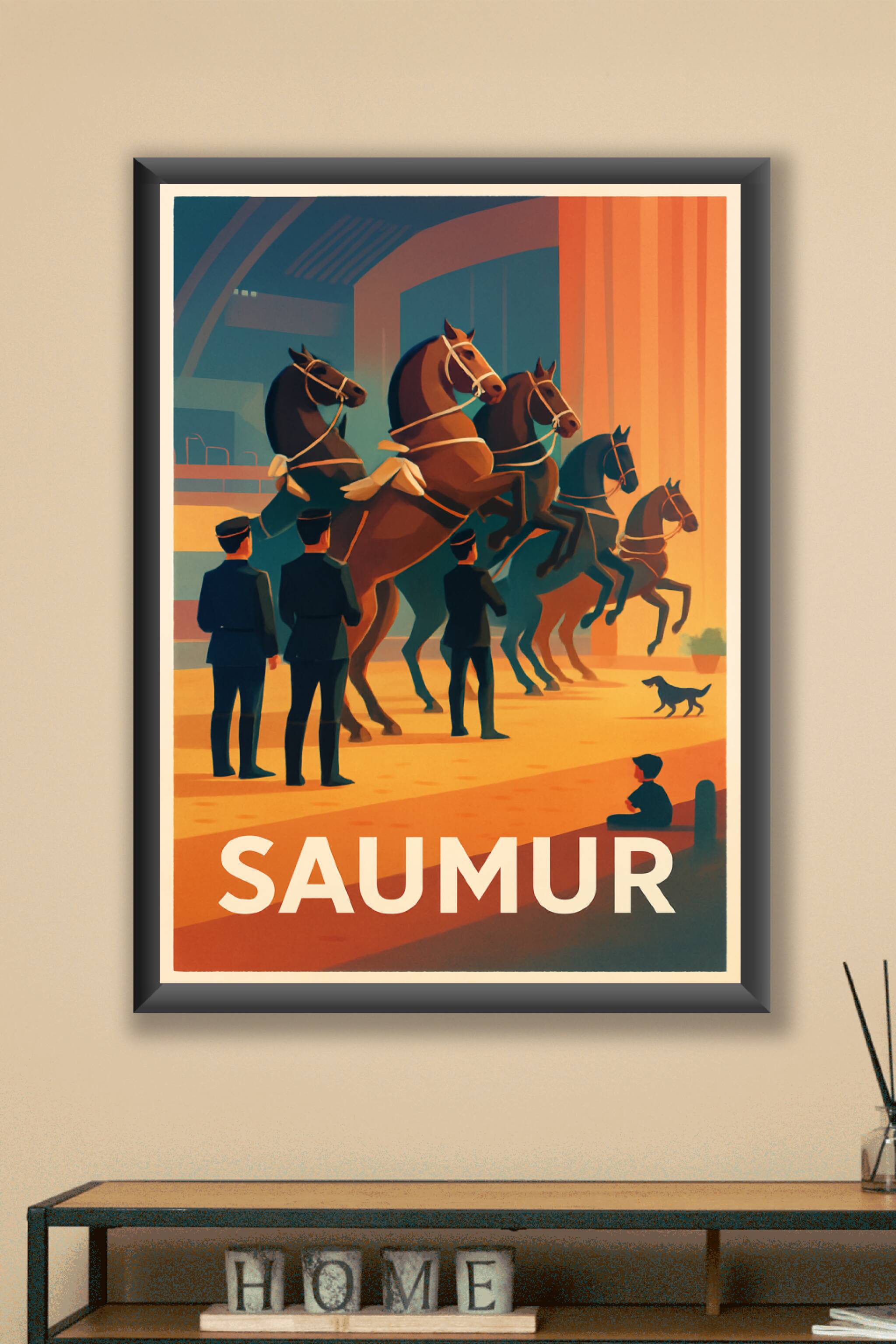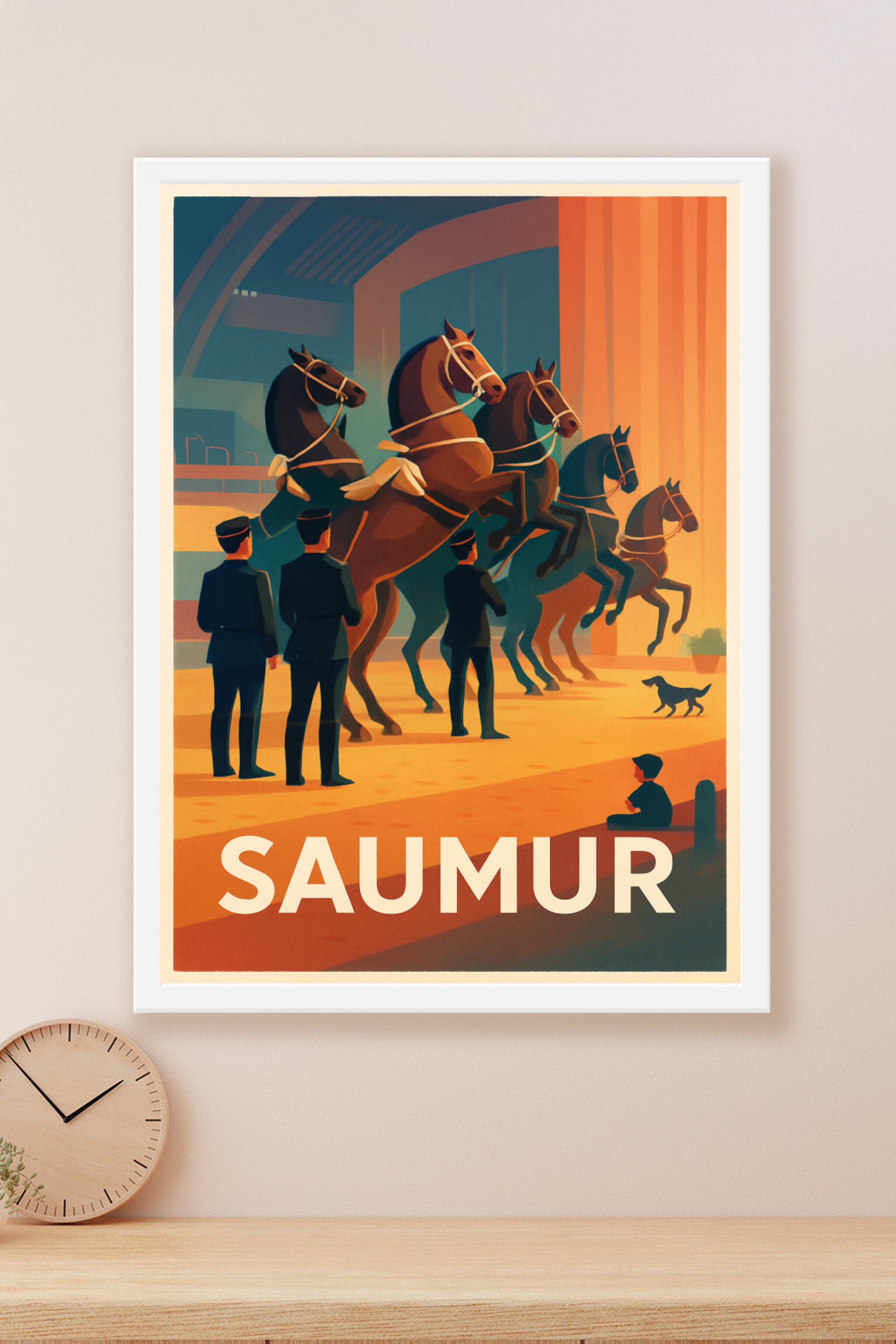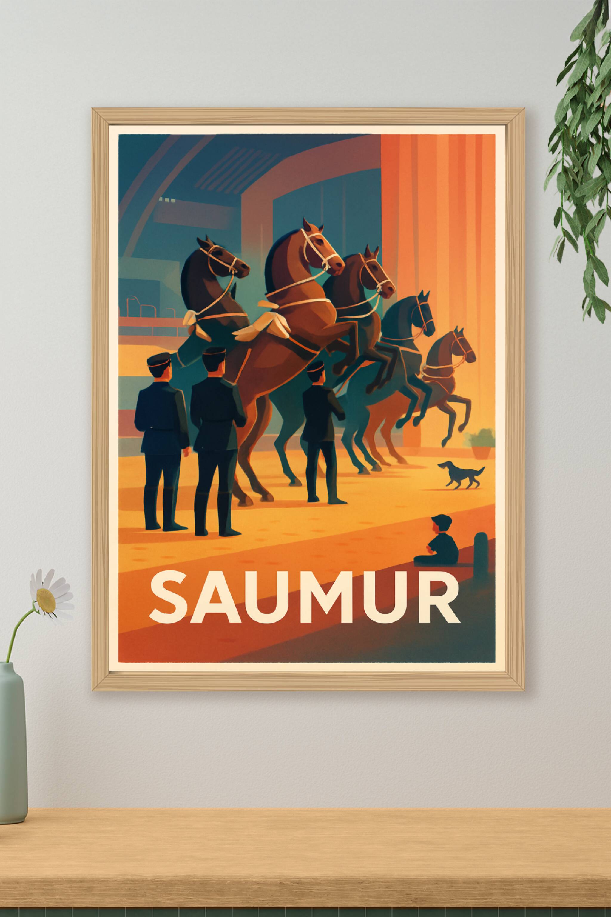 Découvrez l'art équestre de Saumur capturé dans cette affiche au style rétro-chic, représentant la célèbre école de cavalerie dans une lumière chal...