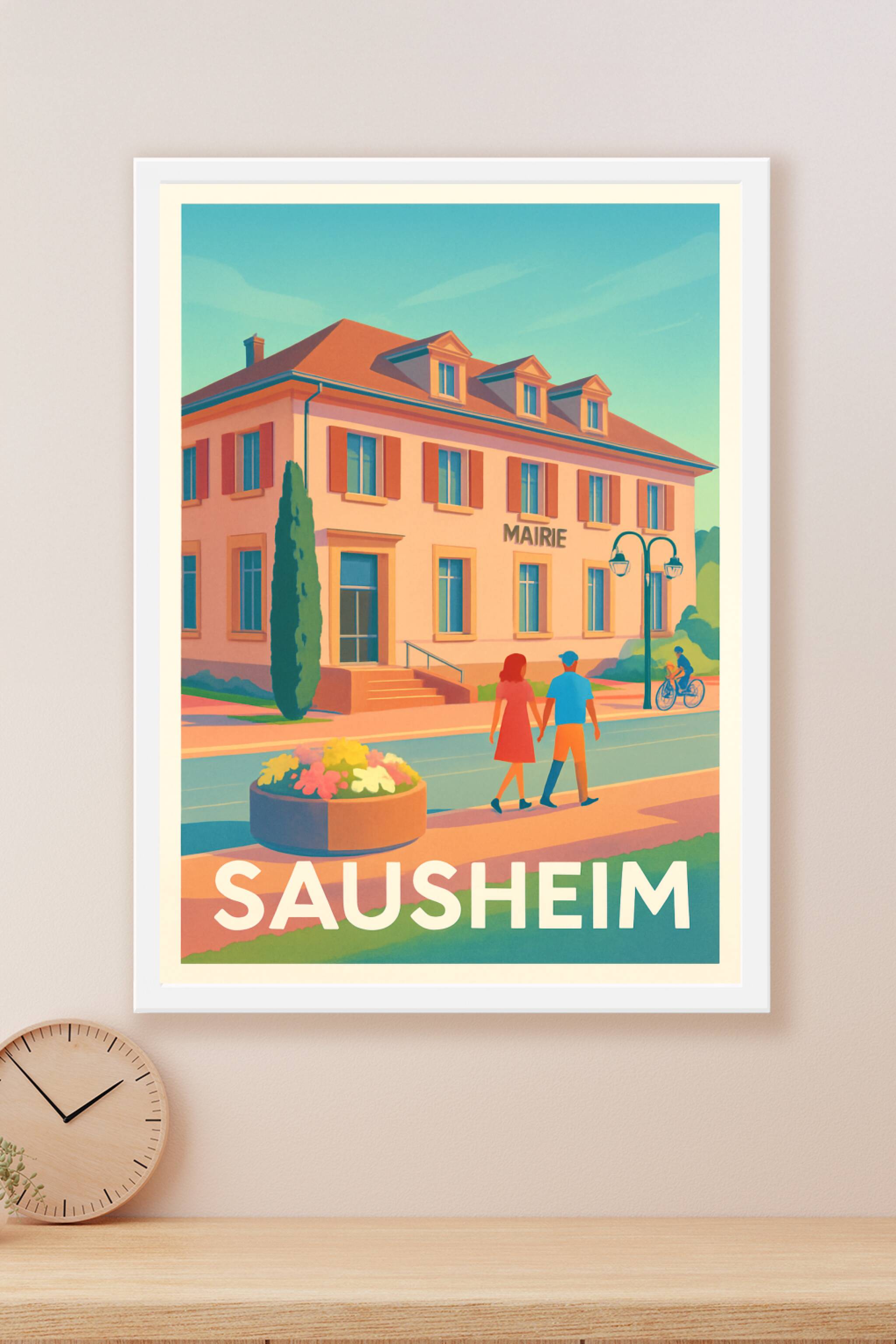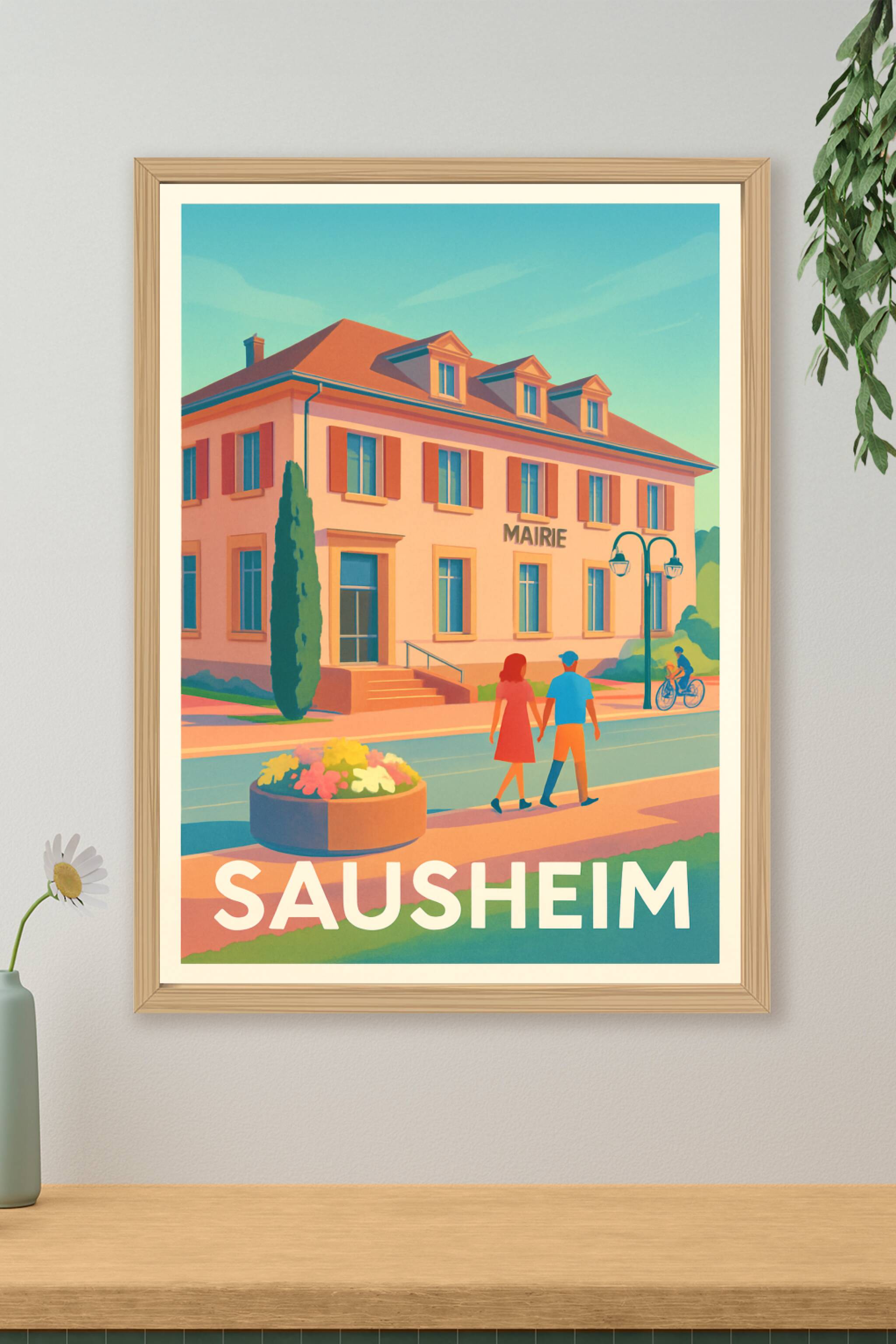 Découvrez cette affiche illustrant la mairie de Sausheim, un symbole paisible de vie locale dans une ambiance lumineuse et colorée. Ce poster au st...