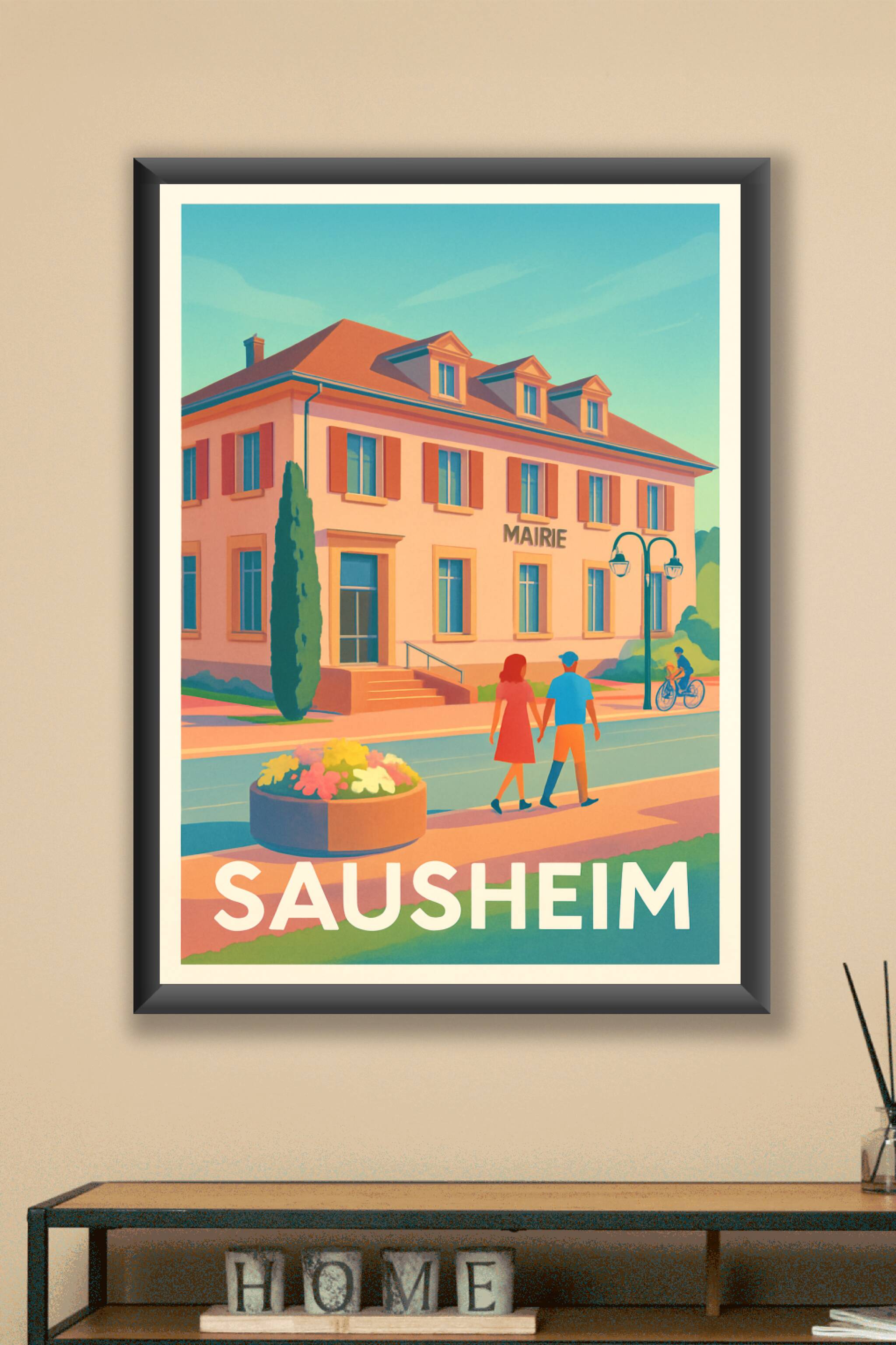 Découvrez cette affiche illustrant la mairie de Sausheim, un symbole paisible de vie locale dans une ambiance lumineuse et colorée. Ce poster au style rétro moderne capture la simplicité et l'élégance de cette ville alsacienne, avec une composition chaleureuse où des passants et un cycliste animent la scène. Disponible en tirage "Fine Art" sur papier 305g coton pour une qualité d'impression d'exception, cette affiche est proposée en formats A1, A2, A3 et A4, avec ou sans cadre au choix. Sublimez votre décoration intérieure avec ce poster d'art, fabriqué avec soin en France, parfait pour évoquer un souvenir tendre ou offrir un cadeau raffiné aux amoureux de Sausheim.