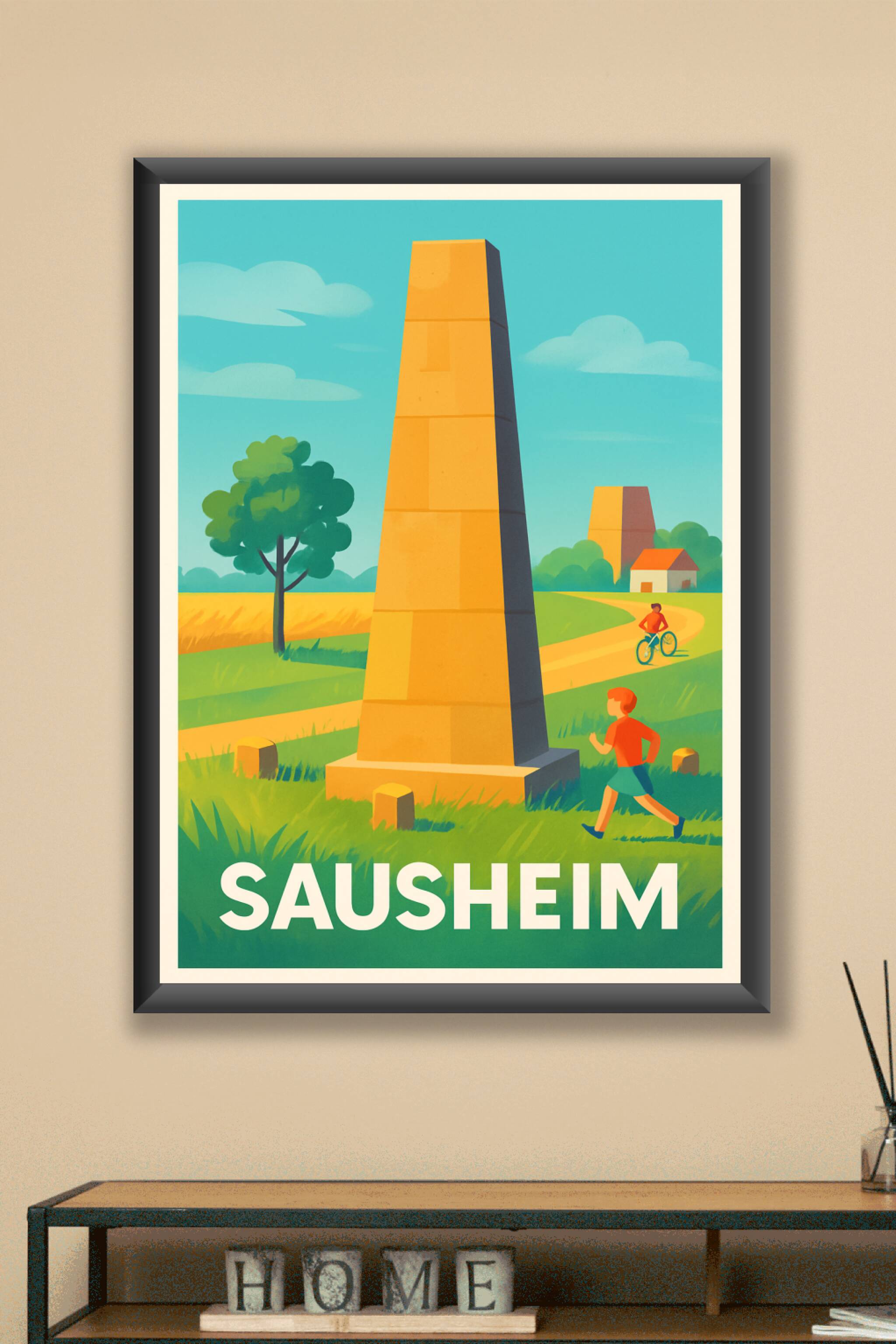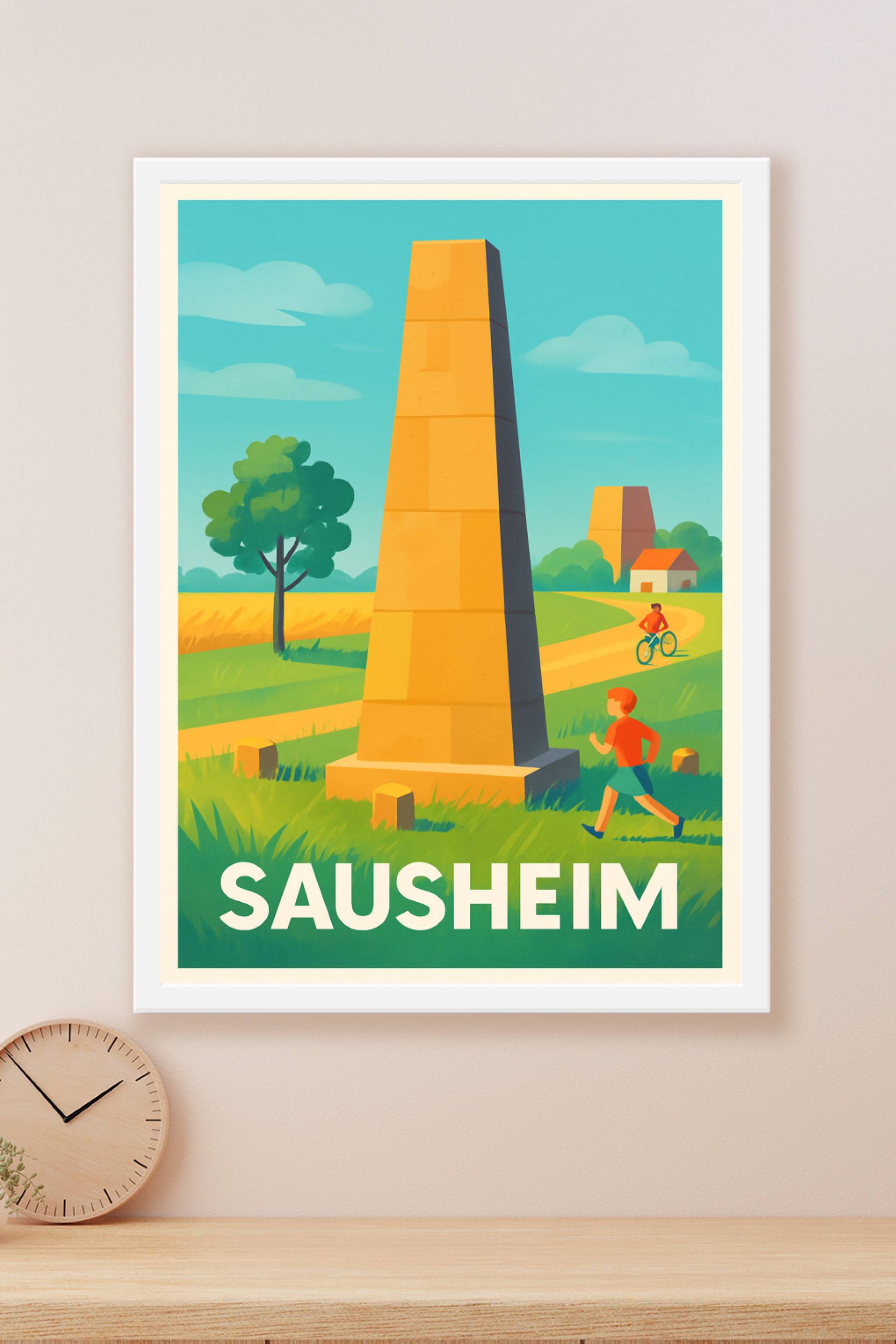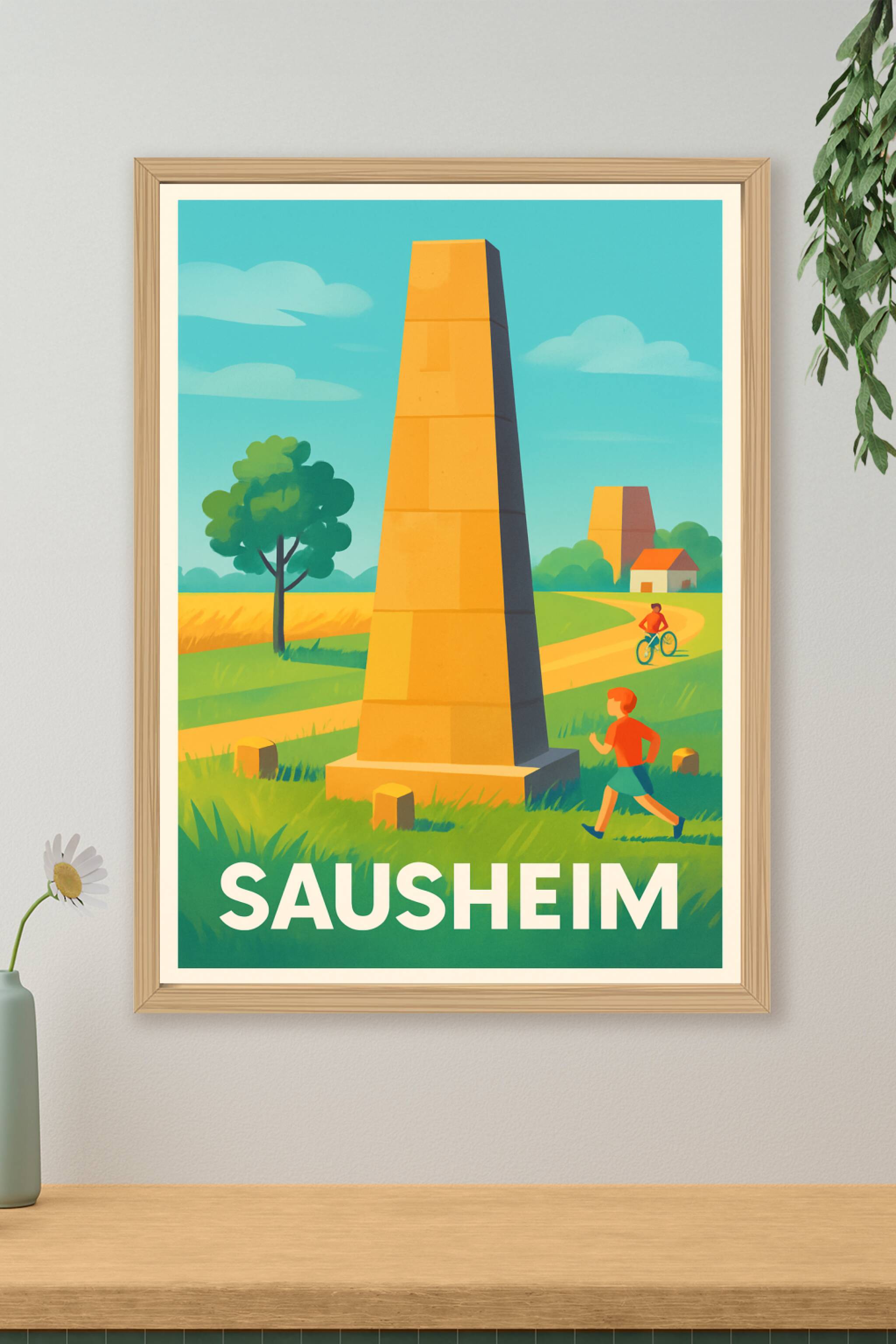 Découvrez la sérénité de Sausheim à travers cette affiche illustrée au style vintage, mettant en avant les célèbres obélisques au milieu des champs...