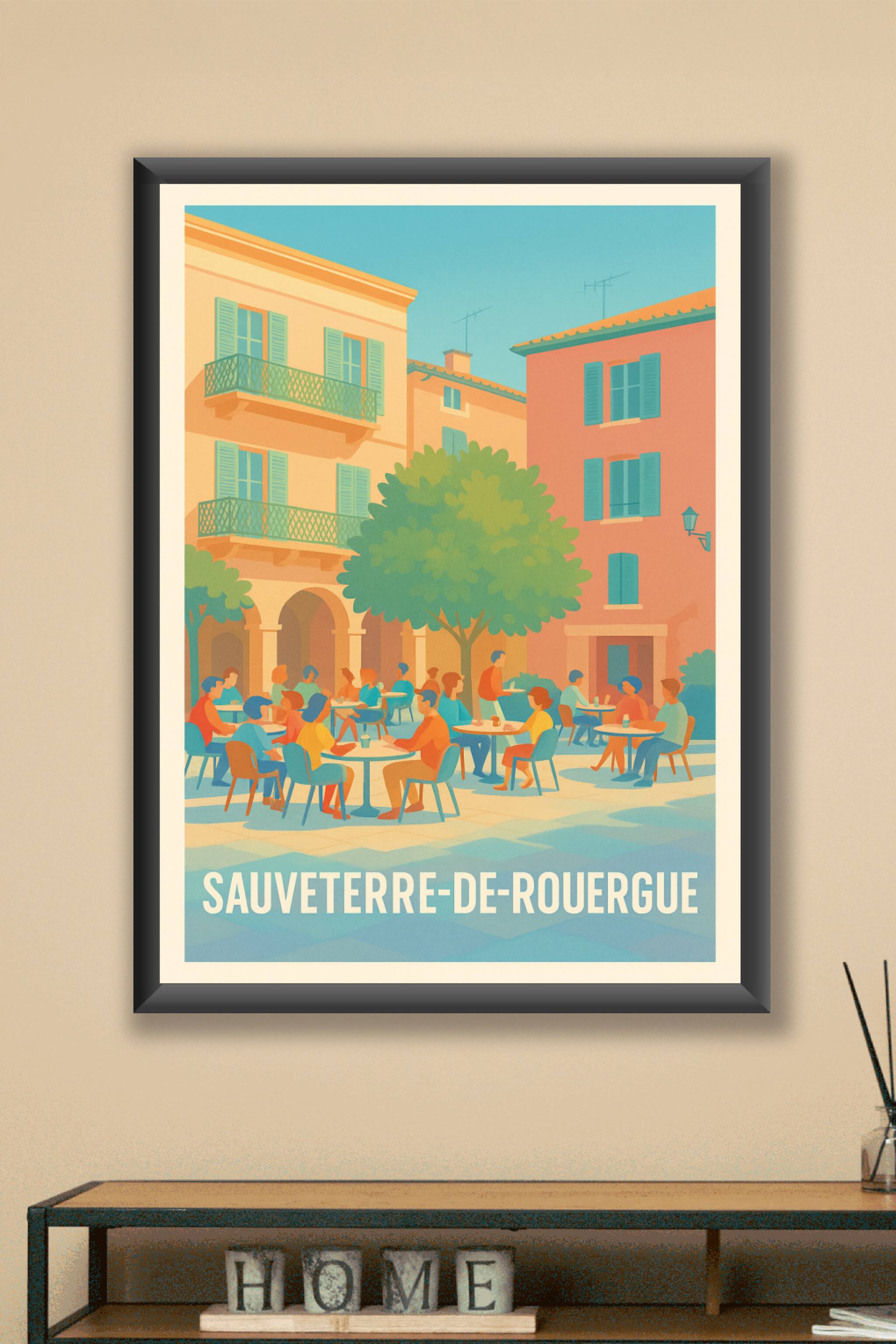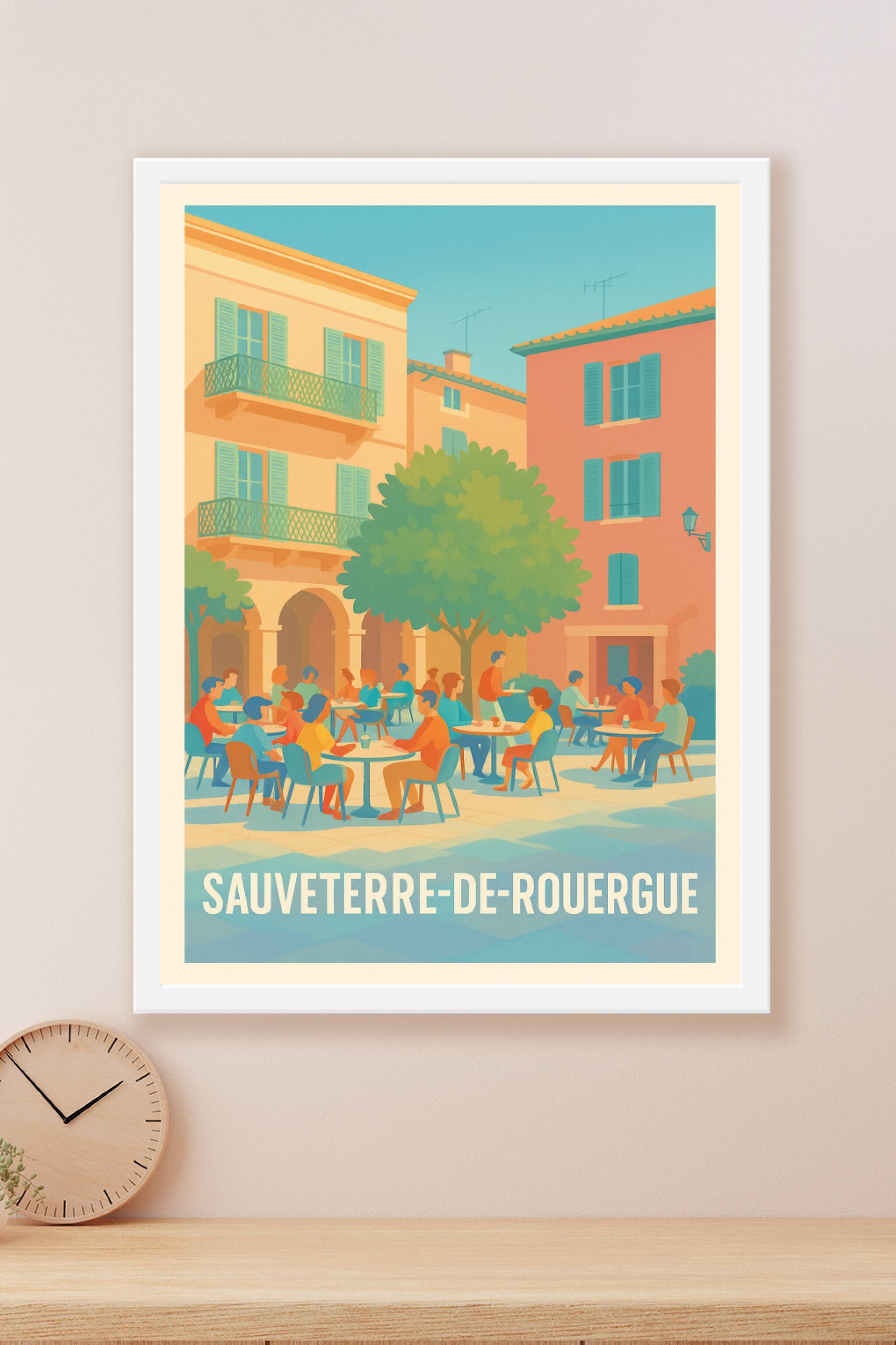Découvrez l'ambiance conviviale et chaleureuse de Sauveterre-de-Rouergue avec cette affiche illustrée qui capture un moment de détente en terrasse ...