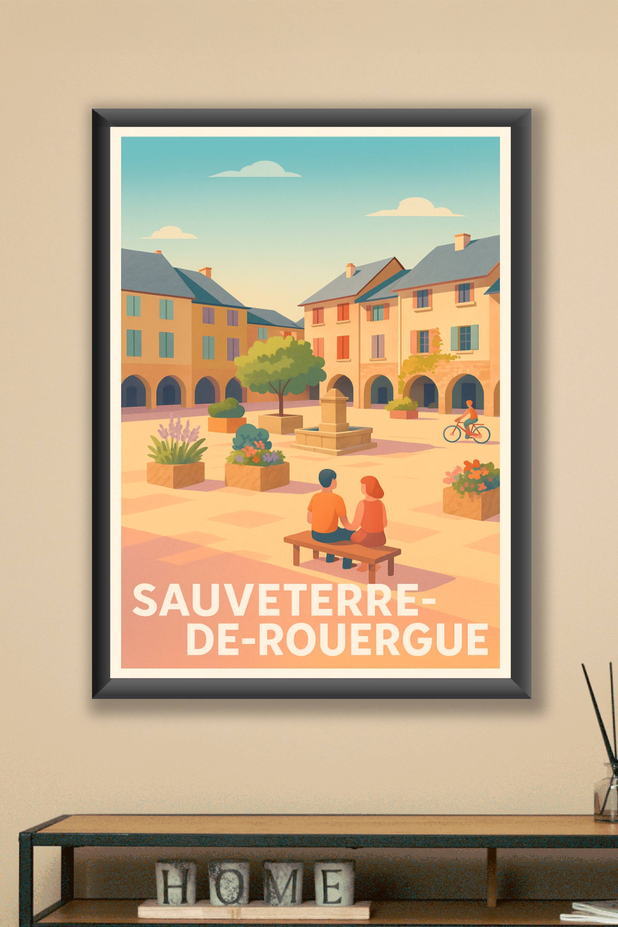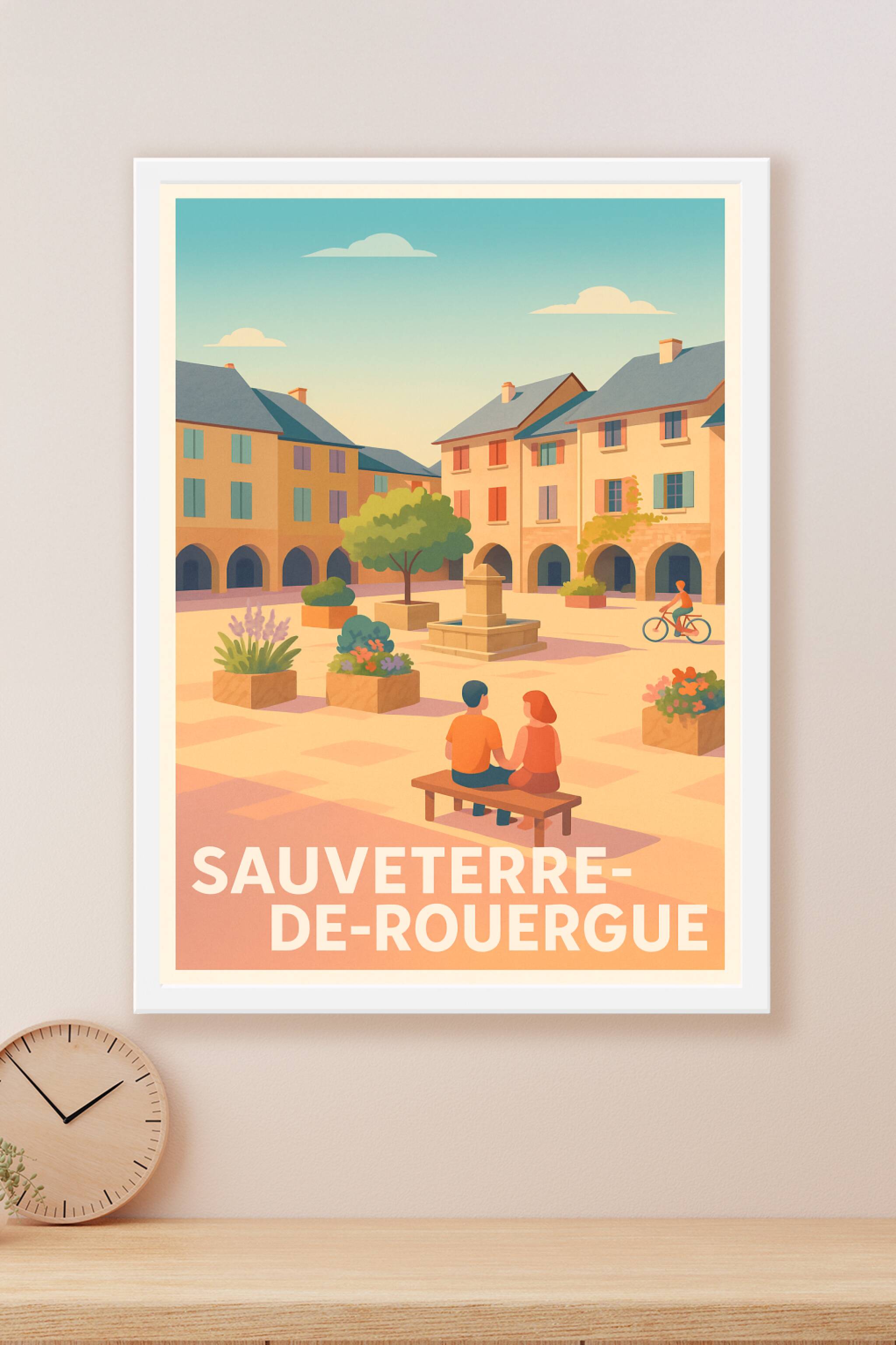 Découvrez l'élégance intemporelle de Sauveterre-de-Rouergue avec cette affiche aux teintes chaudes et pastel qui évoquent la douce lumière du sud-ouest. Illustrant une place pittoresque animée de maisons anciennes, d'arches majestueuses et d'une fontaine centrale, ce poster capture la sérénité d’un après-midi estival, idéal pour inviter une atmosphère paisible et romantique dans votre intérieur. Disponible en impression "Fine Art" sur papier 305g coton, cette affiche se décline en formats A1 à A4, avec ou sans cadre, pour répondre à toutes vos envies de décoration. Profitez d'une qualité d'impression exceptionnelle, 100% fabriquée en France, pour sublimer votre maison ou offrir un souvenir raffiné aux amateurs de patrimoine et de paysages authentiques.