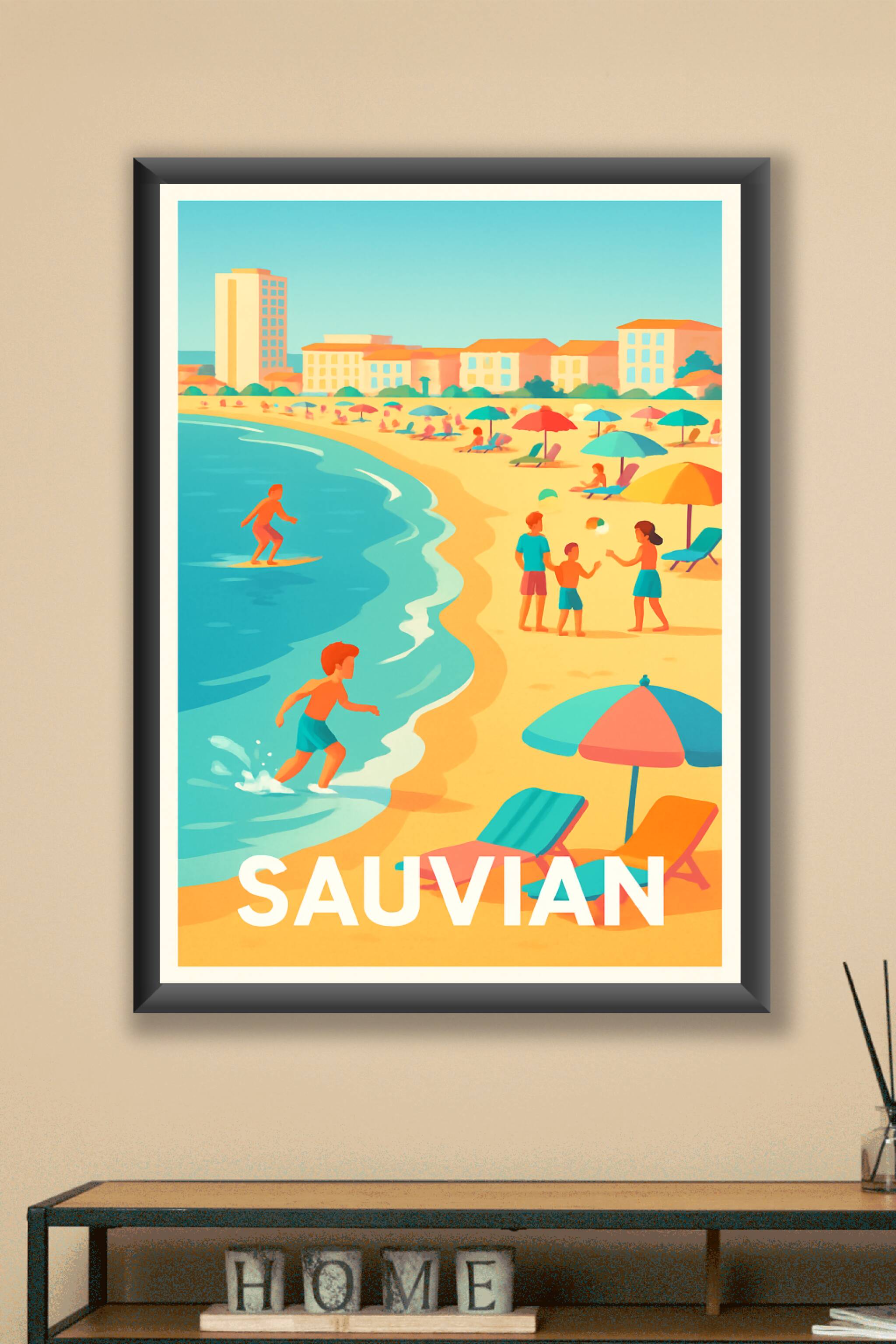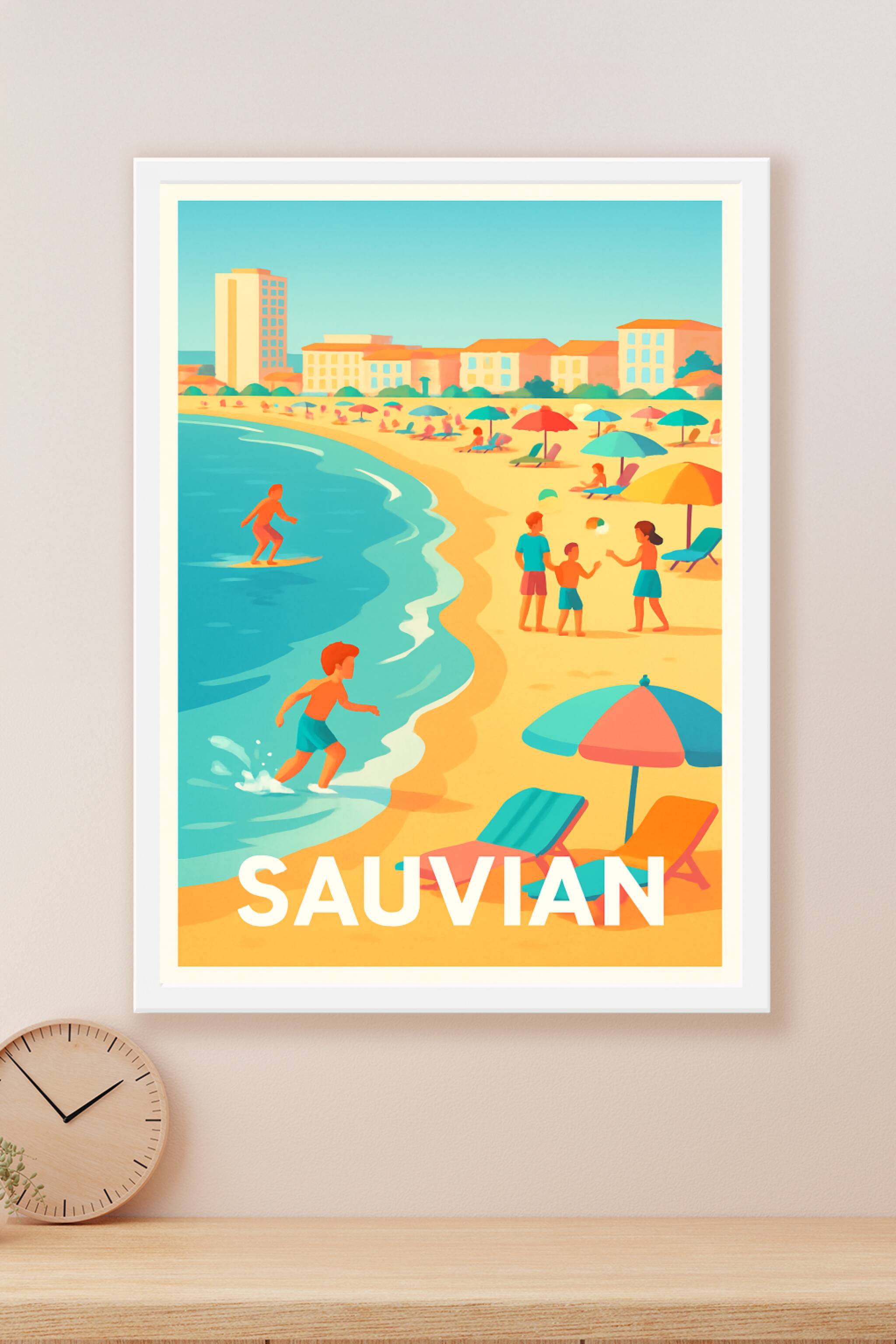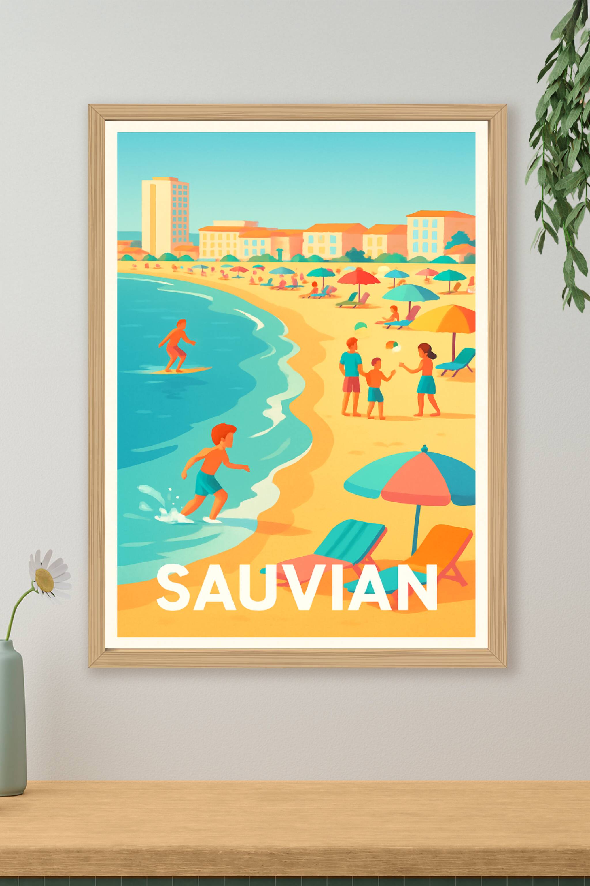Découvrez la douceur de vivre de Sauvian avec cette affiche vintage illustrant une plage animée aux couleurs chaudes et accueillantes. Entre détent...