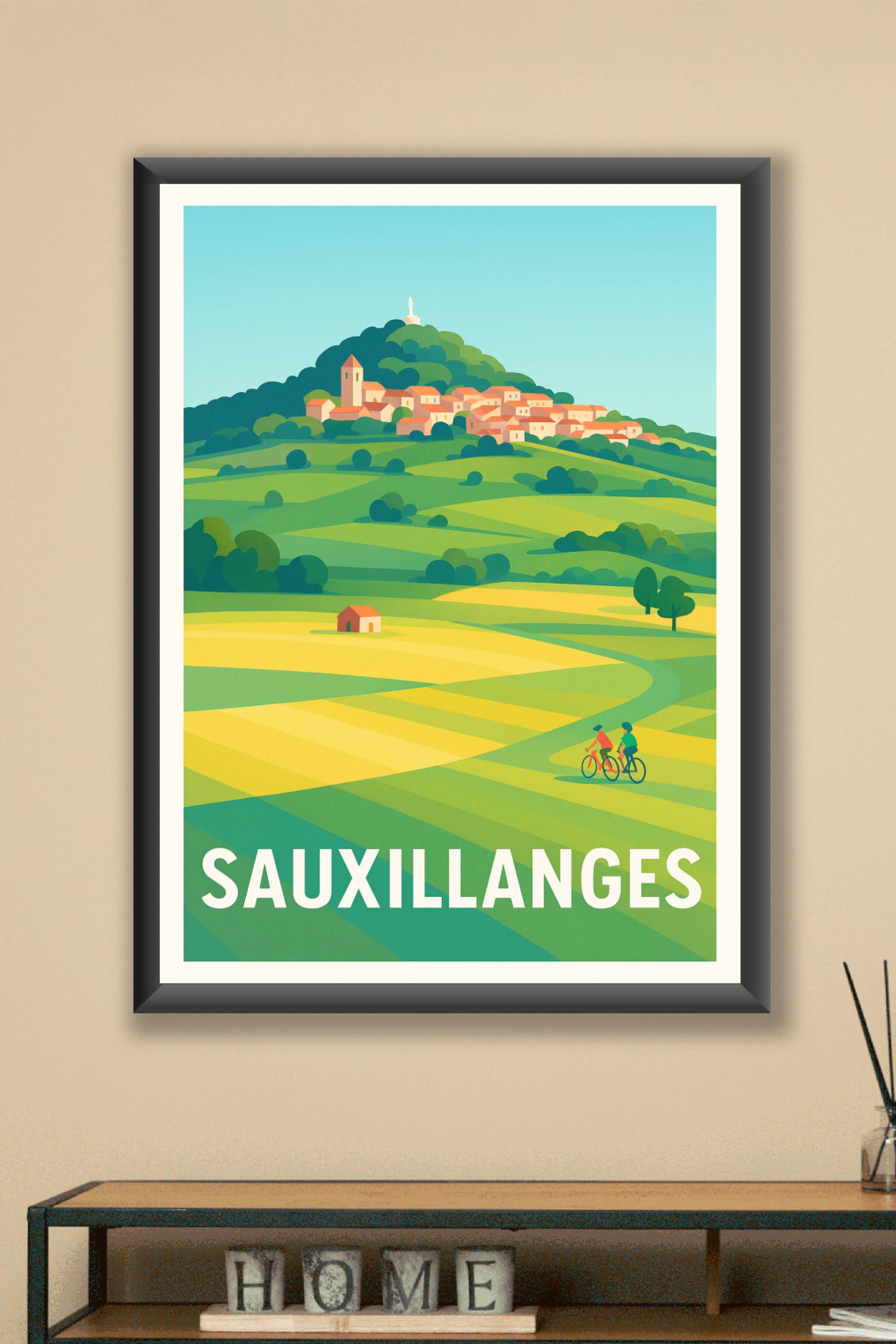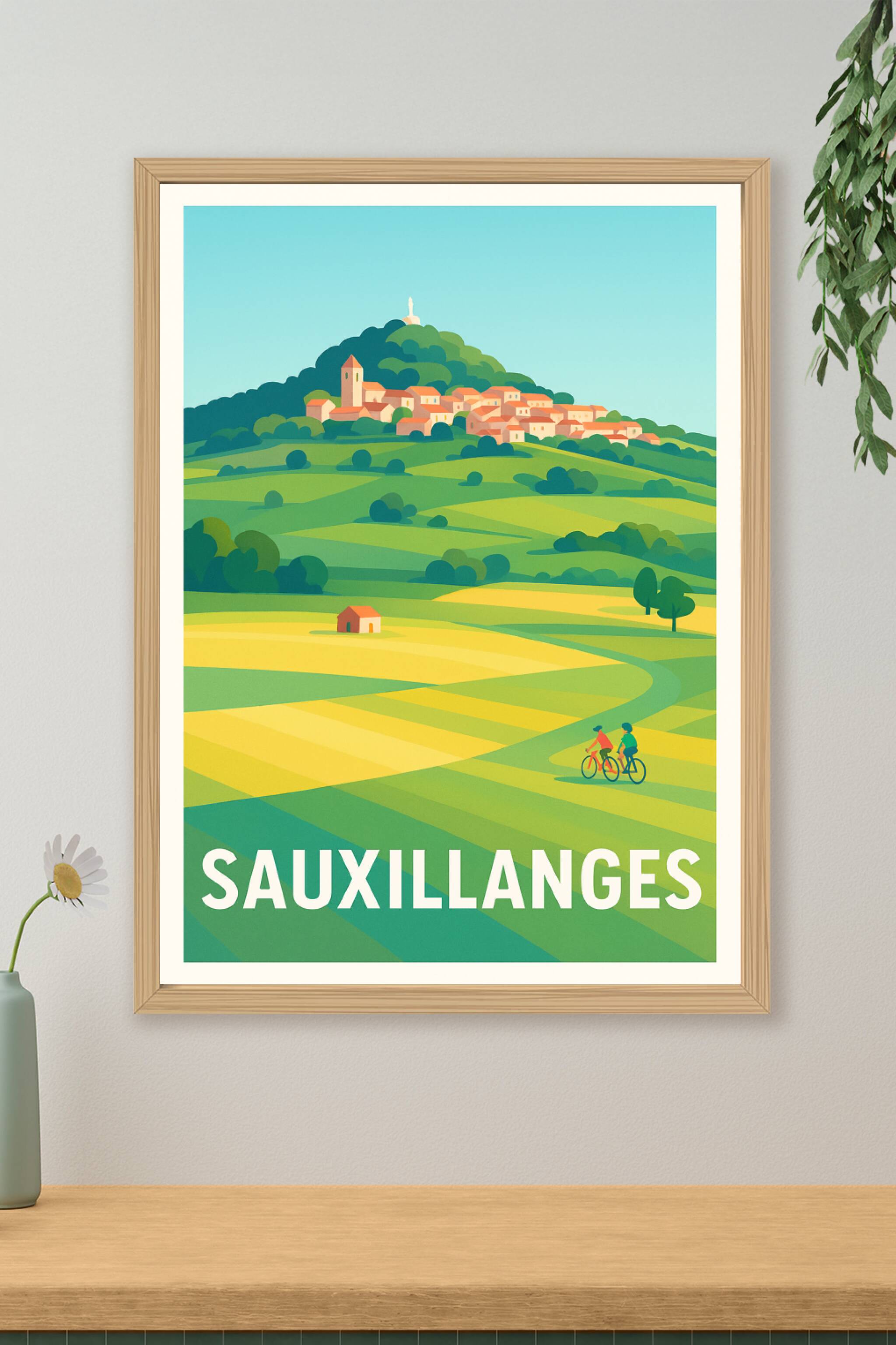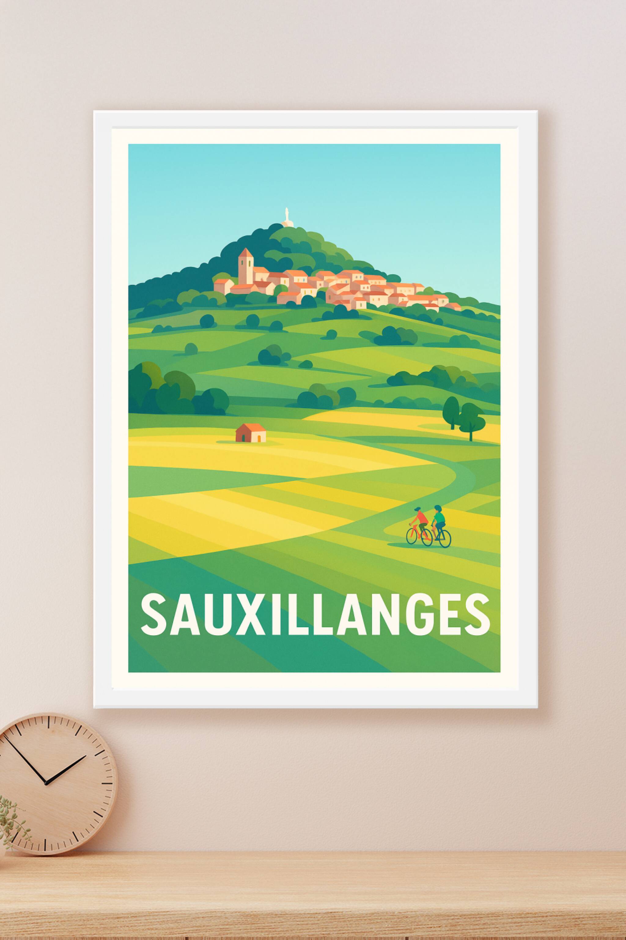 Découvrez le charme authentique de Sauxillanges avec cette affiche illustrée mettant en valeur ses paysages verdoyants et ses collines paisibles. C...