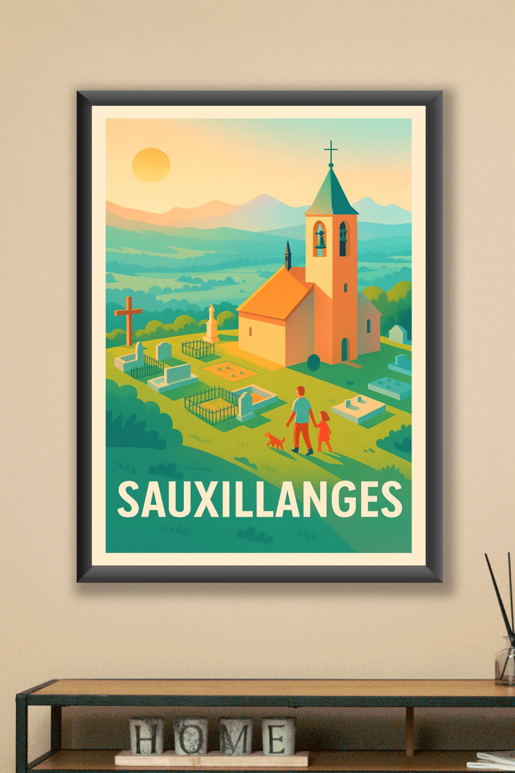 Découvrez la douceur de vivre en Auvergne avec cette affiche illustrée représentant l'église pittoresque de Sauxillanges, baignée dans une lumière ...