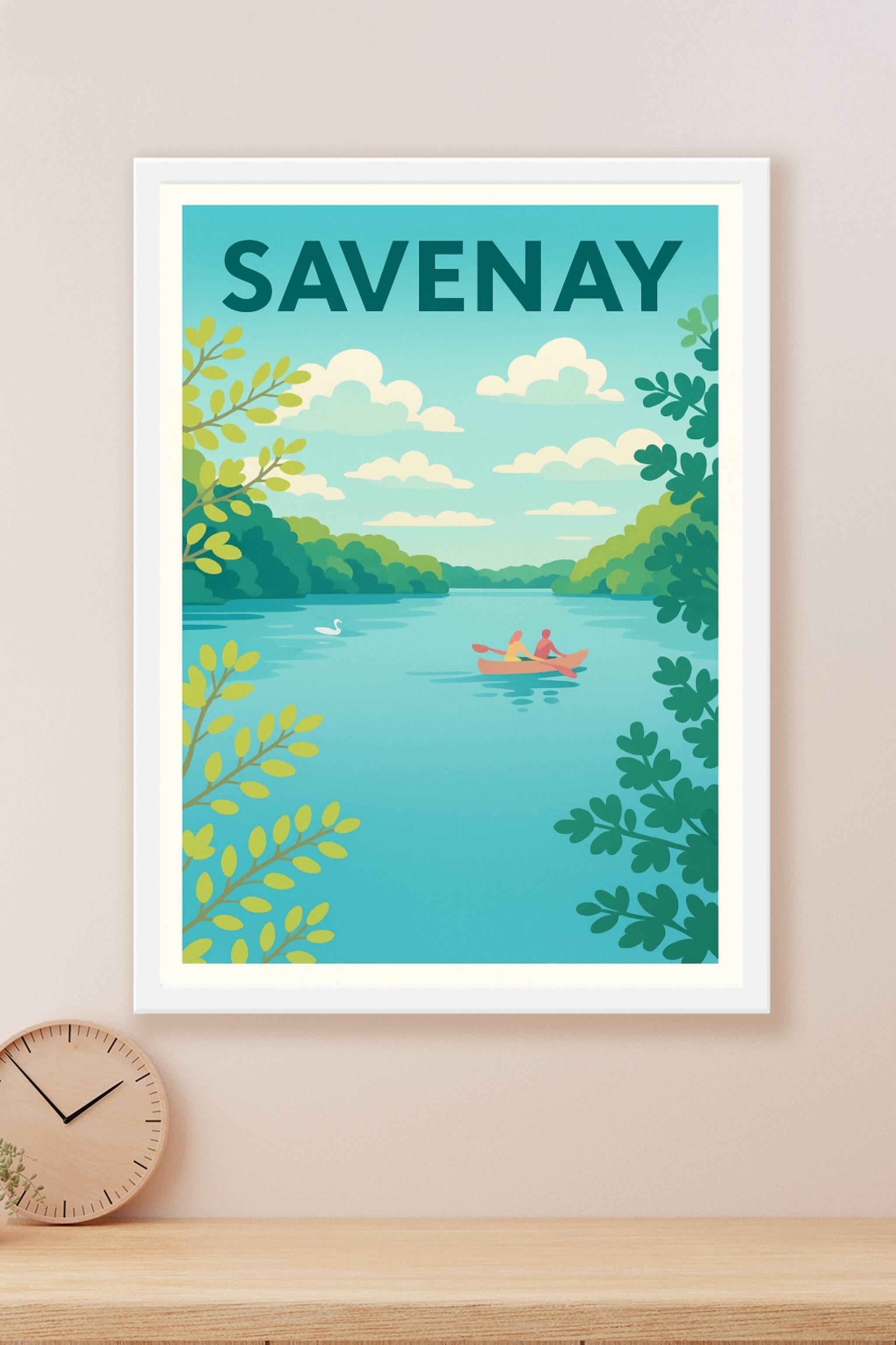 Découvrez la sérénité de Savenay à travers cette affiche au design épuré et coloré, illustrant un duo en canoë sur une rivière paisible entourée de...