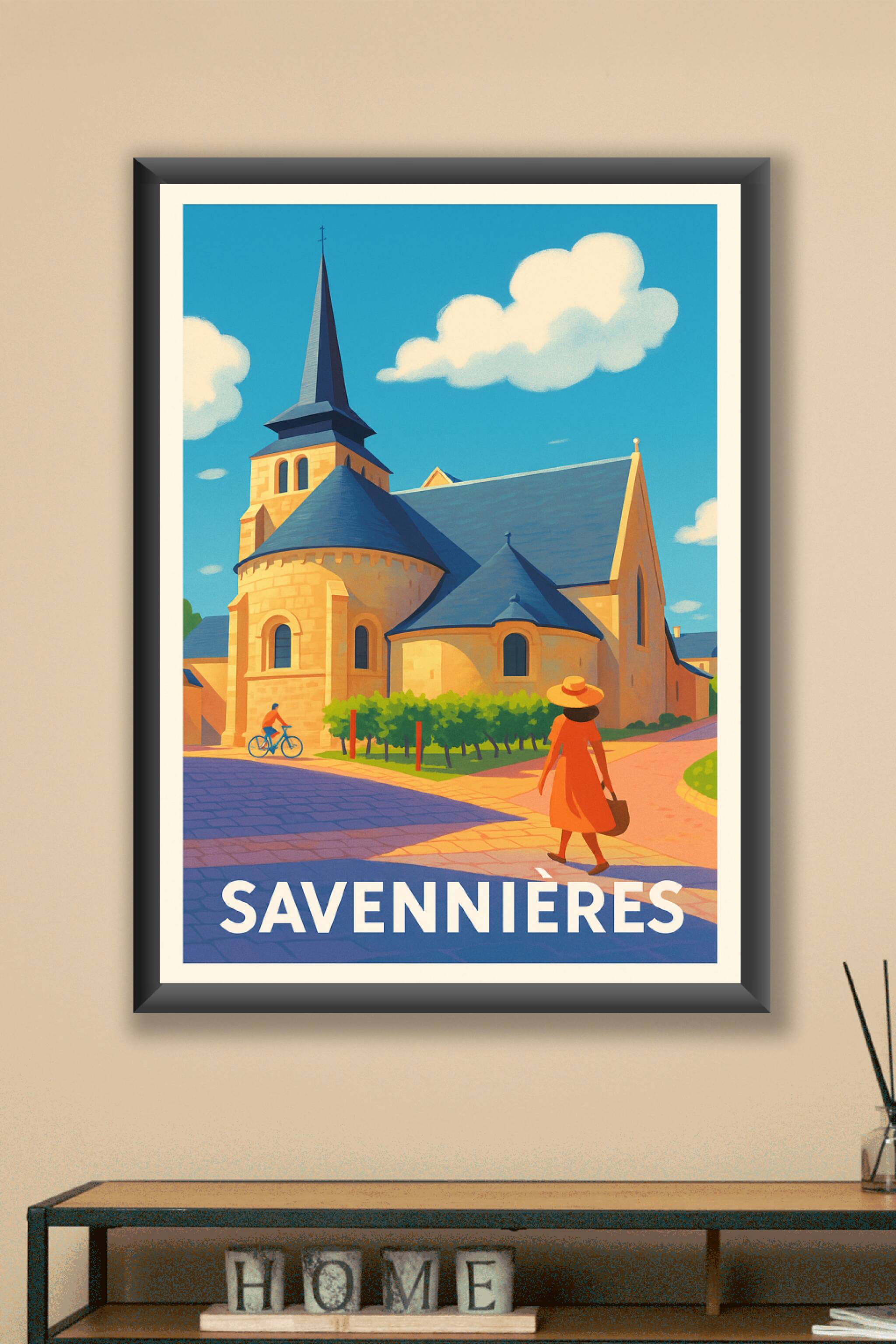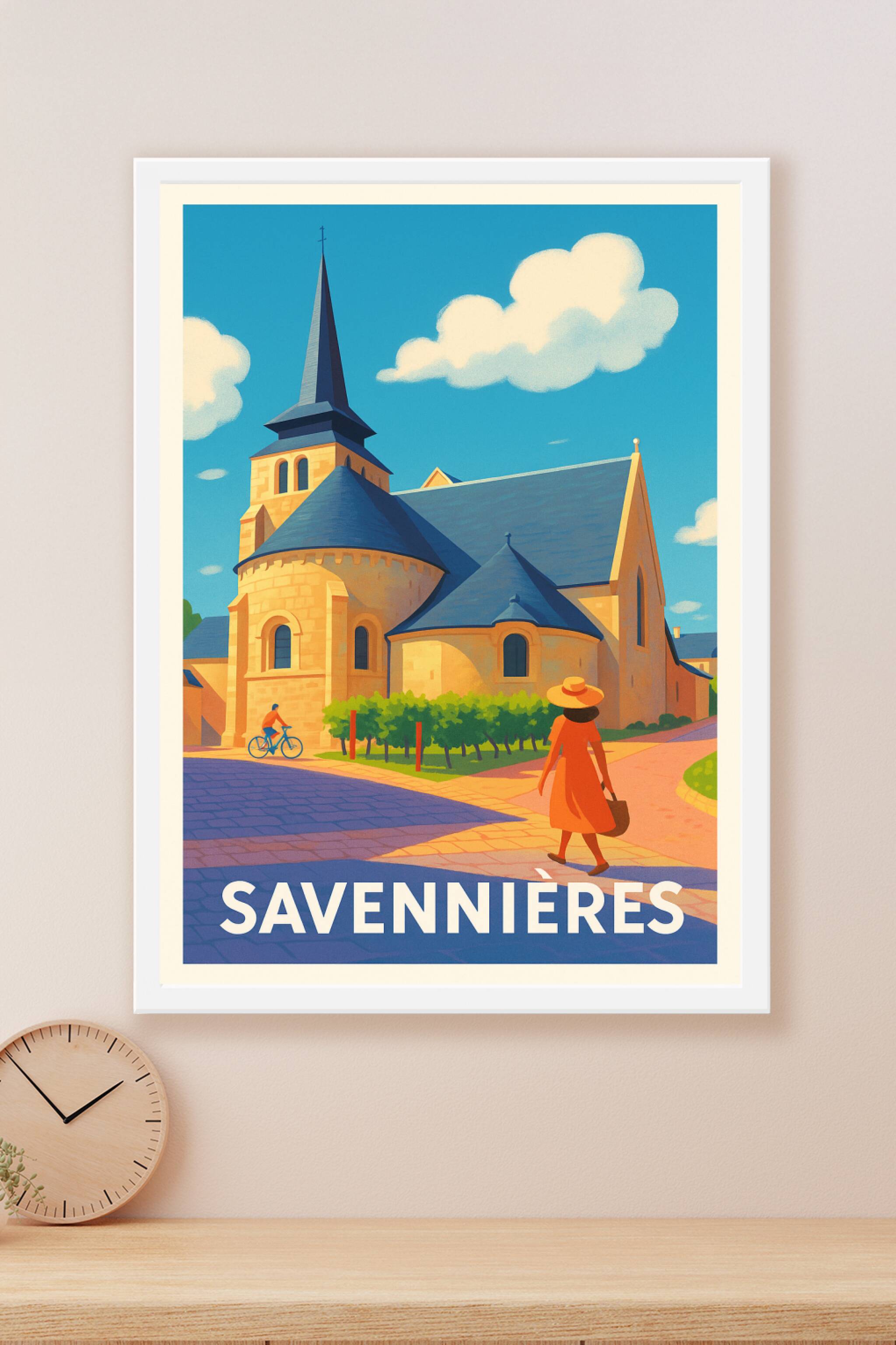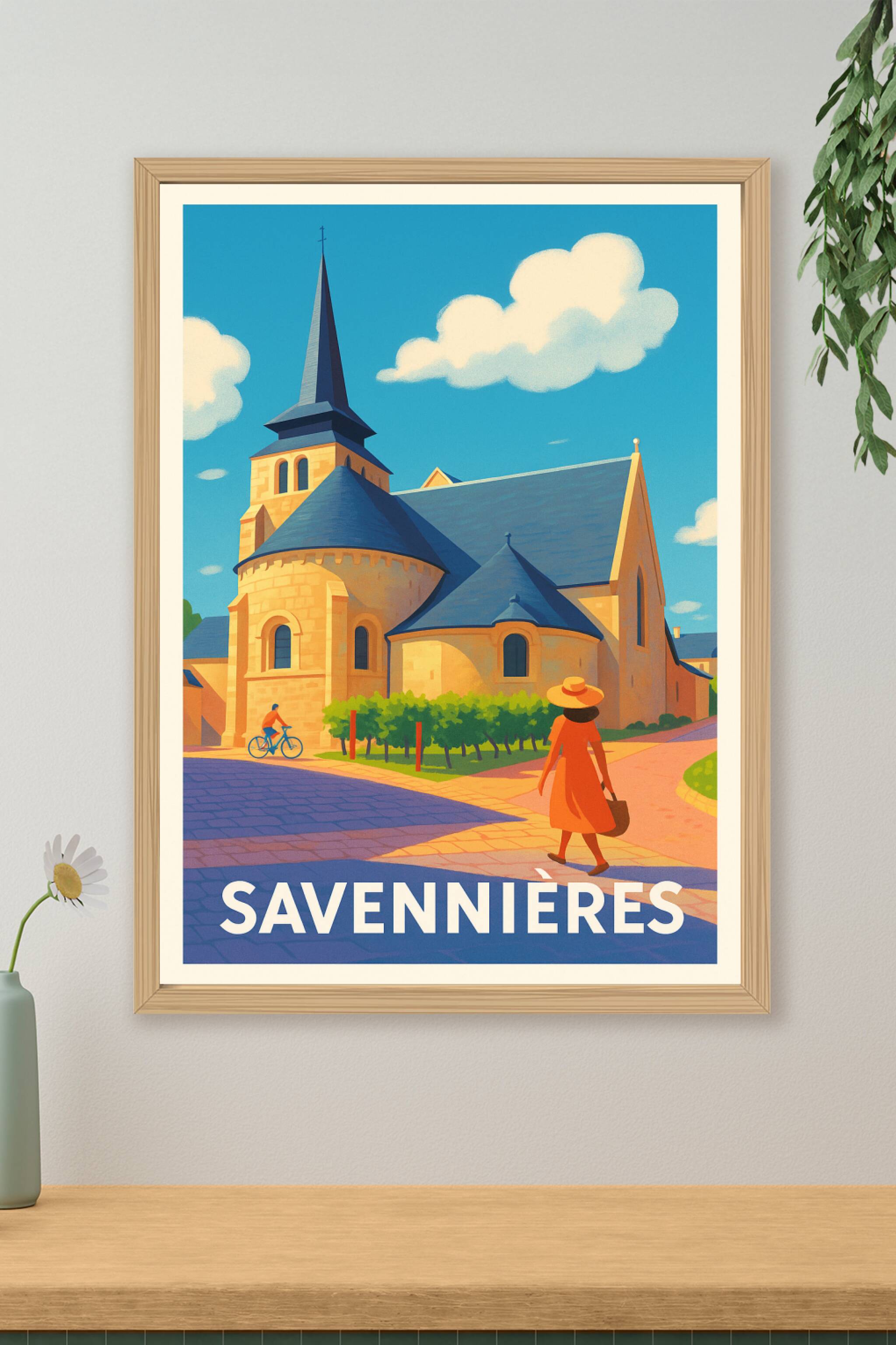 Découvrez le charme intemporel de Savennières avec cette affiche illustrée mettant en scène son architecture typique sous un ciel azur. Ce poster c...