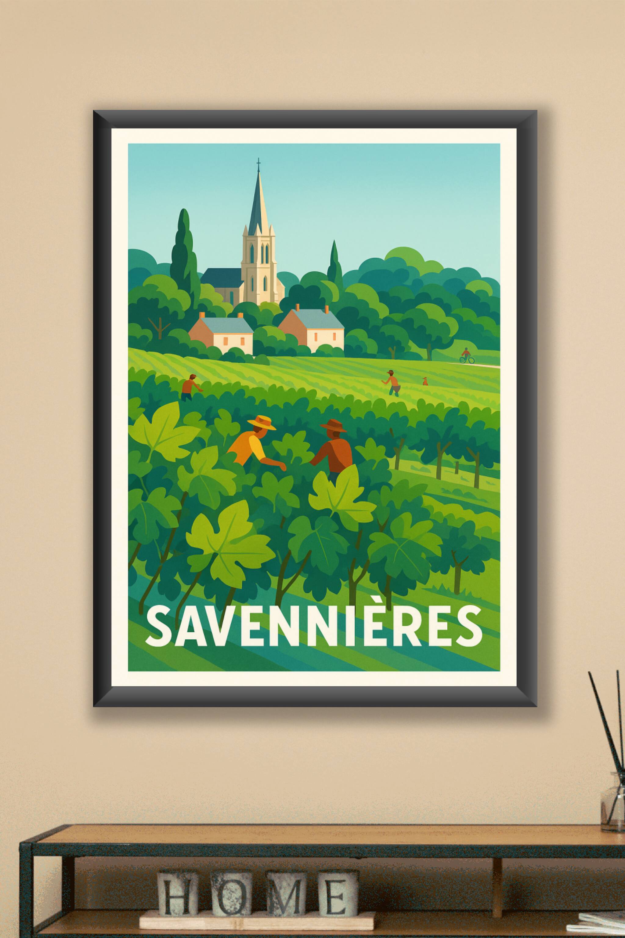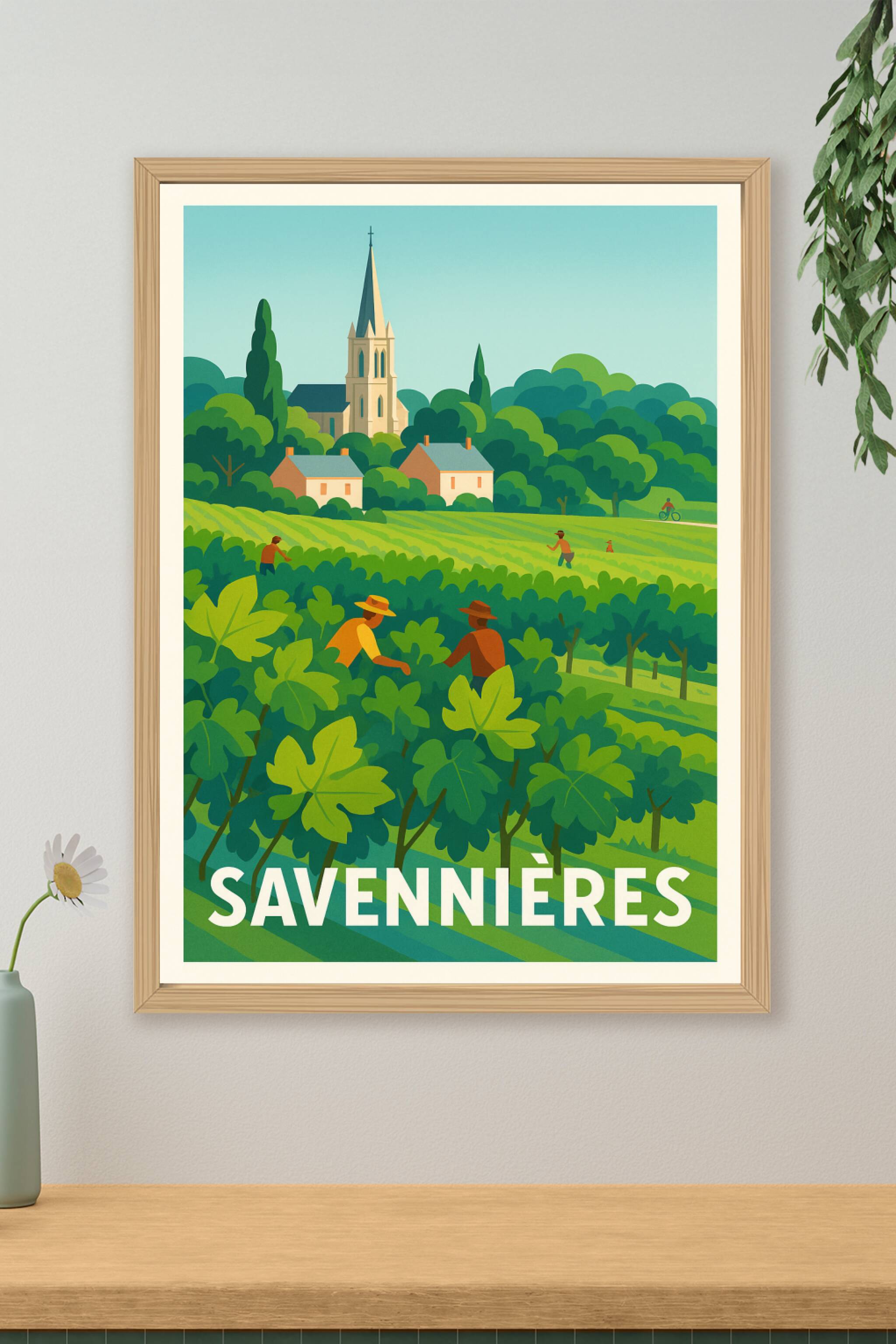 Découvrez la beauté bucolique des vignobles de Savennières avec cette affiche illustrée au style graphique et lumineux. Ce poster met en scène les vignes verdoyantes et les silhouettes des vendangeurs dans un paysage apaisant, sur fond d'église typique et petits cottages. Imprimé en tirage "Fine Art" sur un papier 305g coton d'une qualité exceptionnelle, cet affichage est disponible du format A1 à A4, avec ou sans cadre, pour s'adapter à votre décoration intérieure ou votre bureau. Offrez-vous ce poster d'exception pour une touche artistique authentique et un souvenir raffiné du terroir ligérien, entièrement fabriqué en France avec une impression premium.