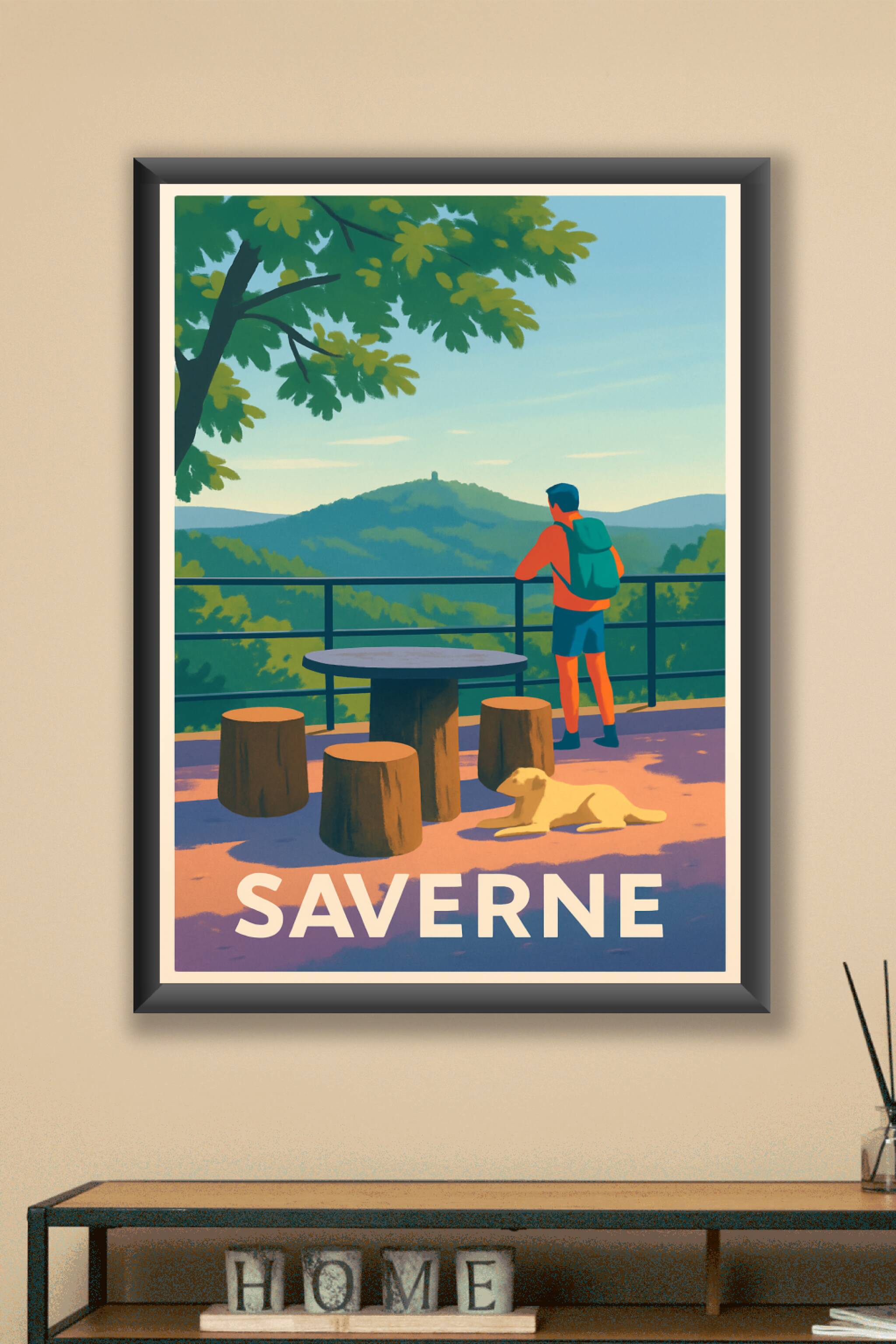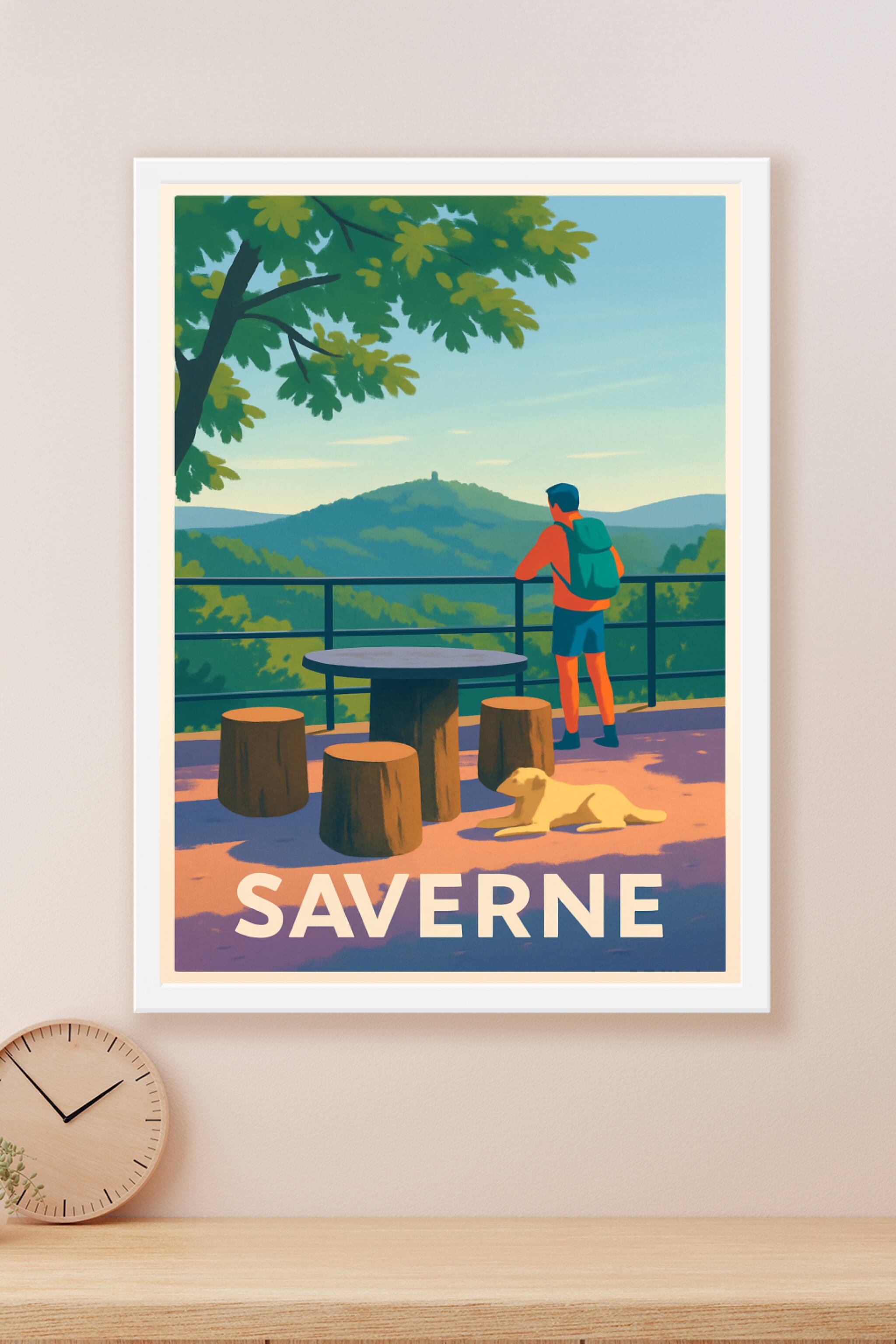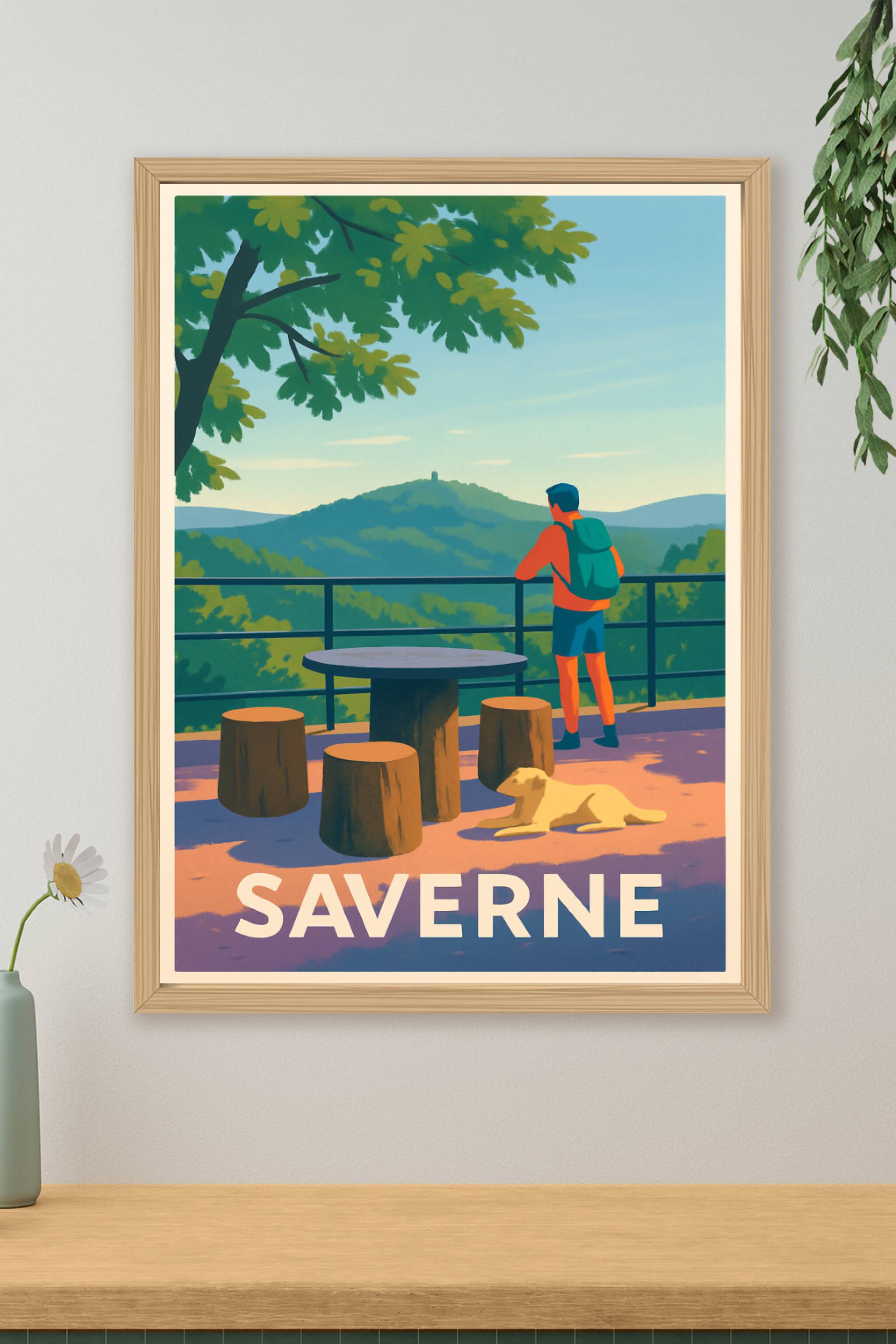 Découvrez la douceur de vivre de Saverne avec ce poster illustré qui capture un moment paisible face aux collines verdoyantes, sous l'ombre bienvei...