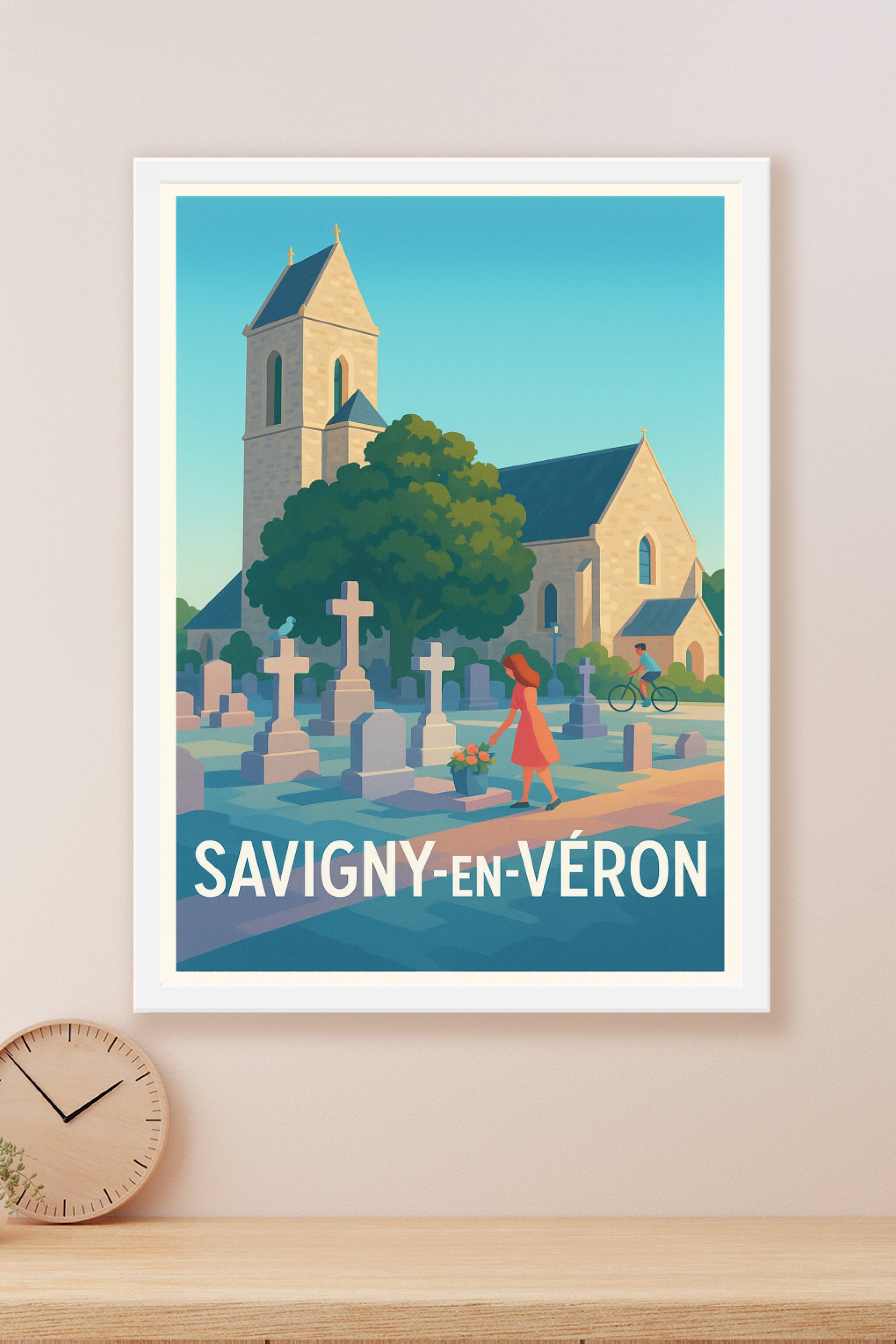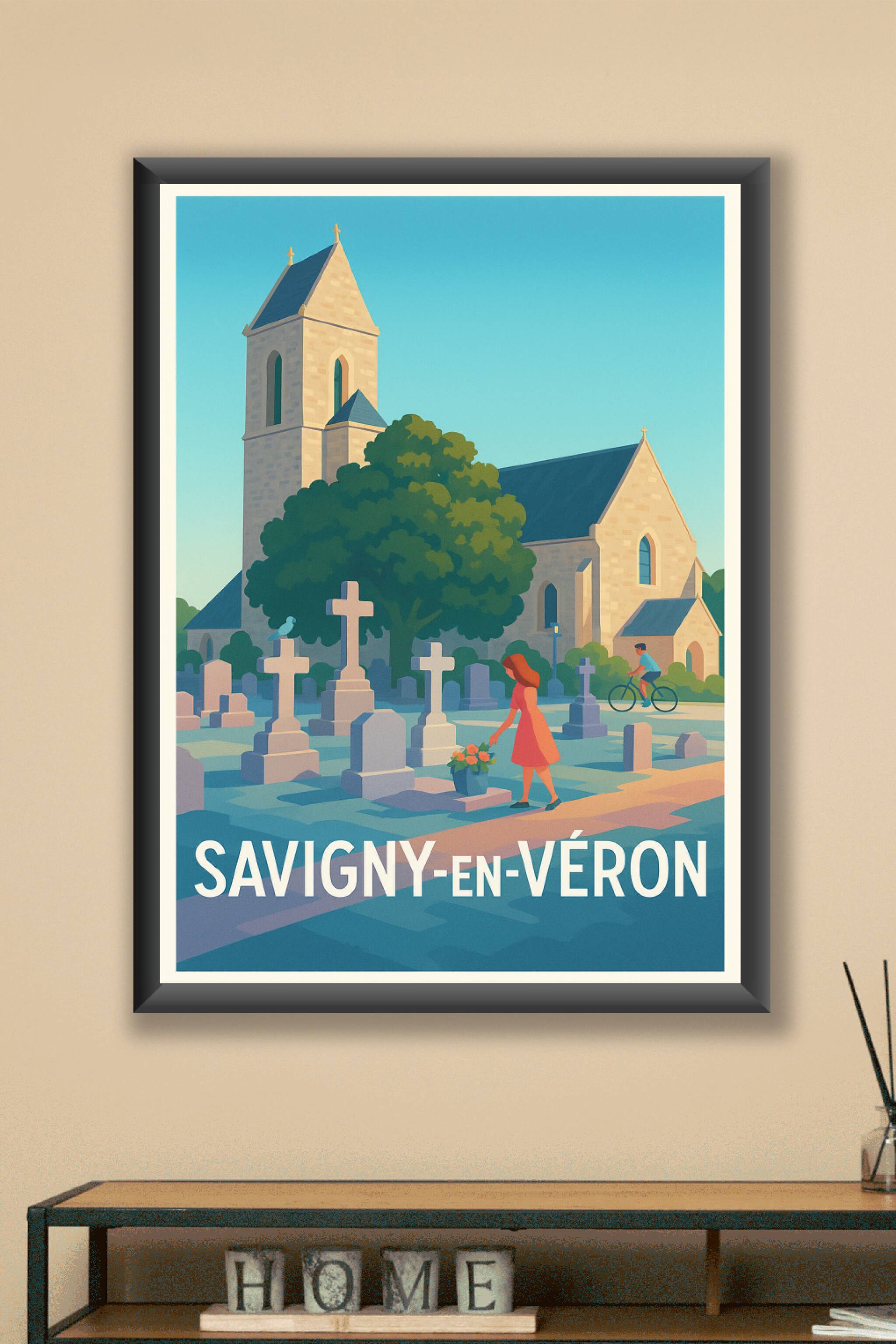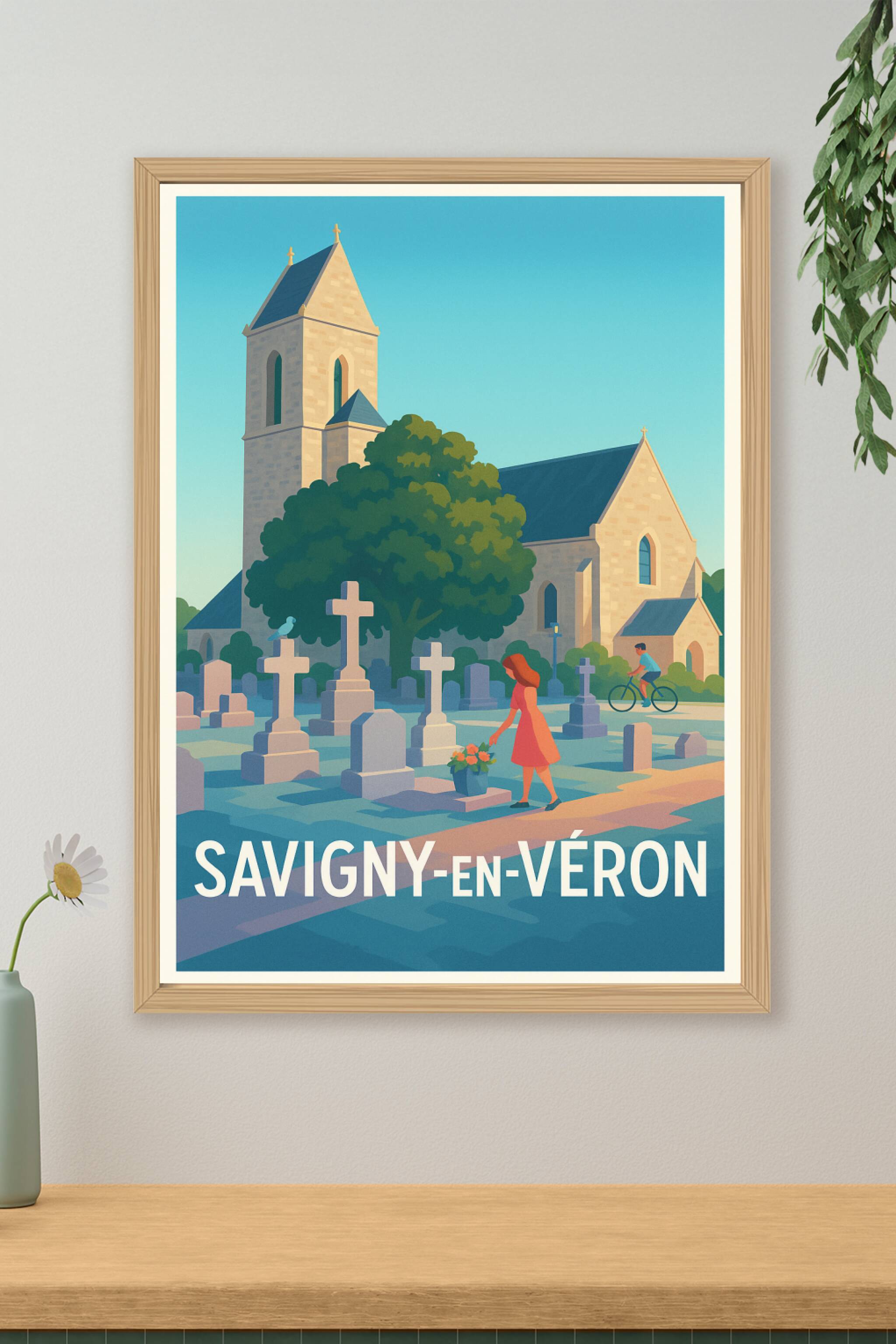 Découvrez la sérénité de Savigny-en-Véron à travers cette affiche au style illustratif doux et apaisant. Ce poster met en scène un moment intime devant une église ancienne, avec ses pierres chargées d'histoire et ses tombes, sous un ciel dégagé et une lumière chaleureuse. Imprimée en tirage Fine Art sur papier 305g coton, cette affiche garantit une qualité d'impression exceptionnelle, idéale pour sublimer votre intérieur. Disponible en plusieurs formats, de A1 à A4, avec ou sans cadre, cette pièce décorative est parfaite pour apporter une touche d'authenticité et de tranquillité à votre décoration ou pour offrir un souvenir unique de Savigny-en-Véron.