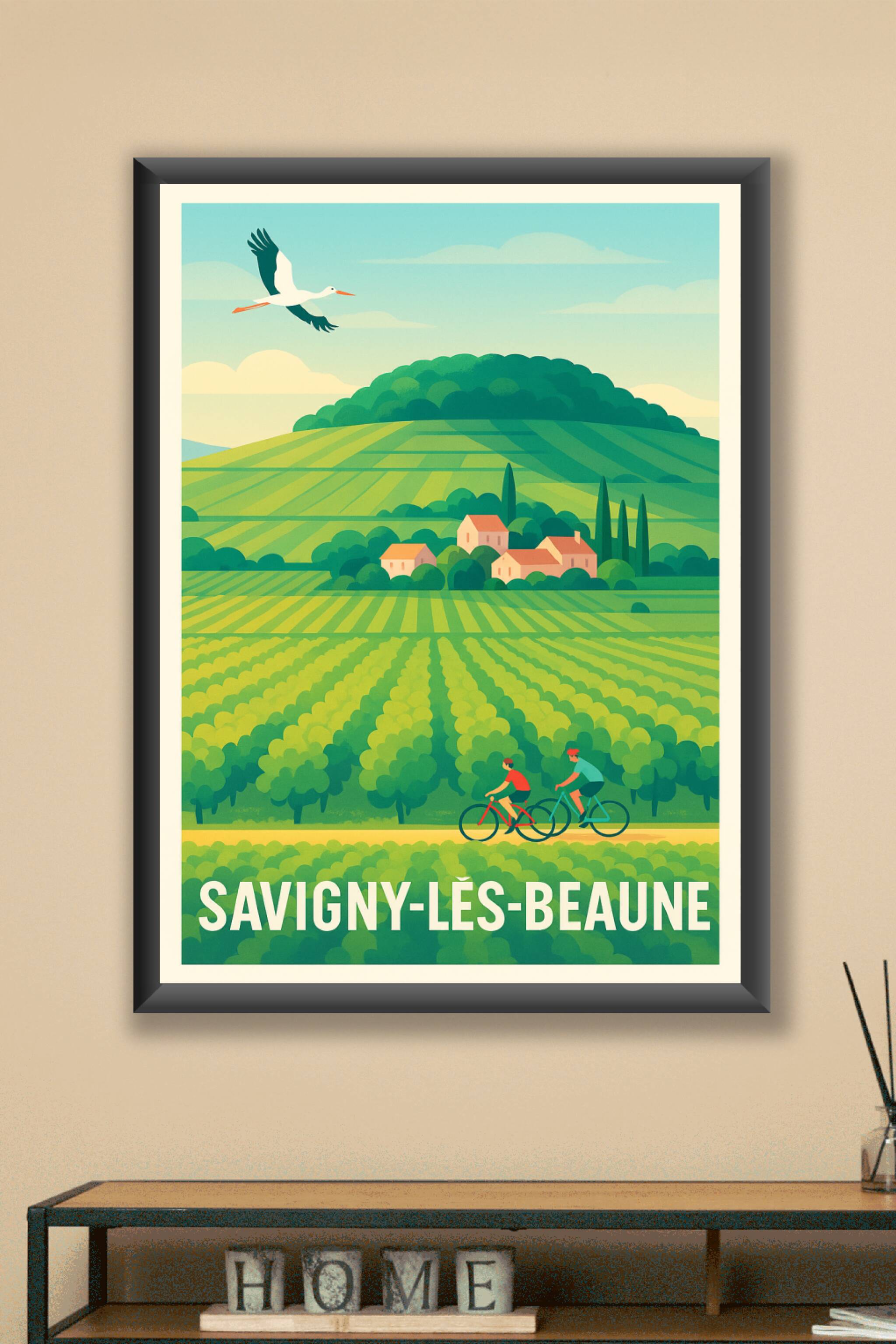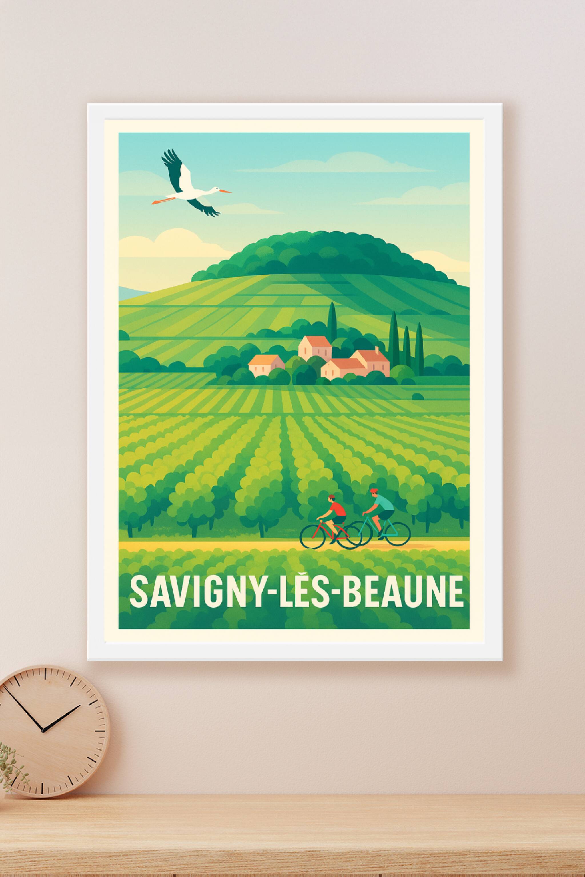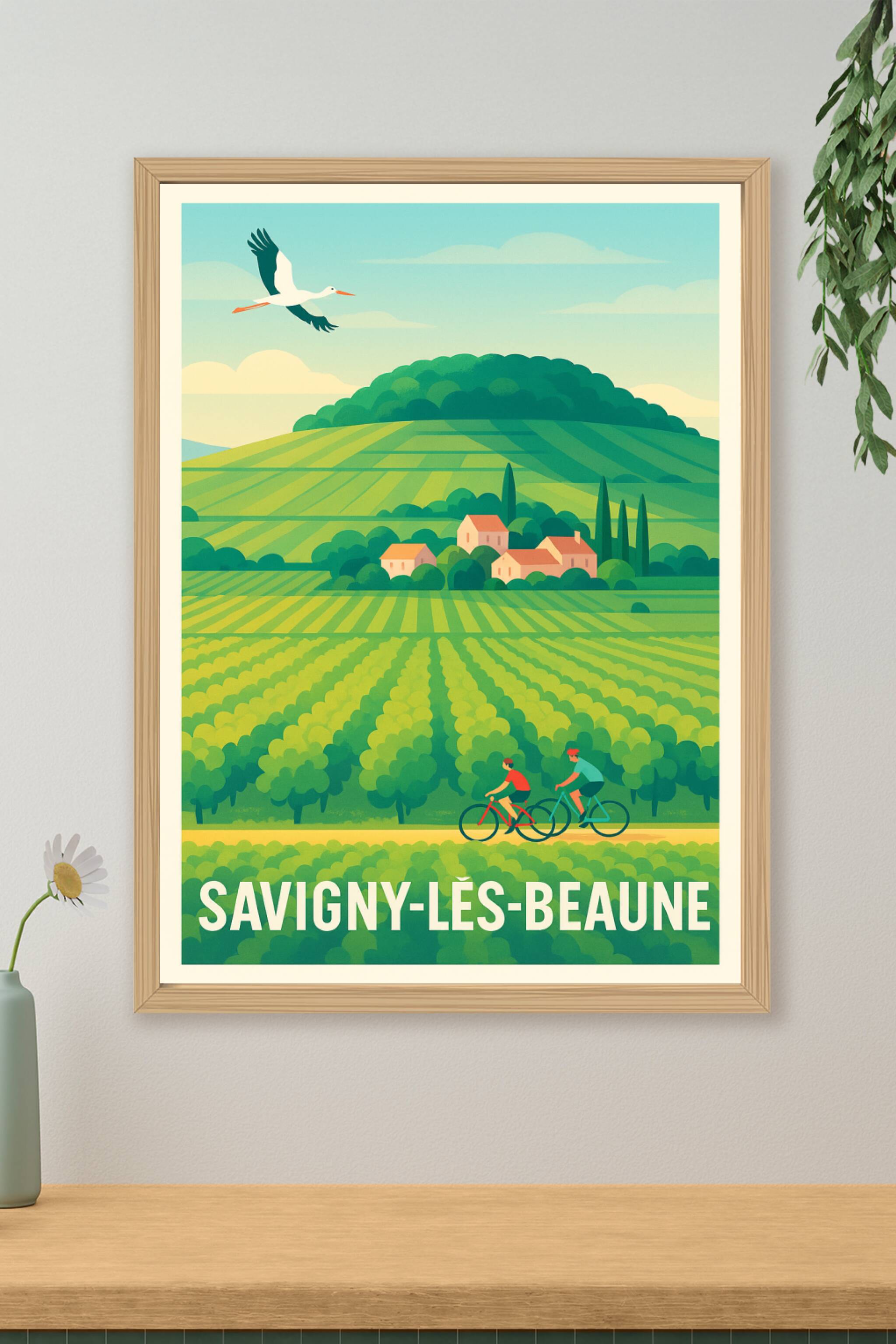 Découvrez la douceur de vivre de la Bourgogne avec cette affiche représentant les vastes vignes de Savigny-lès-Beaune, où cyclistes et nature se rencontrent harmonieusement. Ce poster au style épuré et coloré évoque les plaisirs simples d’une balade dans les paysages viticoles qui font la renommée de cette région.Cette affiche est imprimée en tirage "Fine Art" sur papier 305g coton assurant une qualité d'impression exceptionnelle, pour des couleurs intenses et une résistance optimale. Disponible en formats A1 à A4, avec ou sans cadre, elle s'adapte parfaitement à toute décoration d'intérieur, qu'elle soit classique ou contemporaine.Offrez-vous ou offrez un souvenir haut de gamme de la Bourgogne avec ce poster premium 100% fabriqué en France, idéal pour embellir votre espace de vie ou de travail.