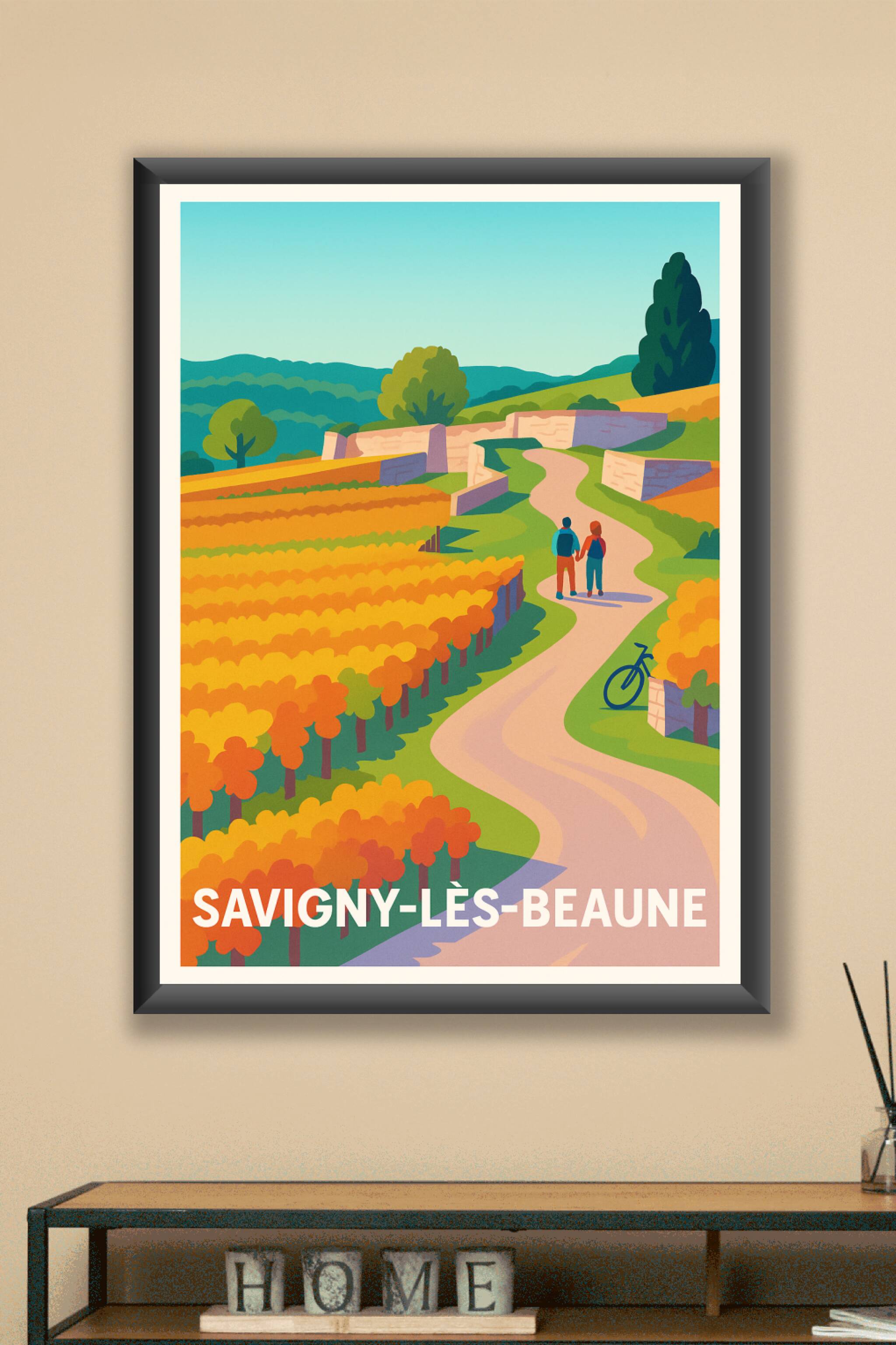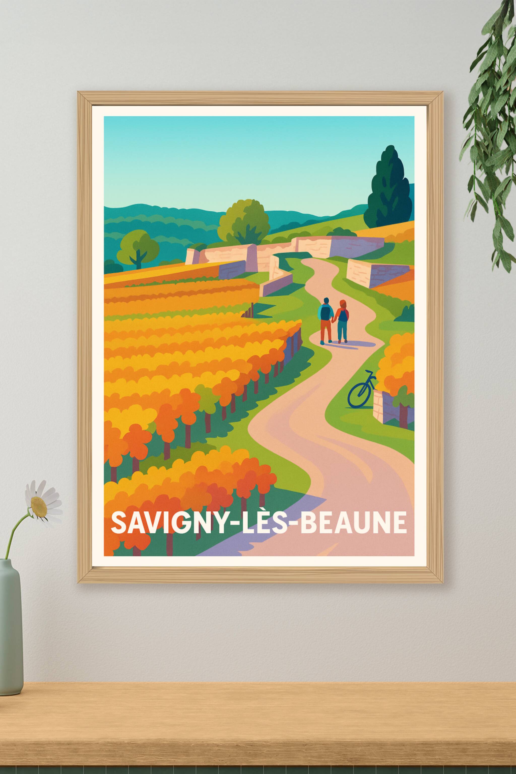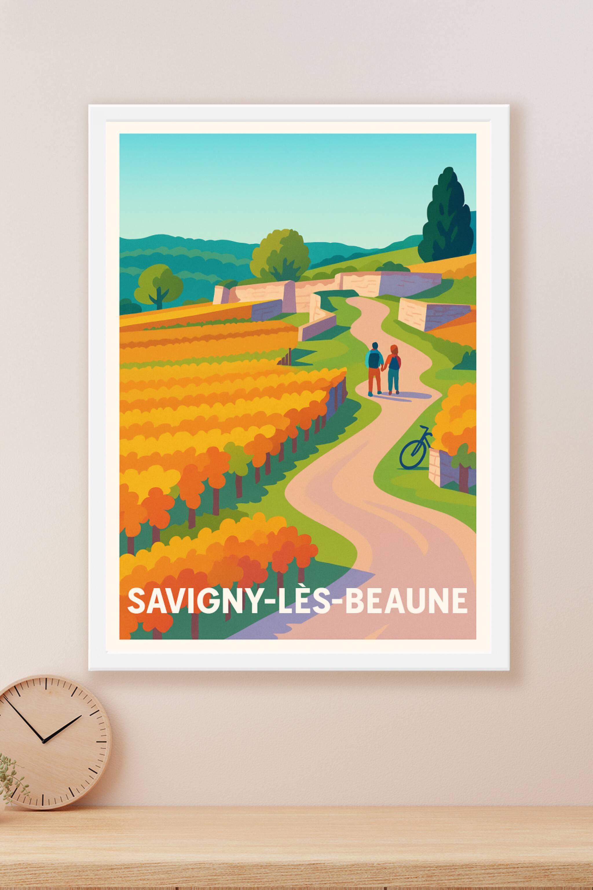 Découvrez la douceur et la beauté des paysages viticoles de Savigny-lès-Beaune avec cette affiche aux couleurs chaudes et harmonieuses. Ce poster illustre une balade paisible au cœur des vignes dorées, bordée de chemins sinueux et de murs en pierre typiques, invitant à la sérénité et à l'évasion.Ce poster est imprimé en tirage Fine Art sur un papier 305g coton haute qualité, garantissant des couleurs éclatantes et une résistance durable. Disponible en formats A1 à A4, avec ou sans cadre, cette affiche sera idéale pour apporter une ambiance chaleureuse et authentique à votre décoration intérieure. Profitez d'une impression premium 100% française pour offrir ou décorer avec goût un coin d'exception de la Bourgogne.