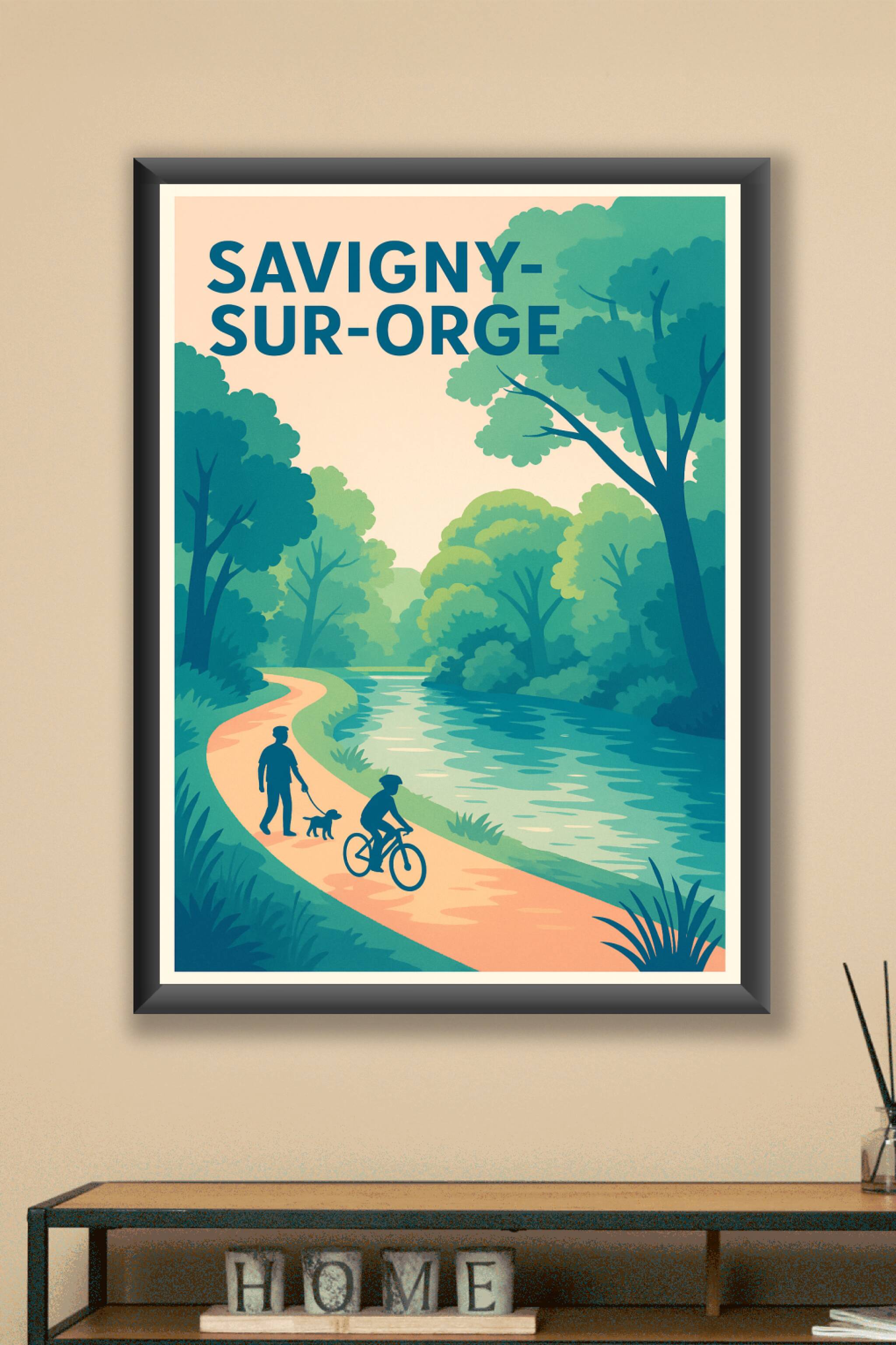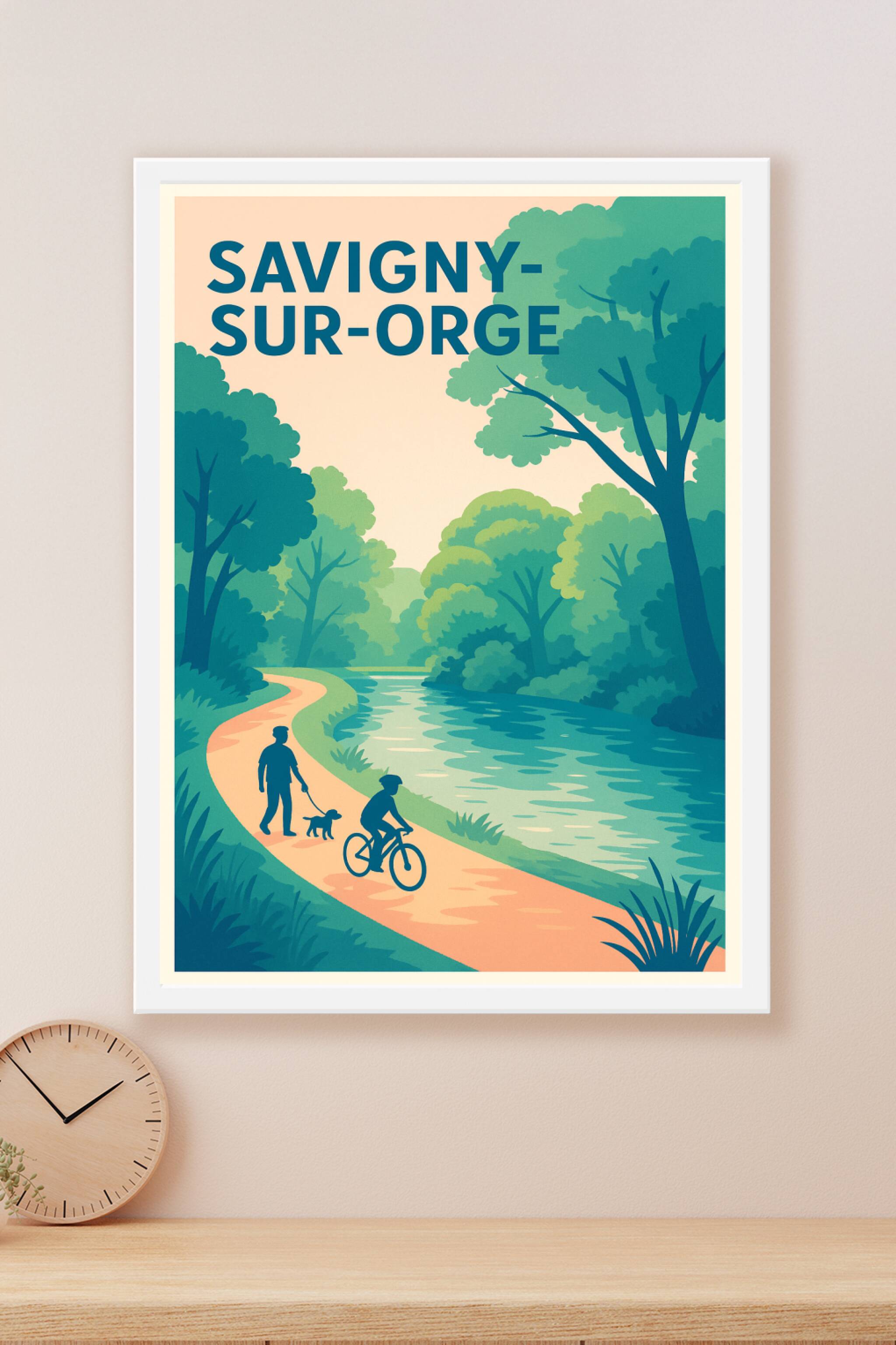 Découvrez la sérénité de Savigny-sur-Orge avec cette affiche illustrée dans un style doux et épuré, mettant en scène un sentier paisible longeant une rivière, où promeneurs et cyclistes profitent d’un cadre verdoyant. Ce poster invite à la détente et à la reconnexion avec la nature, idéal pour égayer votre intérieur ou offrir un souvenir inspirant de cette charmante ville. Disponible en tirage "Fine Art" sur papier 305g coton, il garantit une qualité d'impression supérieure et des couleurs vibrantes. Choisissez votre format parmi A1, A2, A3 et A4, avec ou sans cadre, pour une décoration personnalisée qui apportera une touche d’apaisement et d’élégance où que vous soyez.