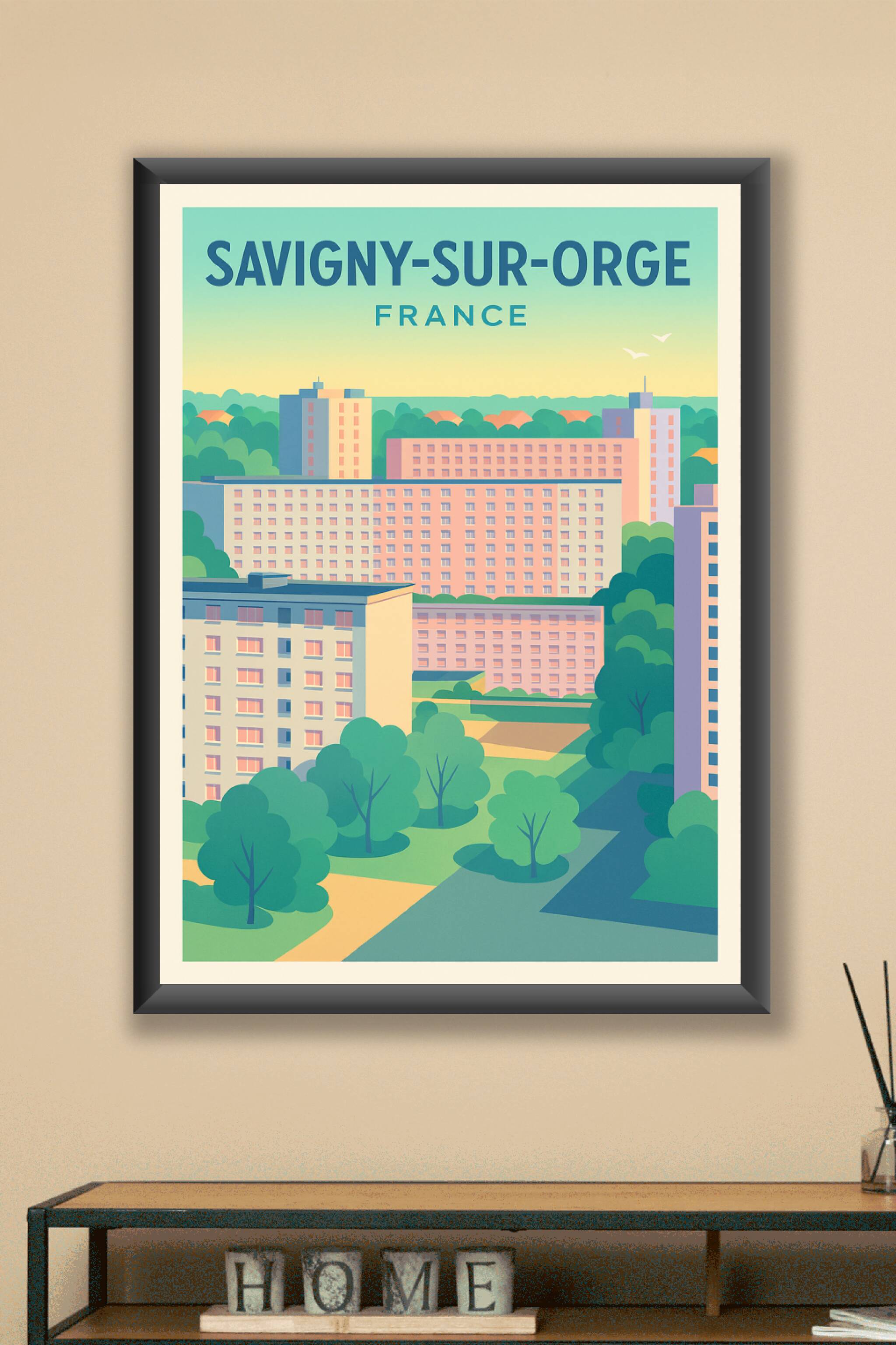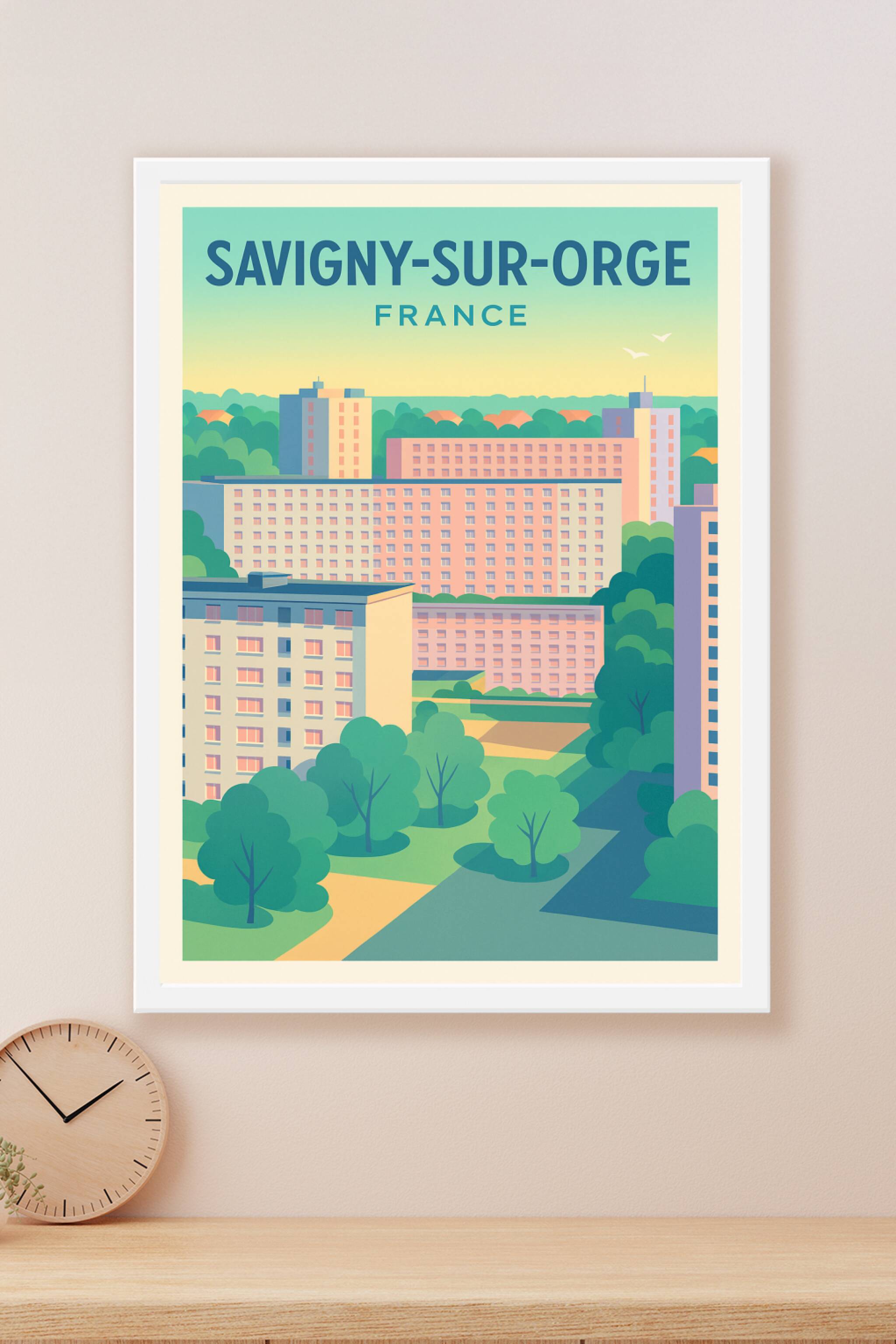 Découvrez une vision apaisante de Savigny-sur-Orge à travers cette affiche stylisée illustrant ses grands ensembles résidentiels baignés de lumière...