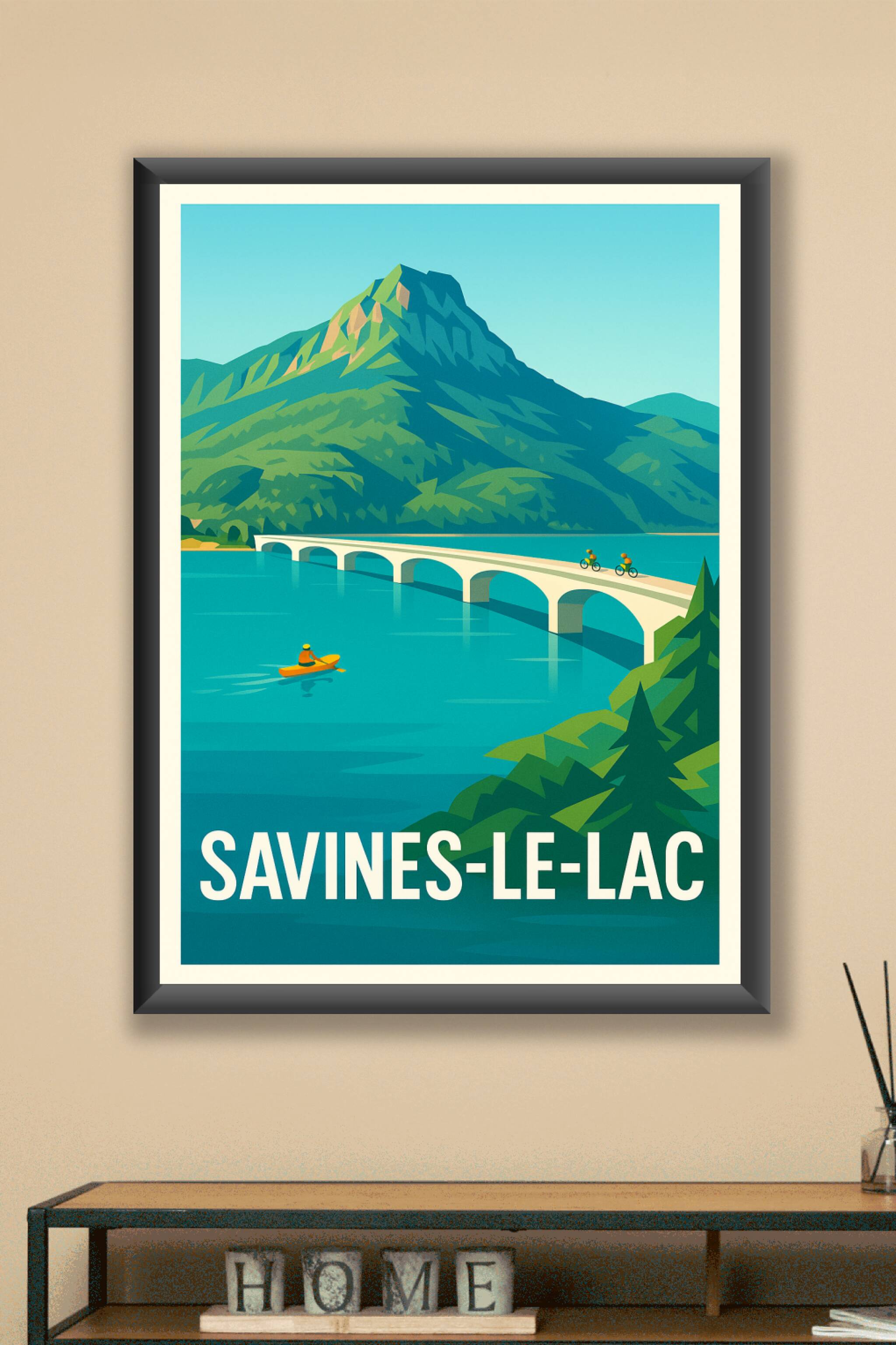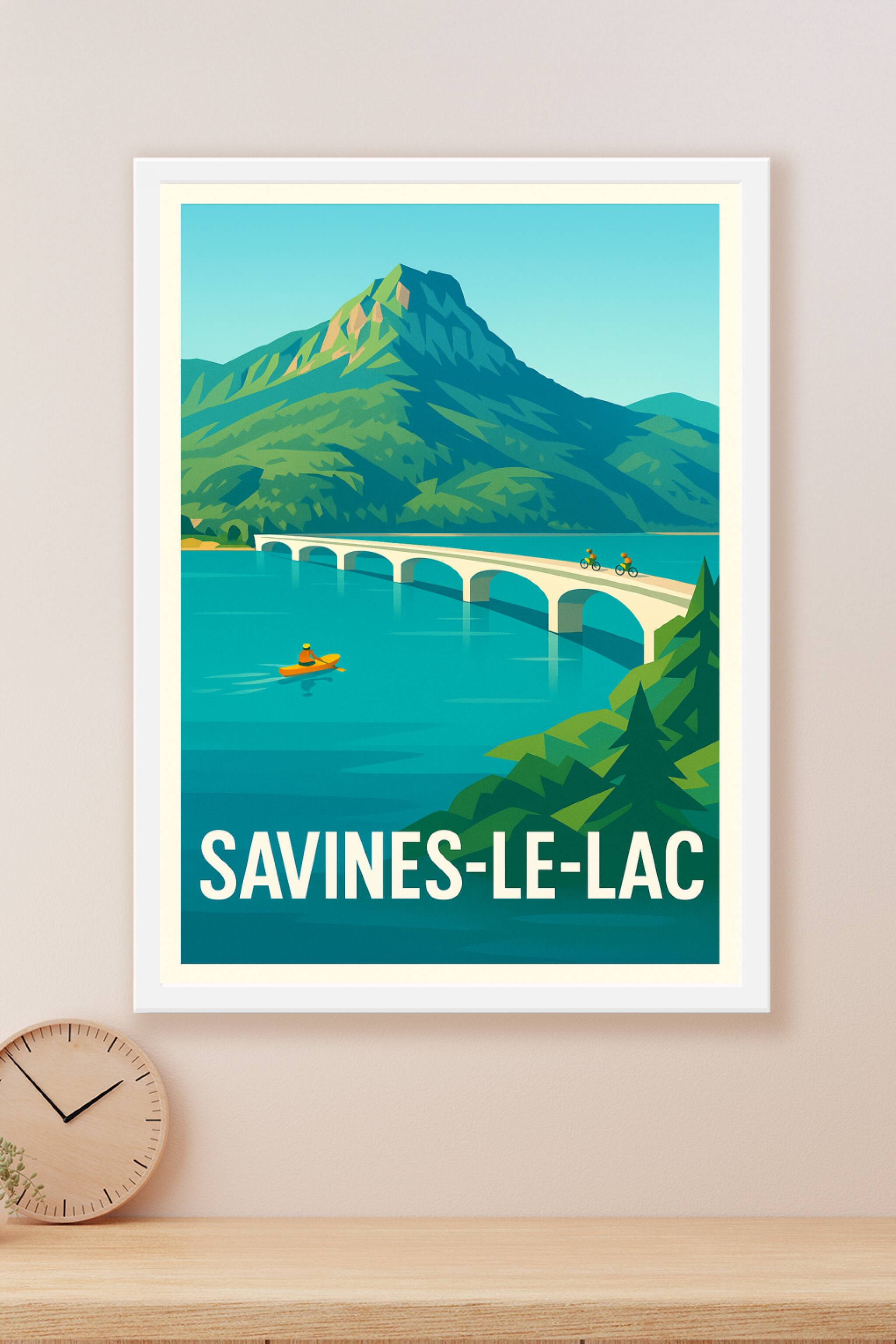 Découvrez la beauté naturelle de Savines-le-Lac avec cette affiche au style graphique rétro mettant en scène le lac turquoise, le pont emblématique...